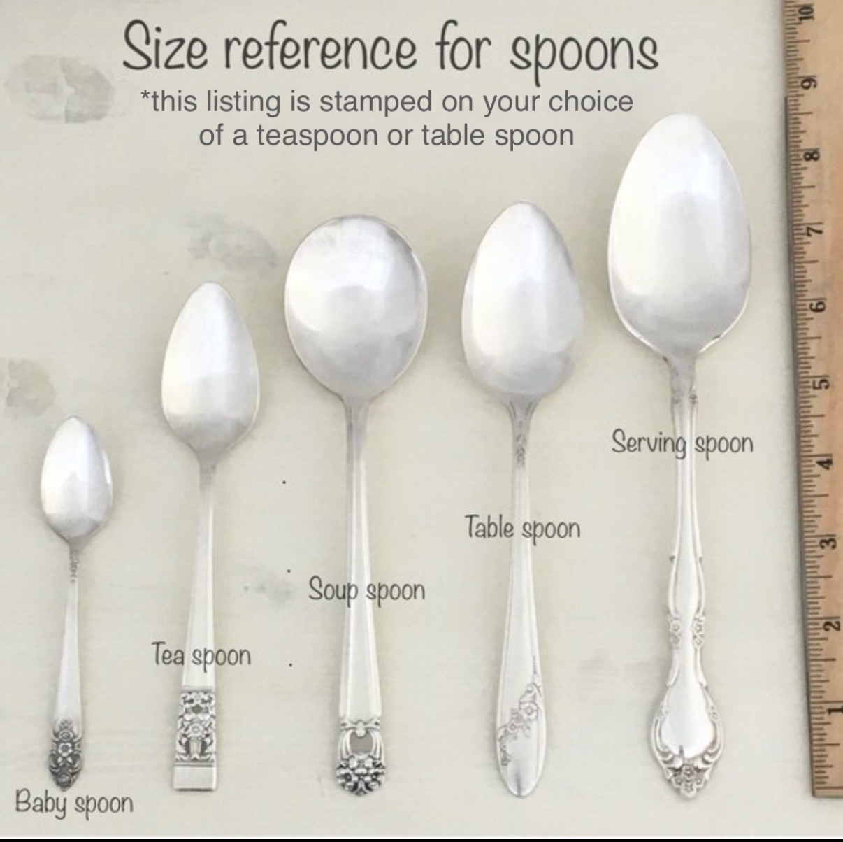 Hand stamping is a very old craft, done with a hammer, anvil and steel stamps. Each letter is hammered individually into the silver. There may be slight variances in the spacing and depth of the lettering. It is intentional and yields a hand crafted, artistic look befitting the vintage silverware. Hammering into the front of the silverware will leave a small mark on the back. This is not a defect, but rather a sign of a well crafted piece — like the knots on the back of embroidery or the stitching on the back of a quilt. I hope you see this and know that every letter on your silverware was lovingly placed there. May it bring joy to your table!