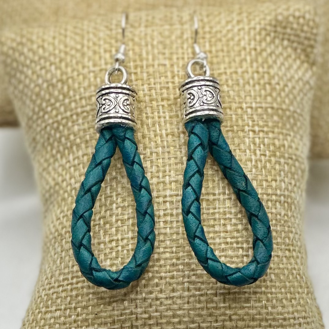 These handcrafted earrings feature a Turquoise braided leather formed into a soft loop and finished with an ornate Silver-tone cap. Lightweight yet bold, they strike the perfect balance between rustic charm and refined detail. the textured leather adds an earthy edge, while the intricate metalwork brings a touch of bohemian sophistication. Ideal for everyday wear with a little wild spirit.