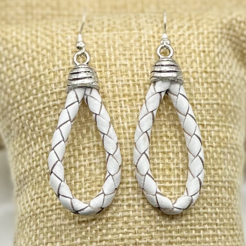 These handcrafted earrings feature a white braided leather formed into a soft loop and finished with an ornate antique brass-tone cap. Lightweight yet bold, they strike the perfect balance between rustic charm and refined detail. the textured leather adds an earthy edge, while the intricate metalwork brings a touch of bohemian sophistication. Ideal for everyday wear with a little wild spirit.