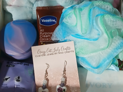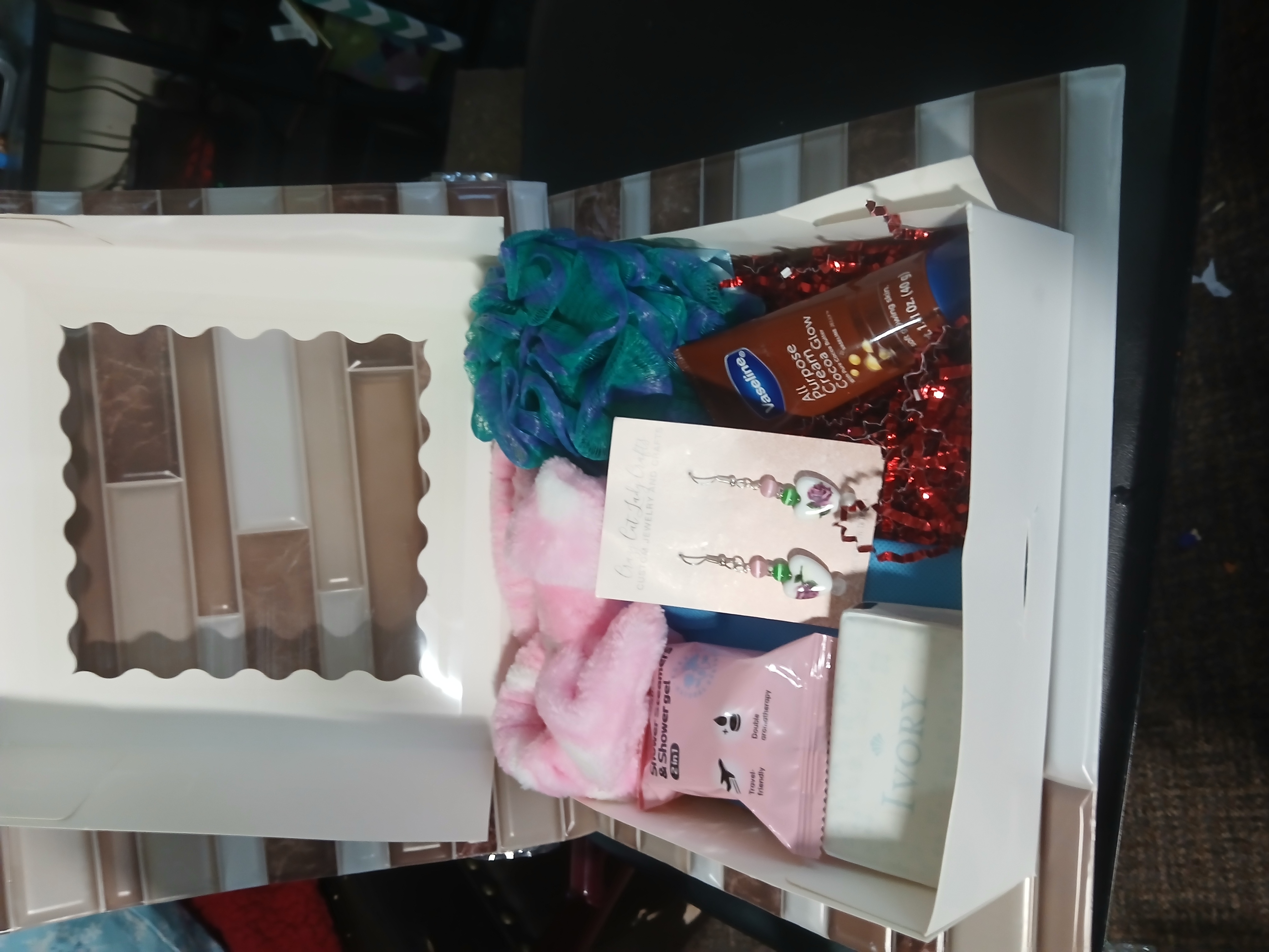 Your Mother or any woman in your life will love this spa in a box, In this box is a spa is a spa headband loofa bar of soap single shower gel and shower steamer both same scent in auromatherapy tube of lotion pair of earrings and a bag to carry it all in