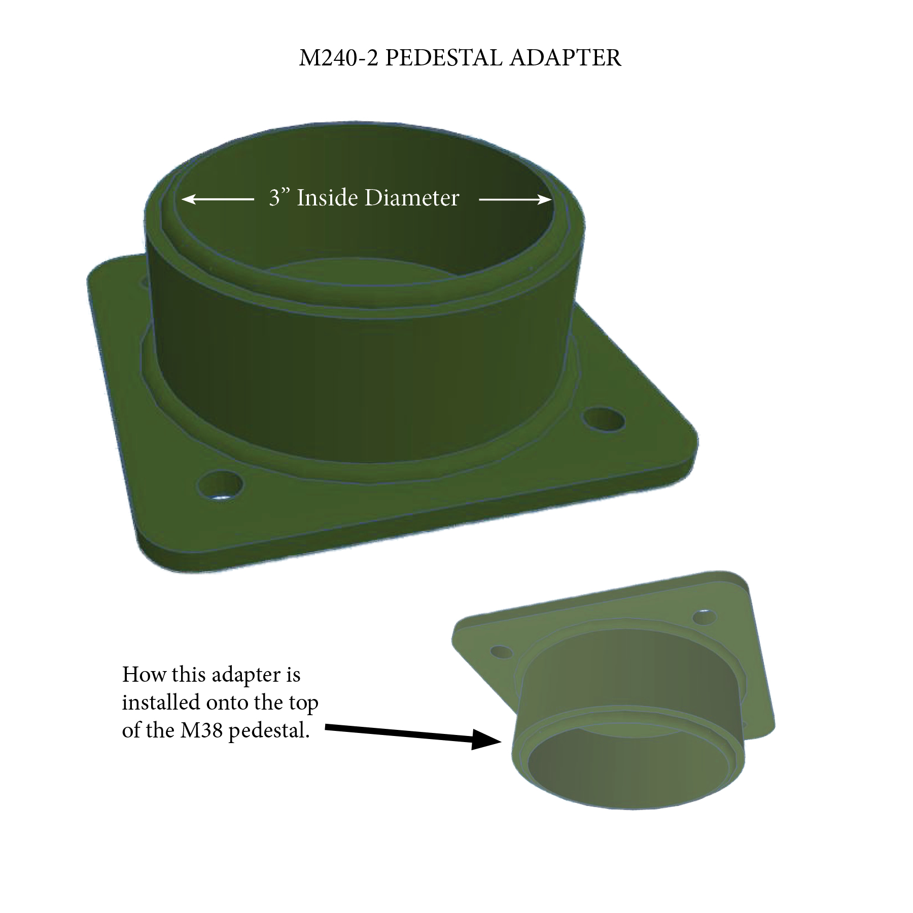 The M38-2 adapts from the 2 1/2" vertical pipe to the M38 Mount Kit standard base plate.