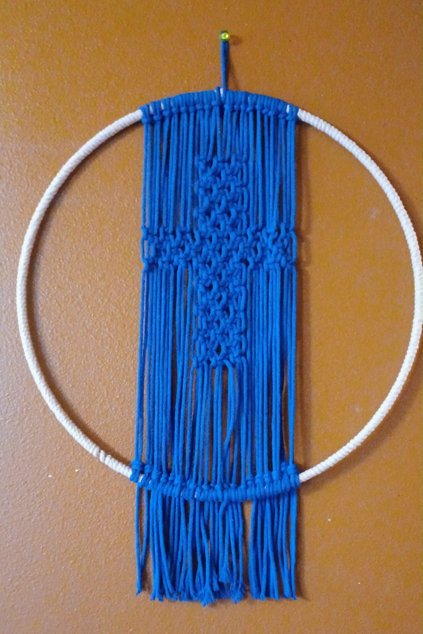 Nutral colored macrame rope wound around a 14" hoop. Blue macrame cord wrapped and knotted to creat a floating cross inside.