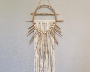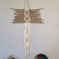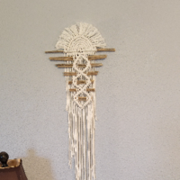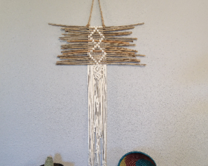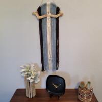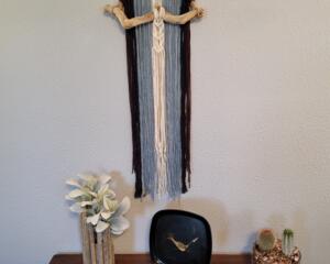 This piece is titled, "Desert Twilight". It is inspired by the be beautiful sunsets I see most days over the White Tank Mountains. The piece is made from a variety of acrylic yarn colors and is a macrame weave design. It is mounted on a piece of saguaro cactus wood.