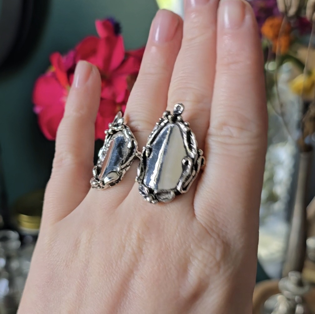Each piece is carved, melted, dripped, and sculpted one at a time by me using jeweler's wax. The wax is then made into a mold and then melted out by pouring molten metal into the mold creating a rough cast of the piece. I then hand polish, nurture, set stones, and occasionally decide what enchantments I think the piece would have. It's been fun musing with my friends and family what kind of magic we would imagine some of these pieces to hold. ♥