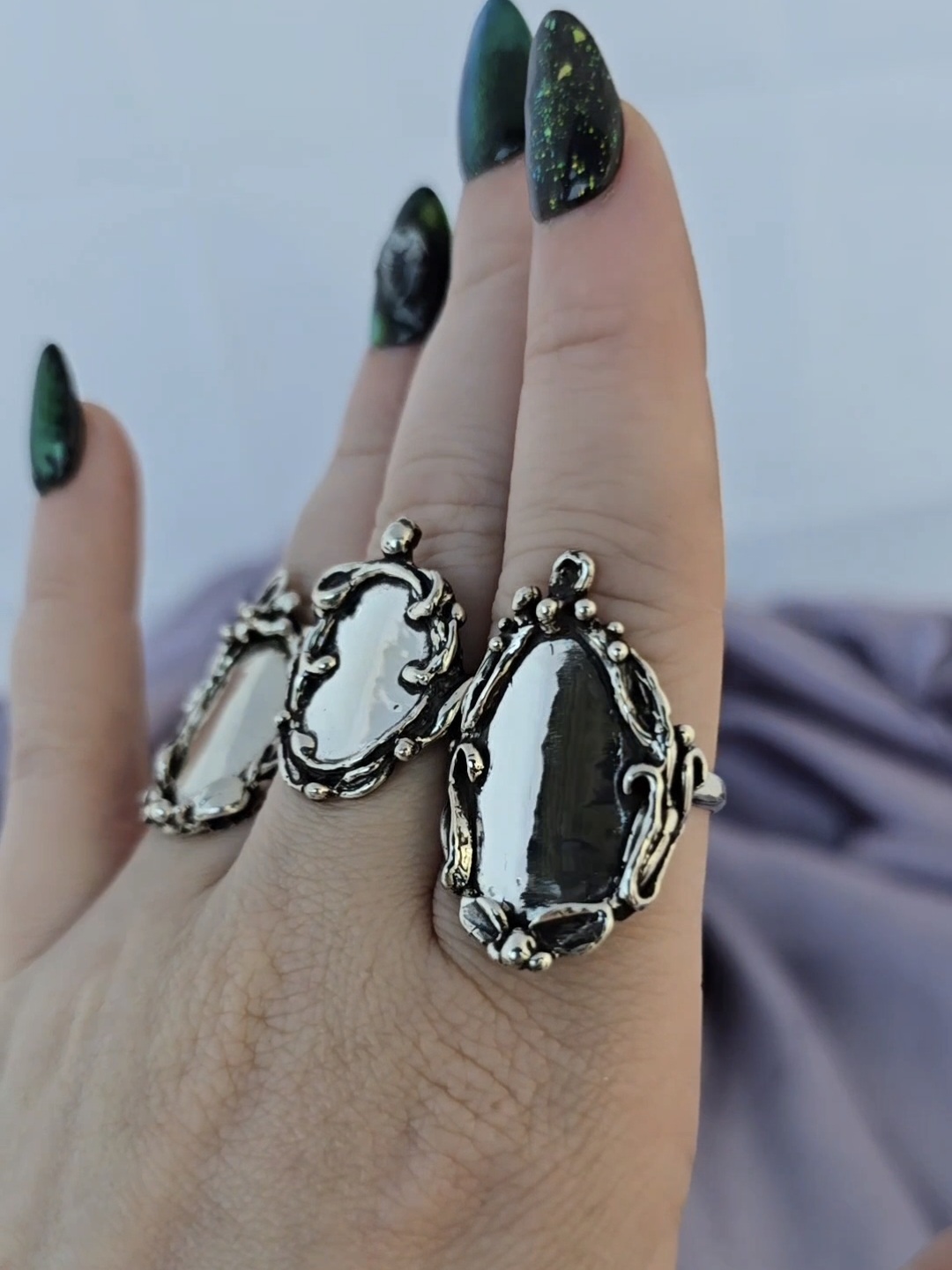These sterling silver rings are designed with the intent of reflecting away negativity, negative energies, bullshit, whatever you want. Every little mirror is a one of a kind with their own unique details in their vintage inspired frames.