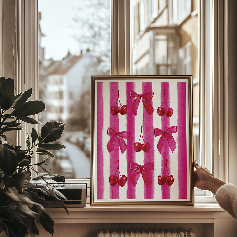 Bring a burst of playful charm to your walls with this adorable cutecore art print! Featuring juicy, pink cherries and sweet bows playfully painted over bold, magenta stripes, this design is the perfect blend of girly and chic.