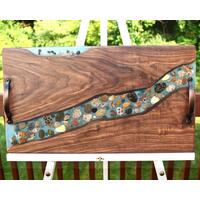 A handmade black walnut magnetic knife holder with an epoxy resin river of silver mist - a beautiful practical addition to your kitchen. Measures 17" x 11" with 2 walnut stands for a spectacular display on your countertop. Food safe hard wax oil is rubbed in and buffed to an amazing smooth finish on front and back. A continuous line of neodymium magnets well hidden in the black walnut wood holds your knives safe and securely. Custom orders available in a variety of sizes, wood and epoxy resin colors.
