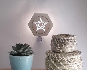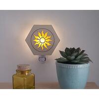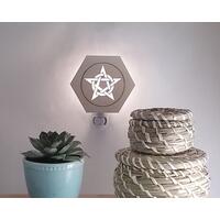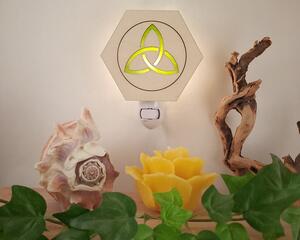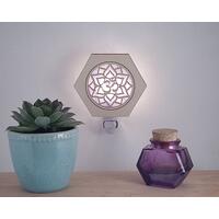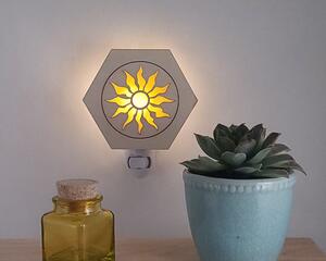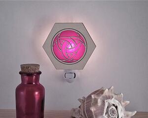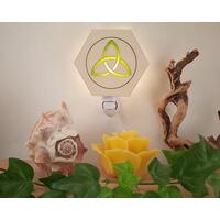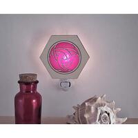 Lasered Wood and Glass Night Lights. Hexagon shaped wood with opaque colored glass insert and night light base. Handmade in the USA.
