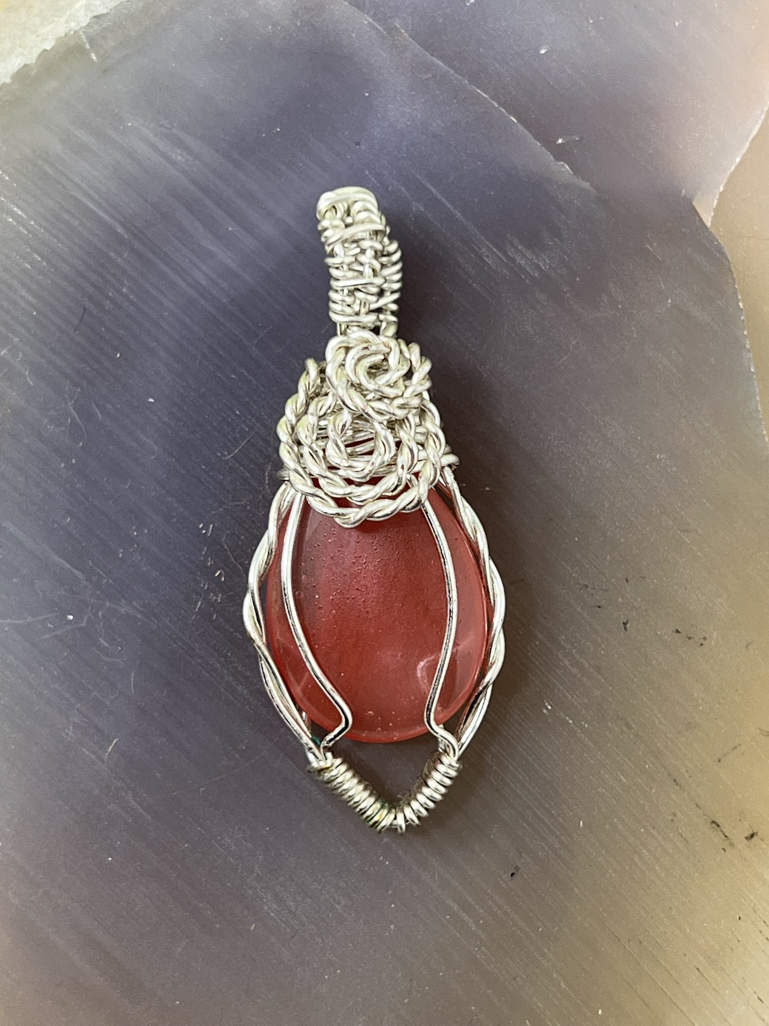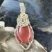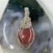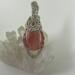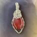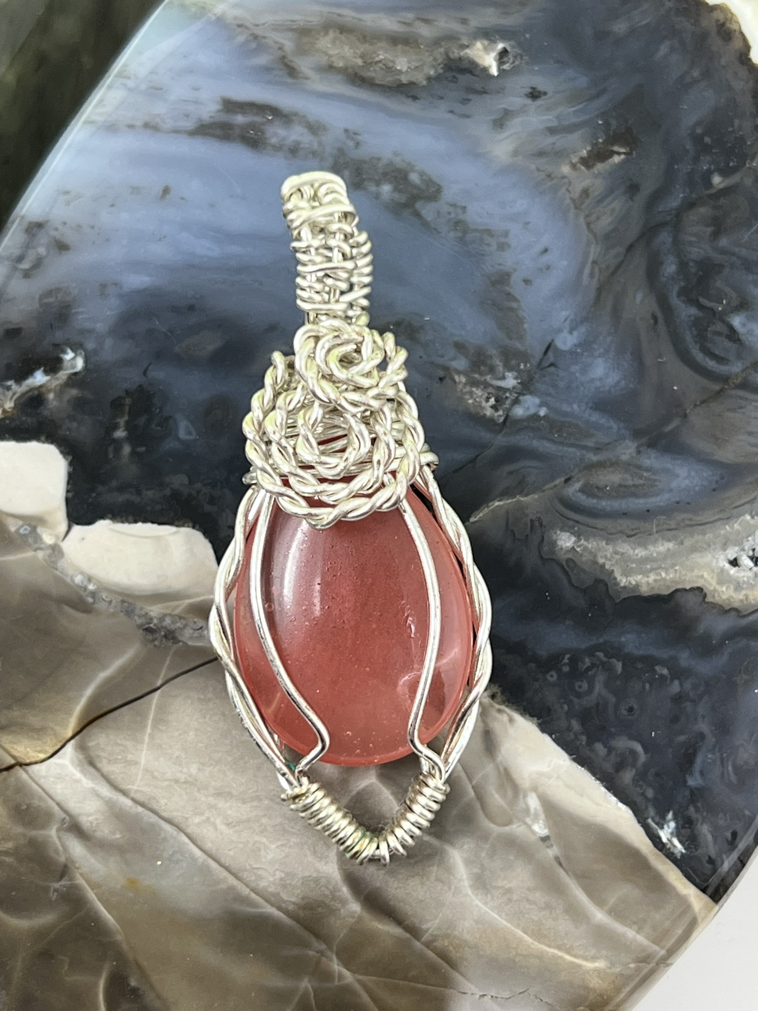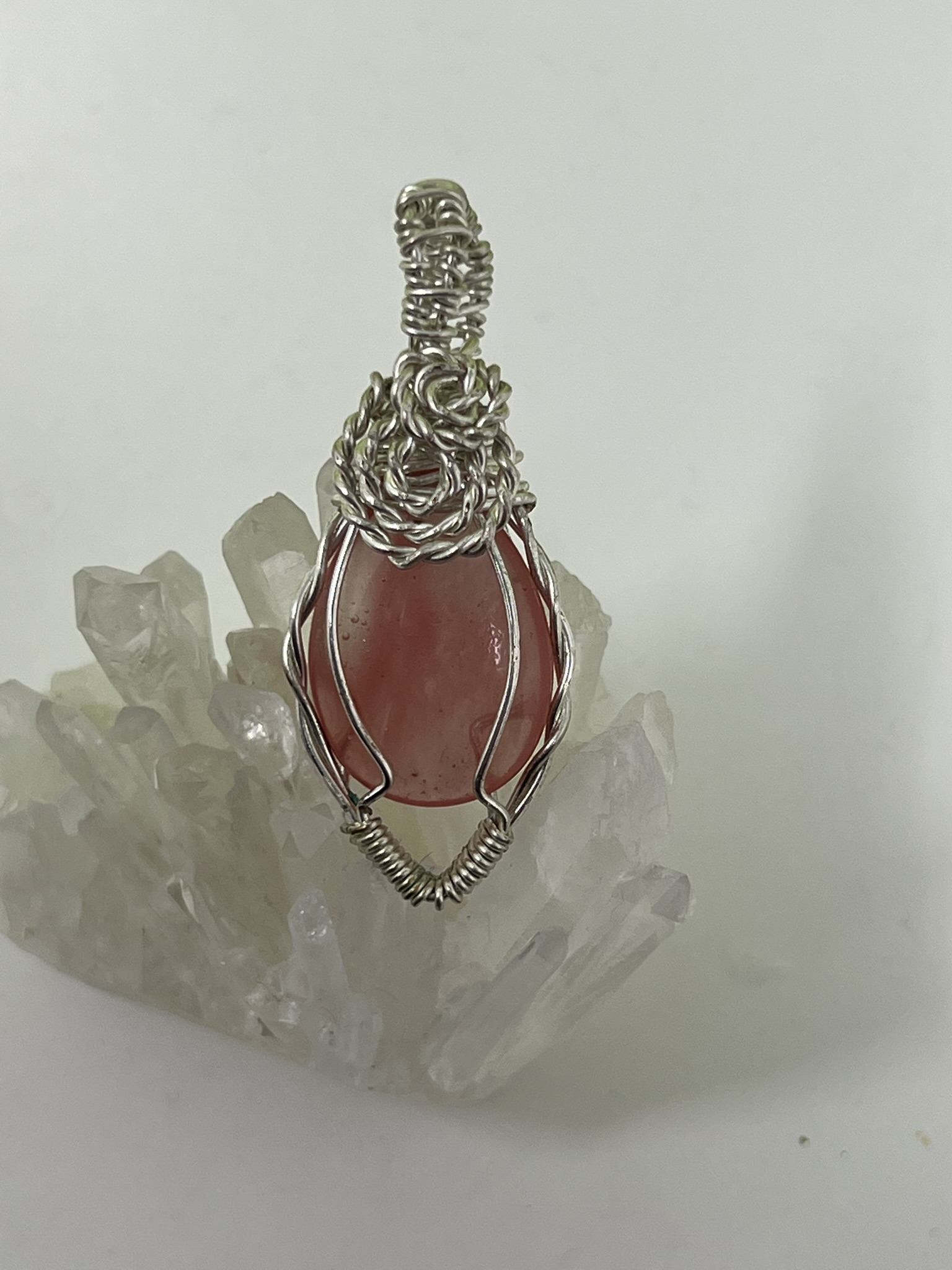 This unique pendant features a manmade cherry quartz cabochon that has been wrapped in silver colored copper wire. "Cherry Quartz" is actually glass that is made to look like stone. I created this piece by taking 4 pieces of 20 gauge silver colored, copper wire and connecting them at the bottom with a piece of 24 gauge silver colored, copper wire. Each side of the pendant has 2 of the 20 gauge wires twisted together to make the pendant have a unique frame. The bail is made by weaving a piece of 24 gauge wire over 2 pieces of the 20 gauge wire. The swirl details at the top of this pendant are done by twisting 2 pieces of wire together and turning them in on themselves for each swirl. This piece is handmade in Minnesota.