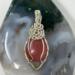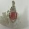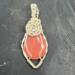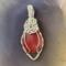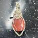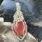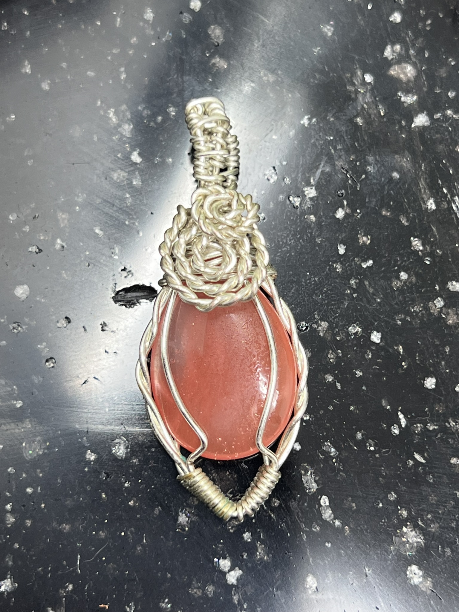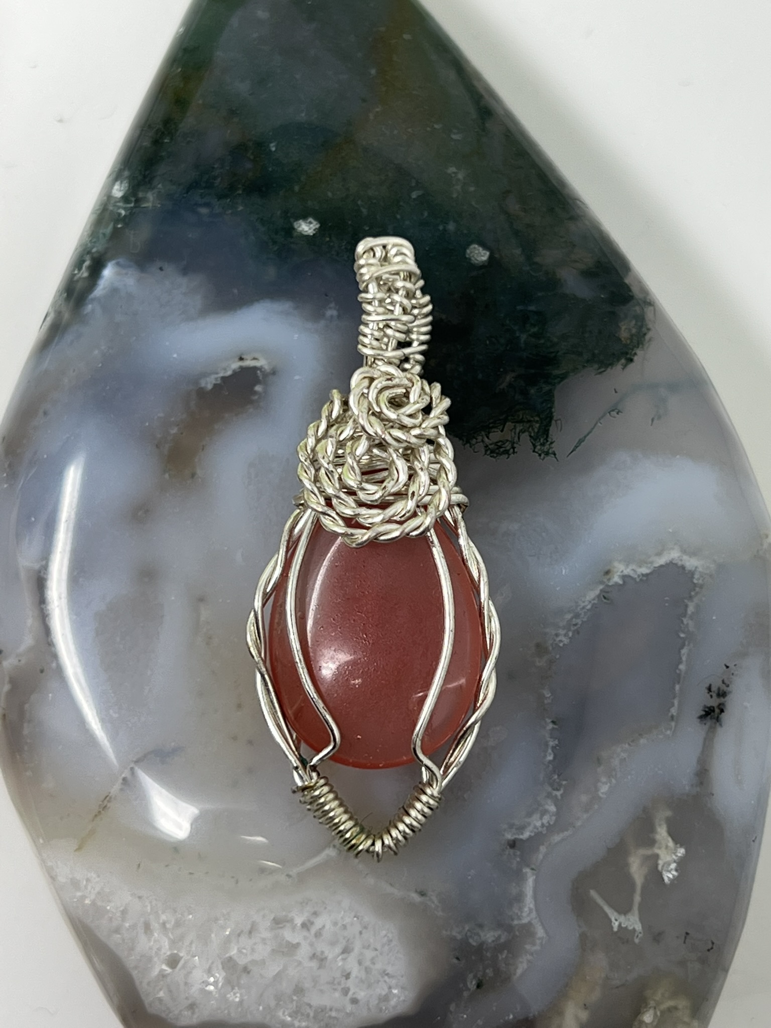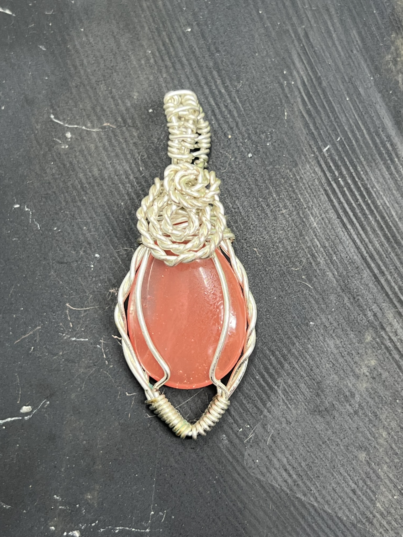 This unique pendant features a manmade cherry quartz cabochon that has been wrapped in silver colored copper wire. "Cherry Quartz" is actually glass that is made to look like stone. I created this piece by taking 4 pieces of 20 gauge silver colored, copper wire and connecting them at the bottom with a piece of 24 gauge silver colored, copper wire. Each side of the pendant has 2 of the 20 gauge wires twisted together to make the pendant have a unique frame. The bail is made by weaving a piece of 24 gauge wire over 2 pieces of the 20 gauge wire. The swirl details at the top of this pendant are done by twisting 2 pieces of wire together and turning them in on themselves for each swirl. This piece is handmade in Minnesota.