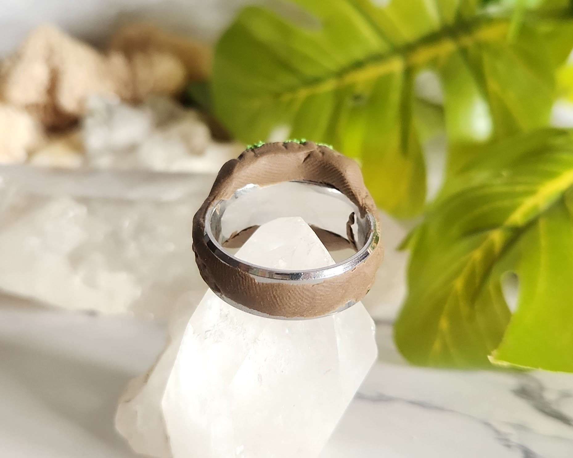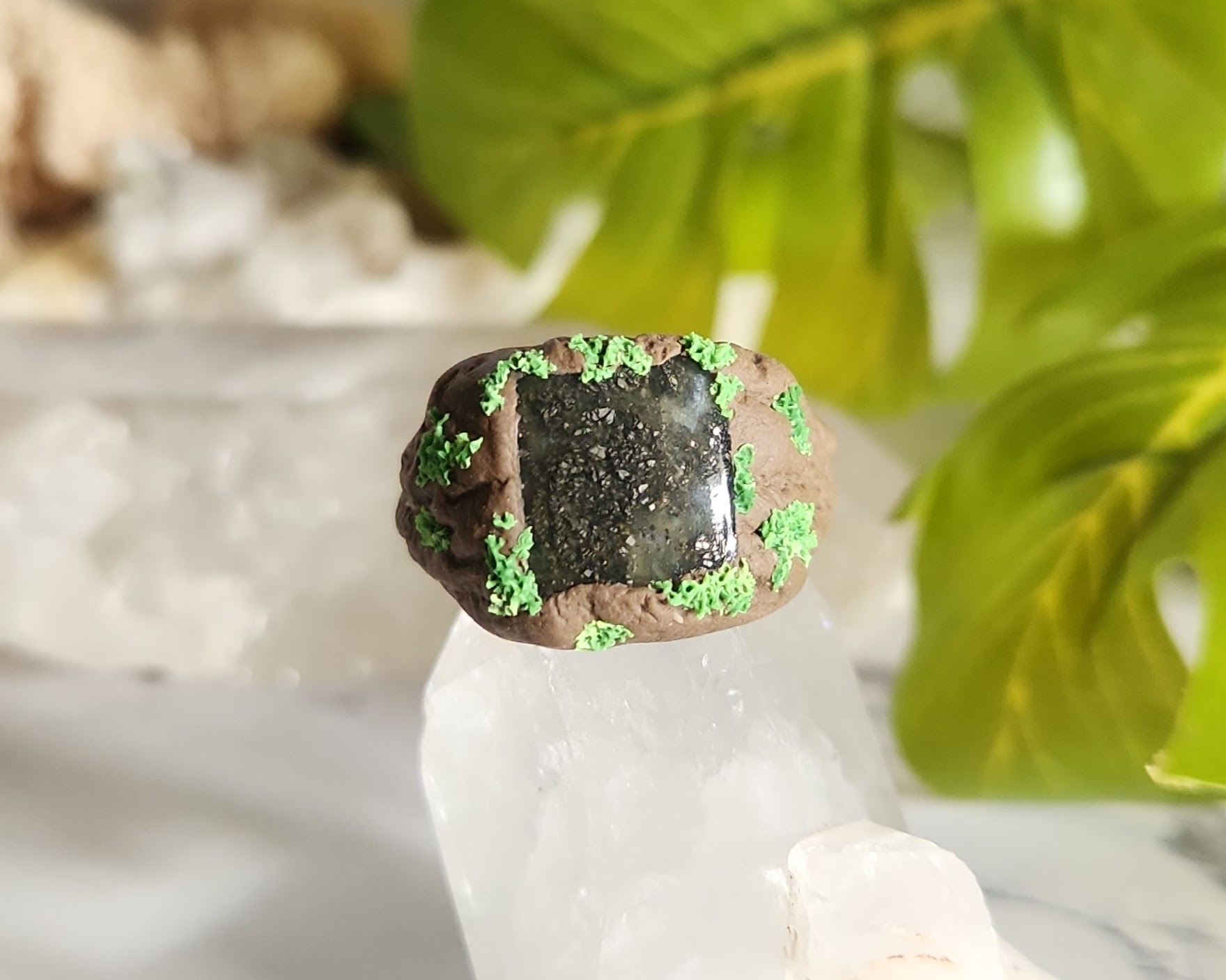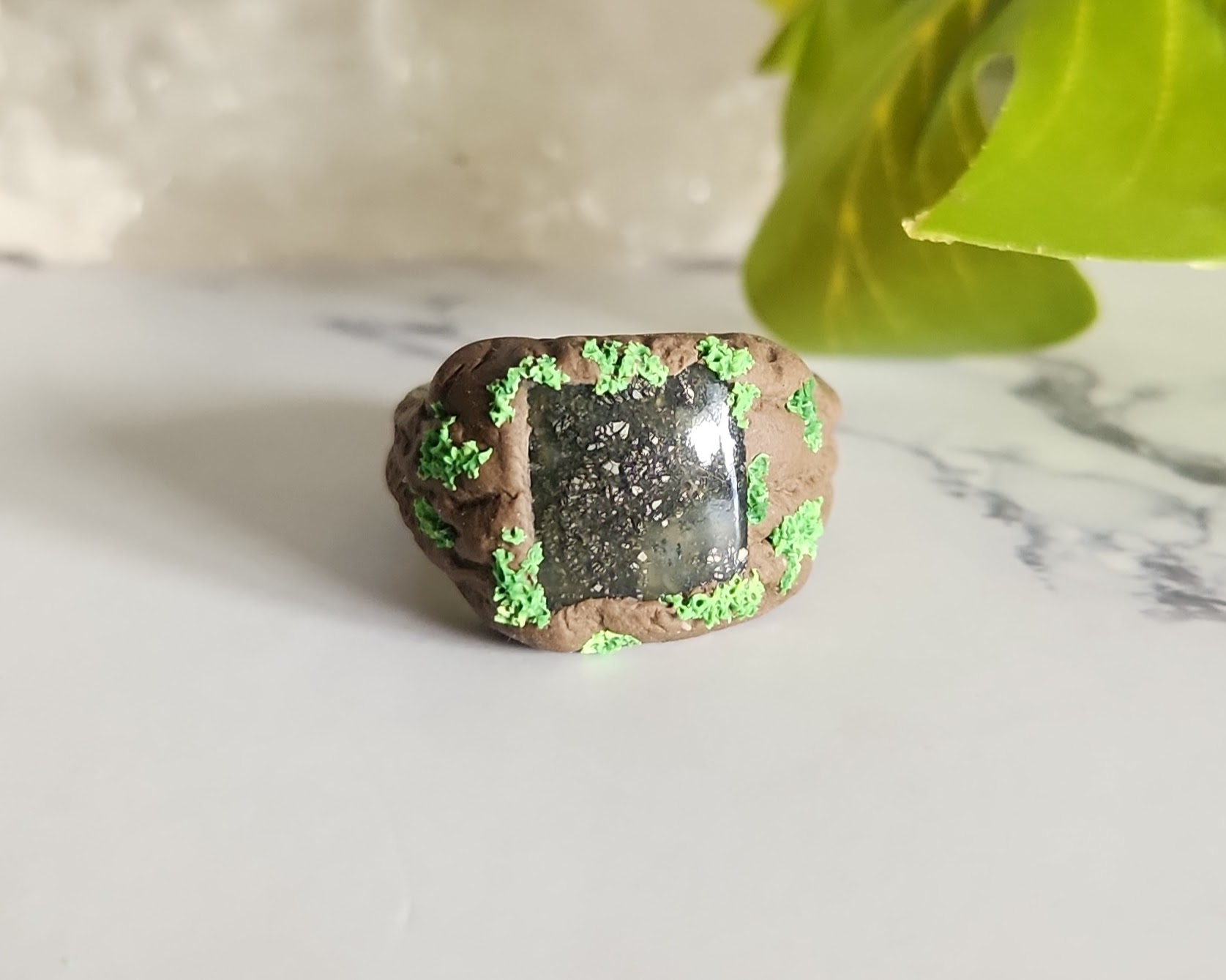 This ring carries the charm of something unearthed from deep within the earth; an understated treasure with natural character and grounded energy. Set on a sturdy Stainless Steel band, the design features Polymer Clay details that mimic a tree root, with soft green “moss” touches that give it an organic, woodland inspired feel. At its center sits a striking Marcasite gemstone, known for its metallic shimmer and quietly powerful presence.