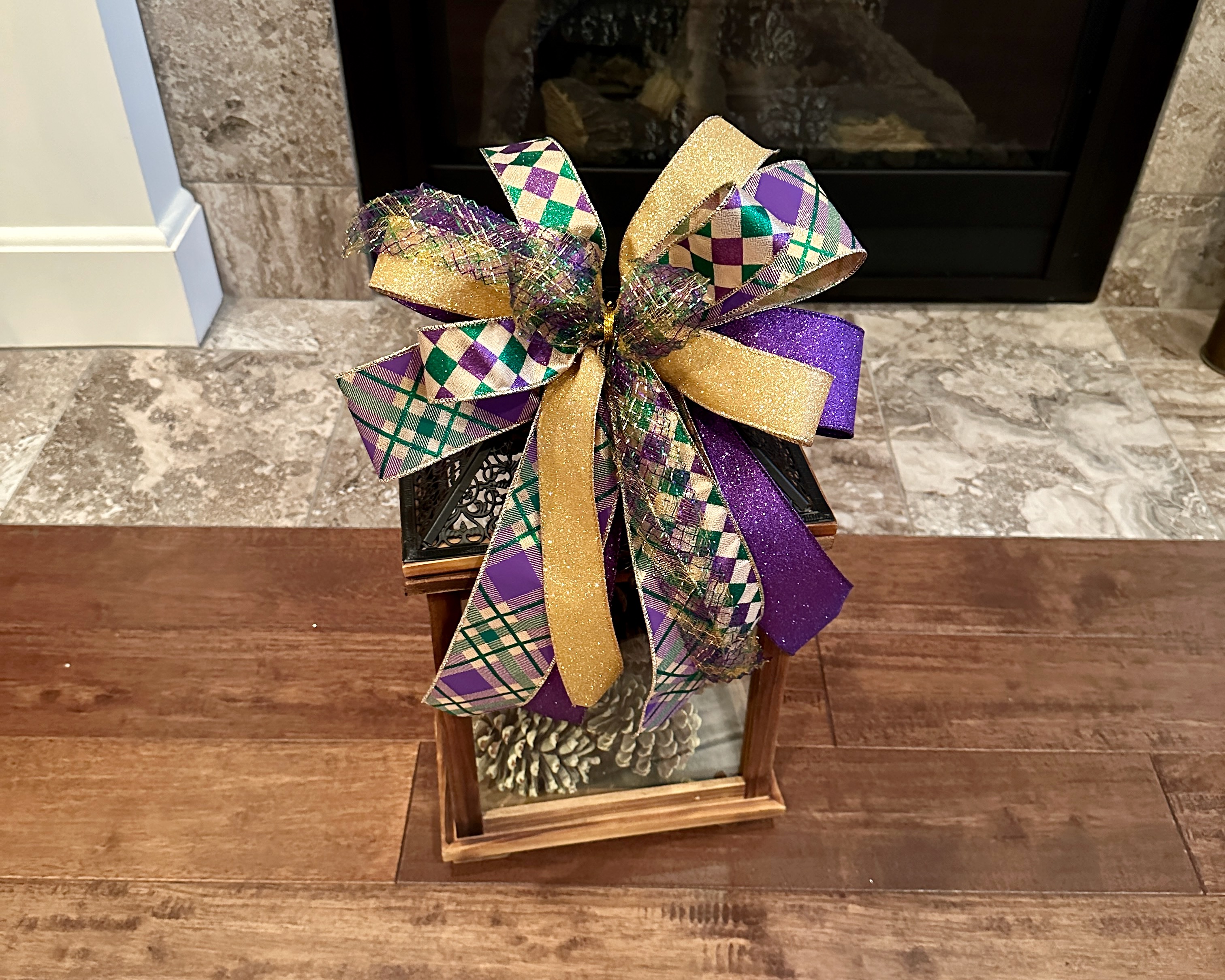 This Mardi Gras purple, gold and green wreath bow decoration with ribbon tails is full of glitter and glam. This large bow is perfect your own wreath, lantern, lamp or light post or bannister.