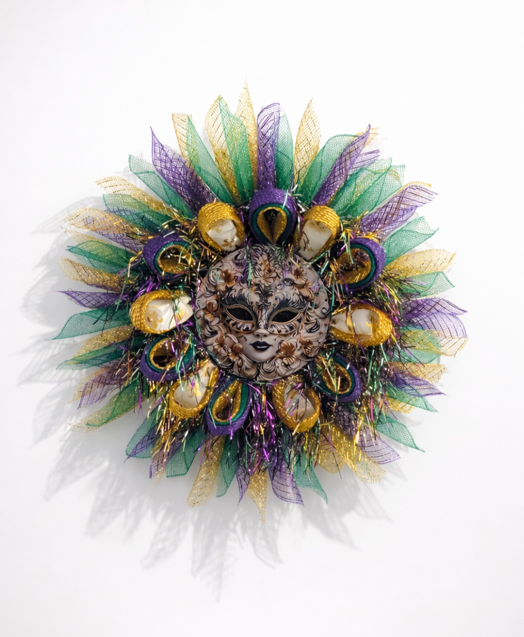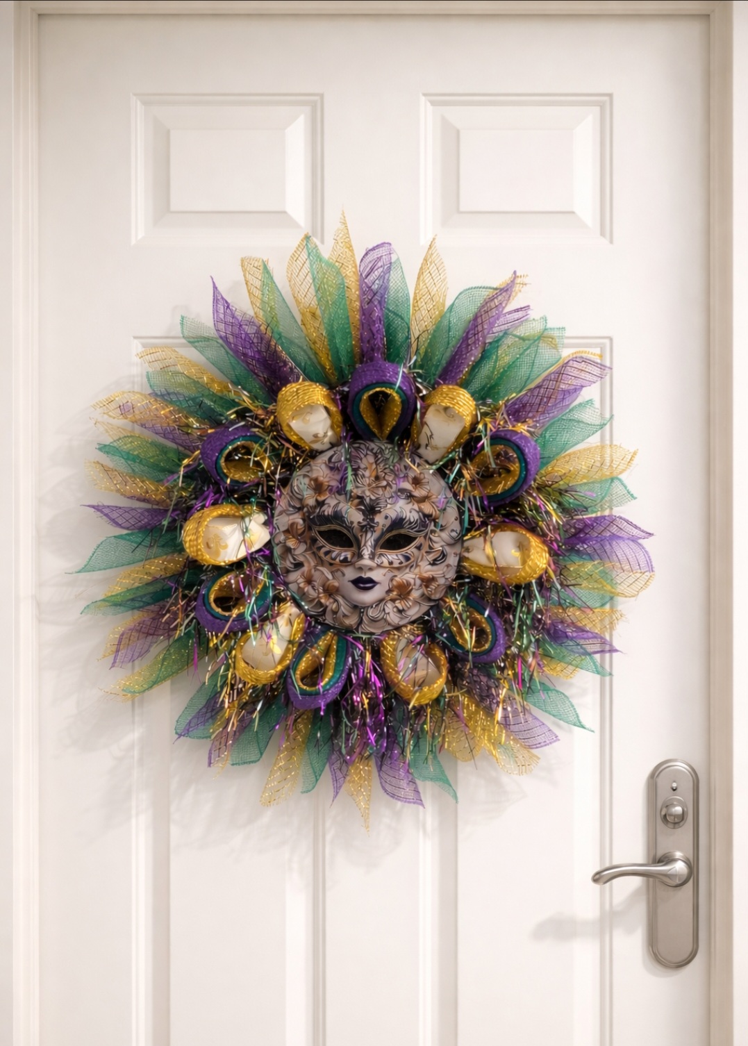 Make a bold statement this Mardi Gras season with this handcrafted Mardi Gras mask wreath, featuring an elegant Venetian-style mask surrounded by vibrant purple, green, and gold mesh ribbons.