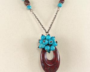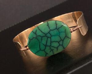 Moss agate beads in shades of teal, green and blue are linked by wire wrapping to form a necklace with copper clasp.