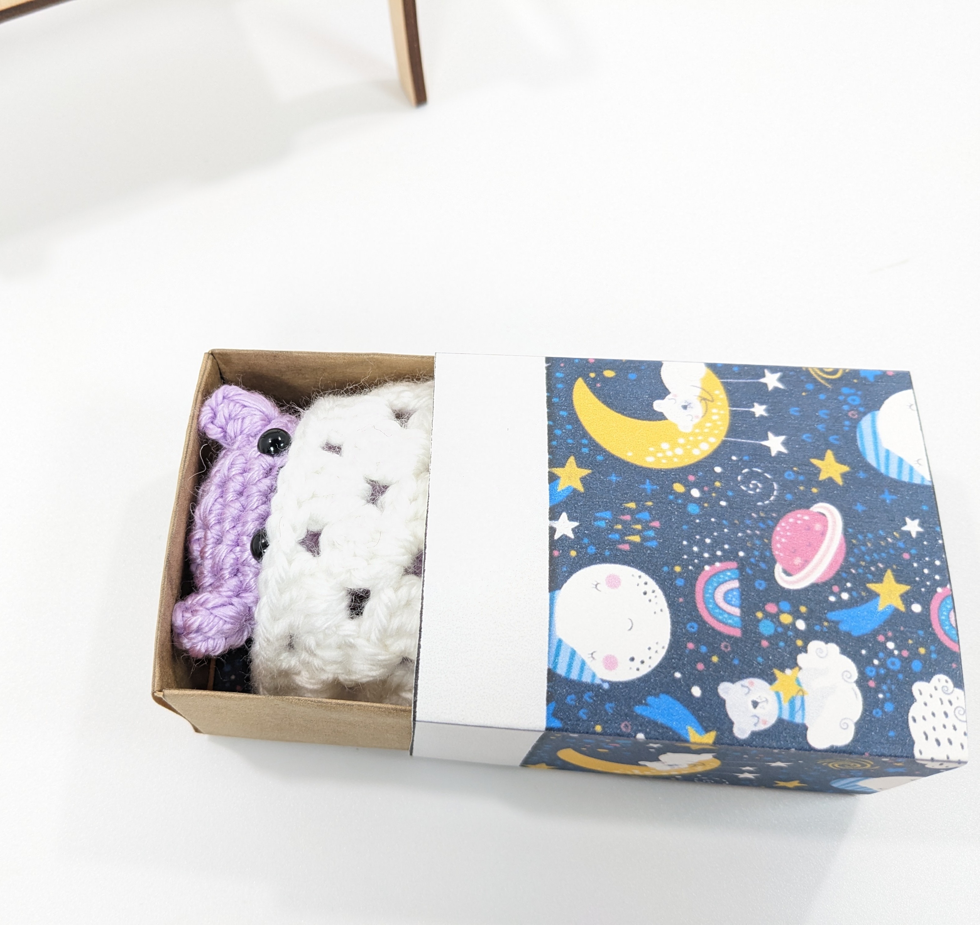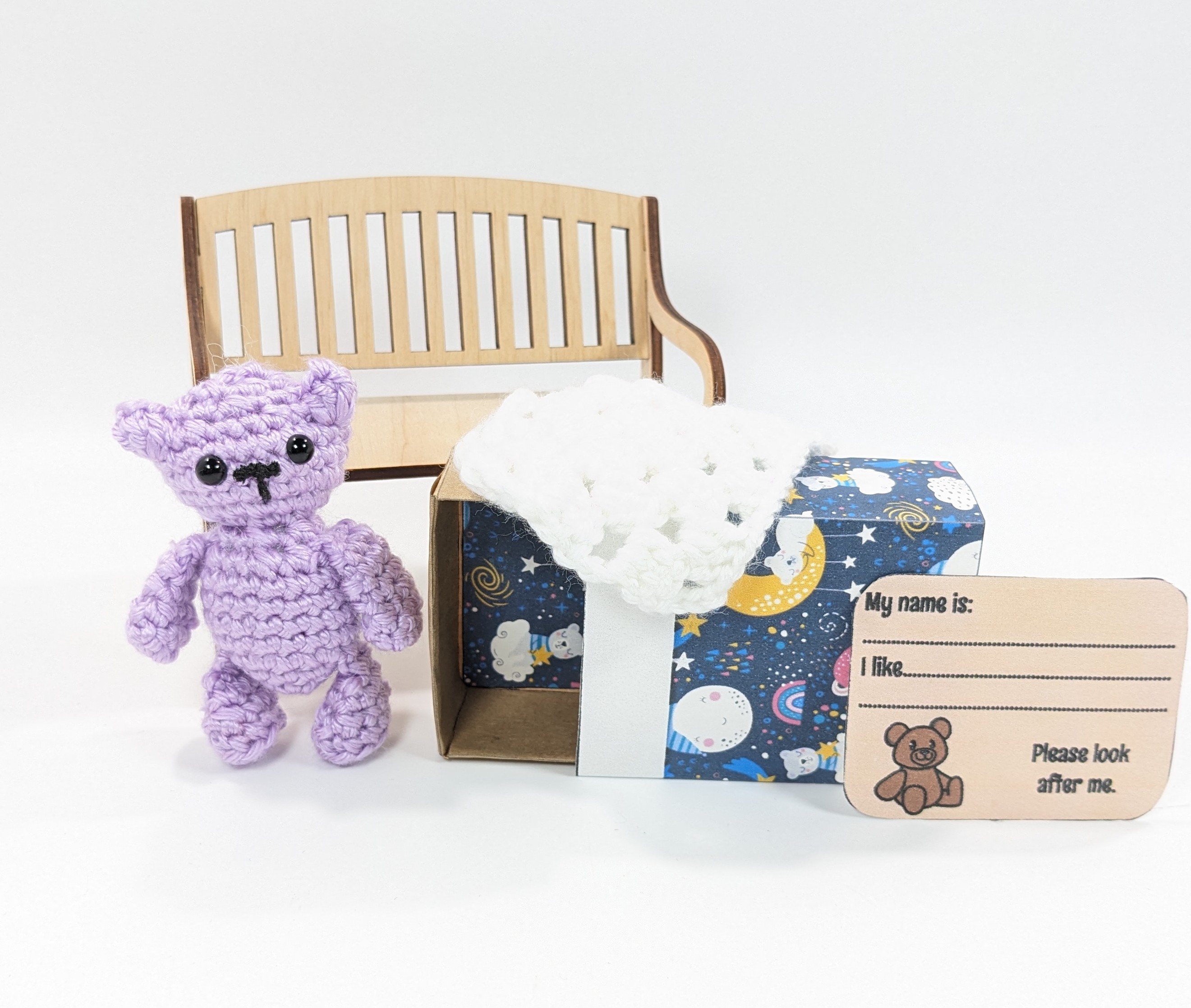 Also this cute Matchbox Mini Lavender Teddy is hand crochet with acrylic yarn and has tiny plastic safety eyes (not recommended for children 3 and under). The box is made with cardstock.
