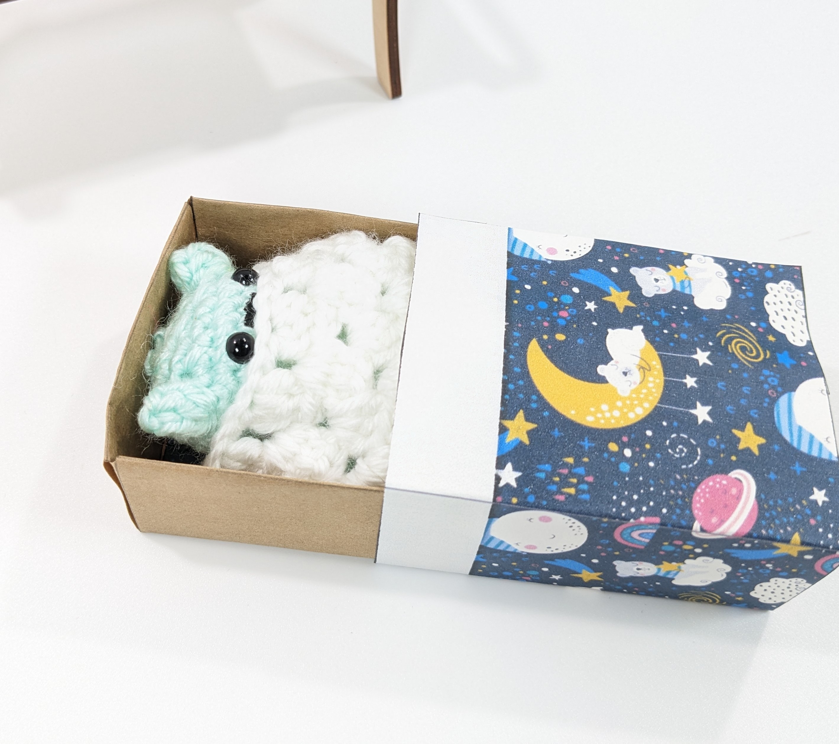 The matchbox is made with cardstock. Also the bear is crochet with acrylic yarn and filled with fiberfill. I also used very tiny plastic eyes.