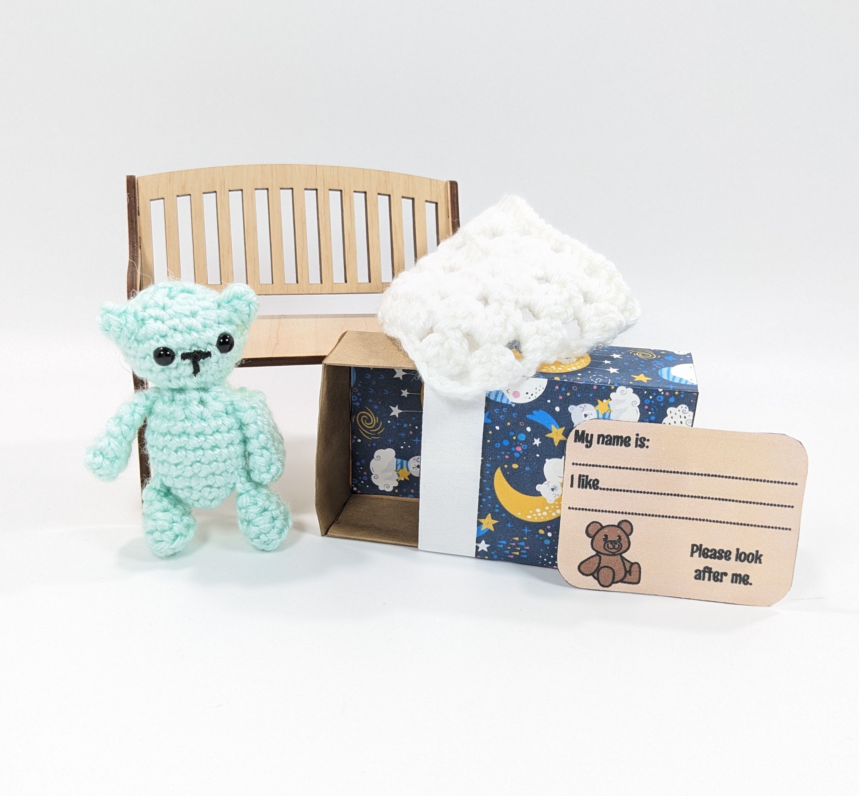 Also this cute Matchbox Mini Light Green Teddy is hand crochet with acrylic yarn and has tiny plastic safety eyes (not recommended for children 3 and under). The box is made with cardstock.