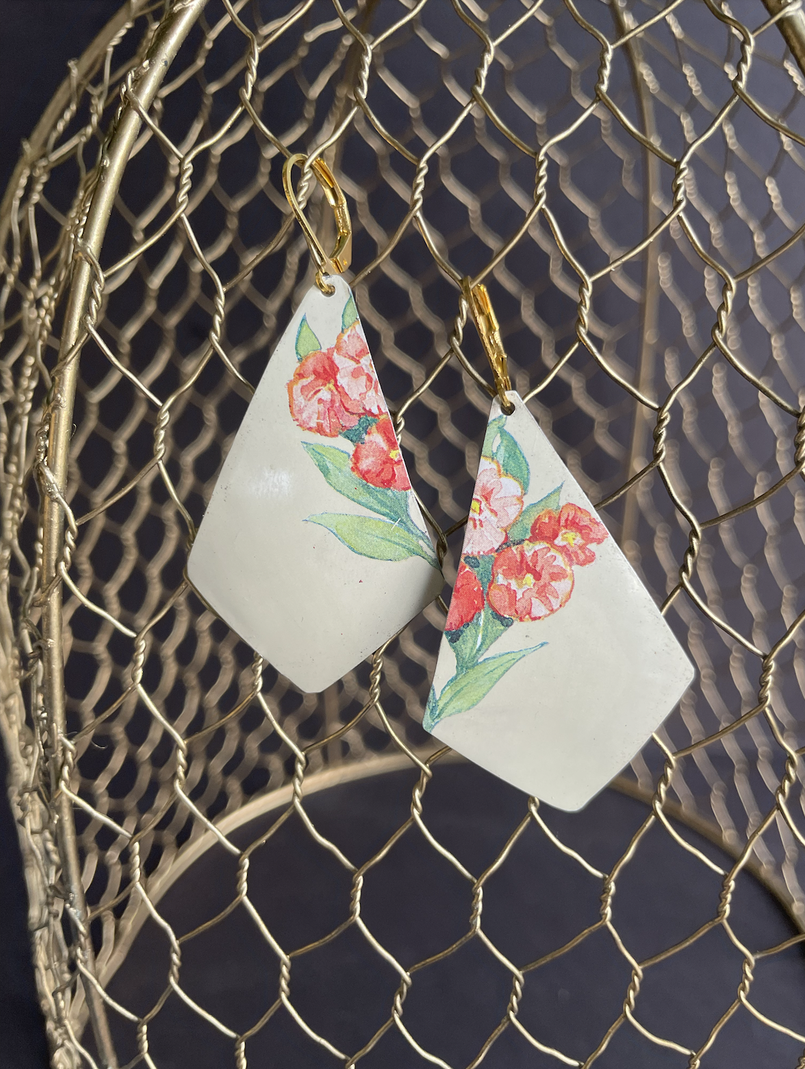Tins are very light making them ideal for earrings as they don't weigh down your ears as the day goes on. Did you know the proper term for working with tin is "tinkering"? That made me really happy. I literally tinker in my art studio! I use old cookie tins, tea tins, and the like, break them down, and hand cut them into shapes and hand-hammer them into the 3-D shape I want them to be, finish and polish them, before putting them together like any other jewelry.