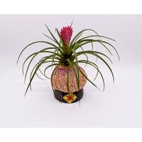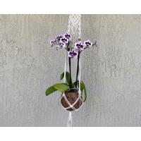 Unique display with coconut shell and macrame. This one of the kind bohemian pieces will enhance the look of any room.