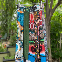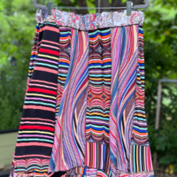 Materials are all upcycled fabrics, taken from pre-loved party dresses, palazzo pants, and all matters of fun. They’re all stretch velvet, likely containing spandex. Garments used will never be stained or excessively worn. My skirts have exposed serged seams which only add to the character.