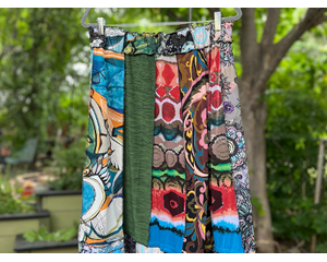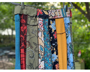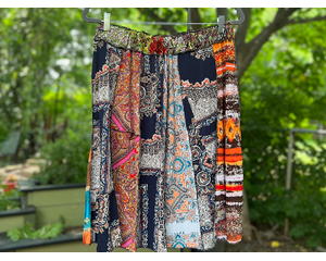 I love thrifting and going to estate sales. While shopping, I look for funky knits I can restyle into my one-of-a-kind, sustainably created skirts. I wash and dry the clothing I use using a high quality detergent, cut out the pieces, patchwork them together using a serger, and add a soft wide elastic waistband to come up with my unique creations.