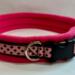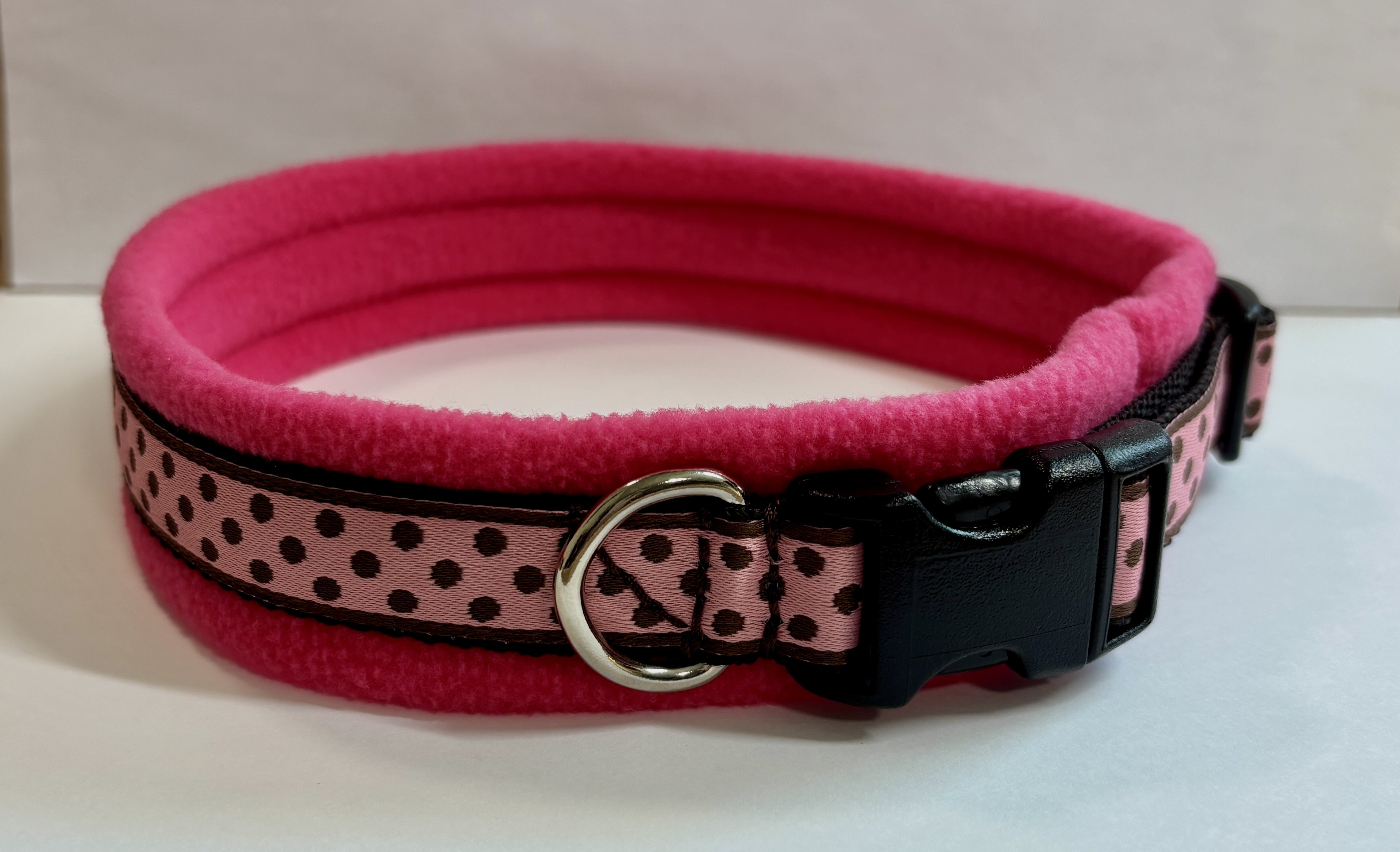 I will need a measurement from you (see below). Made from 3/4" (20mm) width sturdy webbing, padded with very soft fleece (this makes the finished collar approx. 1.4" (35mm) wide. The padding goes all the way behind the buckles and D ring, completely protecting your dogs neck from rubbing. Collars are adjustable upwards from the neck size, by 2 inches (when adjusted, the lengthened section is not padded).