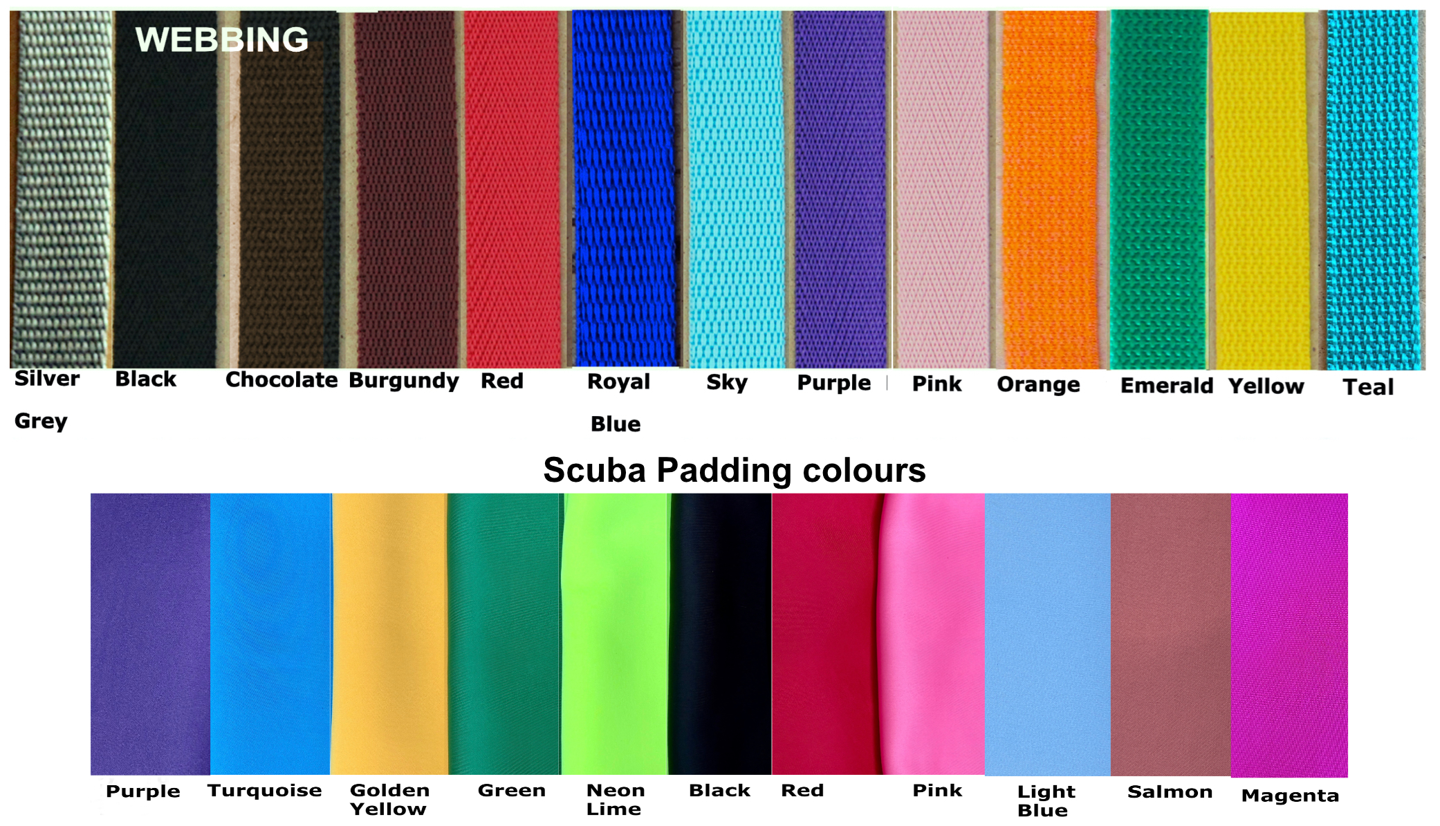 .Collars are adjustable upwards from the neck size, by 2 inches (when adjusted the lengthened section is not padded). The padding goes all the way behind the buckles and D ring, completely protecting your dogs neck from rubbing.Many collar colours available. Choose 1 webbing colour and 1 padding colour from the drop-down menus (see 2nd photo for colours).