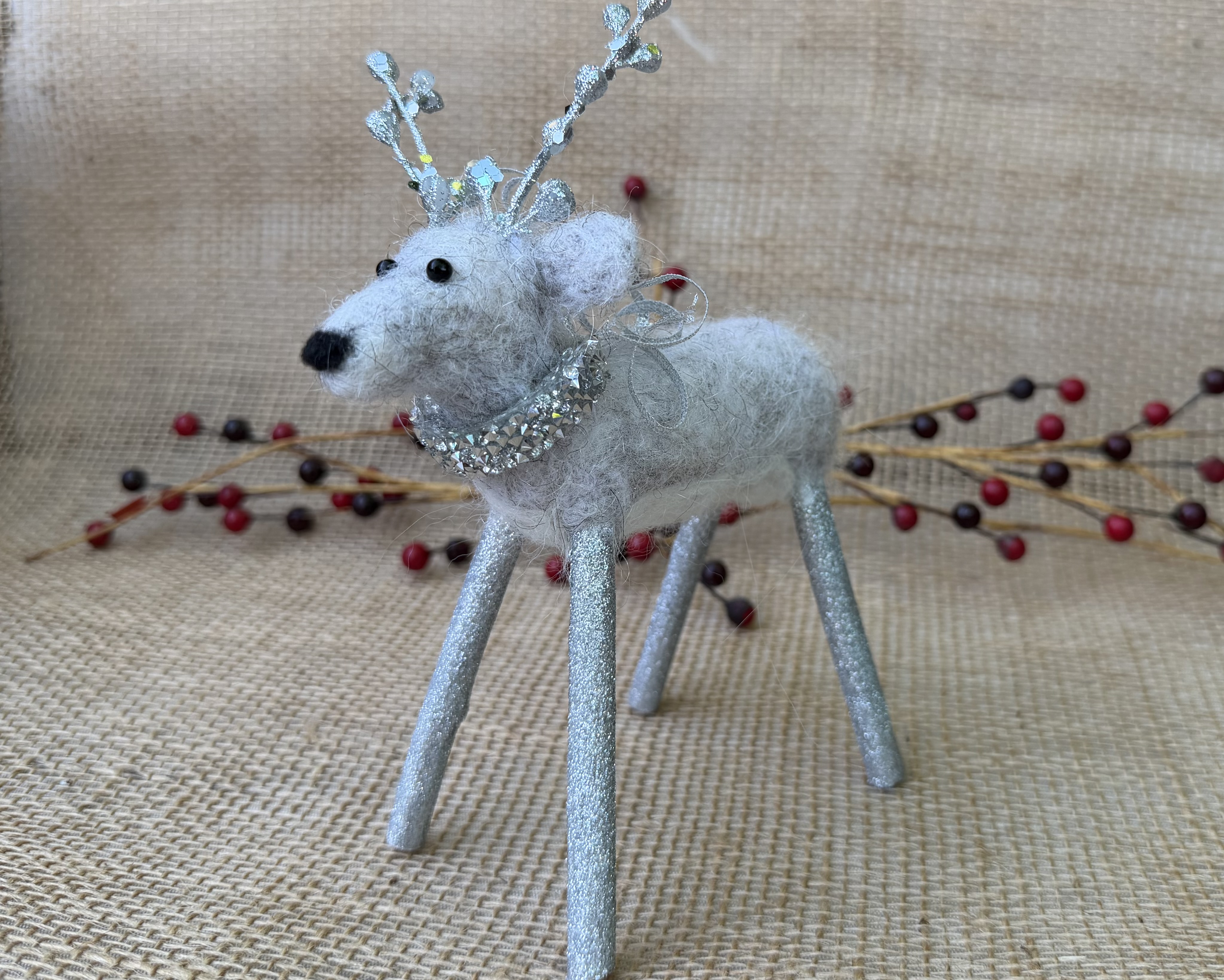 Meet Crystal, a delightful petite needle felted white reindeer brimming with winter wonder. Lovingly handcrafted from soft alpaca wool, Crystal features delicate frosted antlers and a stunning glittery snowflake draped elegantly around her neck like a shimmering collar. Her compact size makes her perfect for smaller spaces, bookshelves, or nestled into holiday vignettes as a younger reindeer. Each detail is carefully sculpted by hand, creating a sweet expression and graceful stance. Crystal's enchanting charm and sparkling accessories make her an ideal gift for reindeer collectors or anyone who treasures handmade holiday magic.