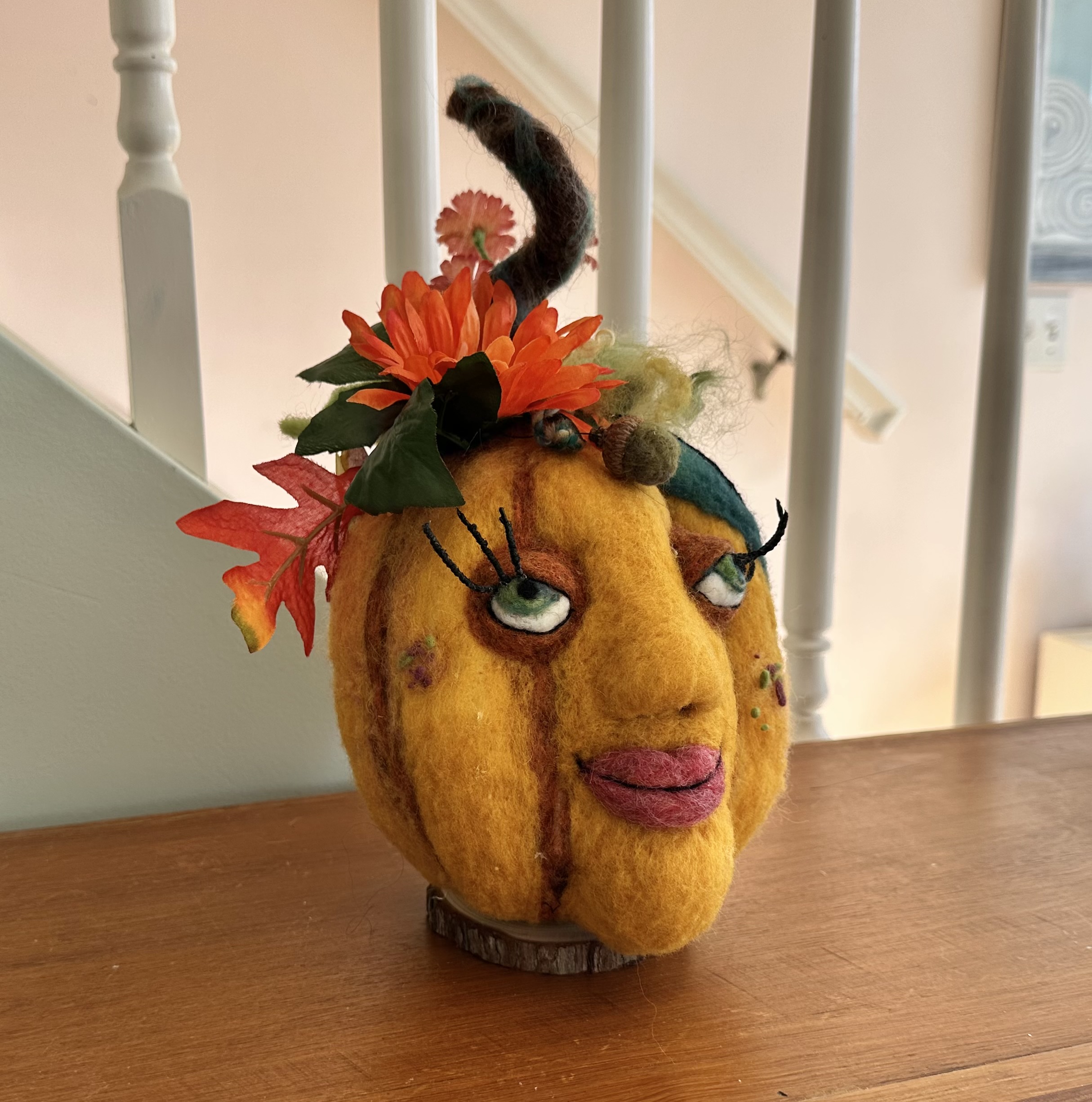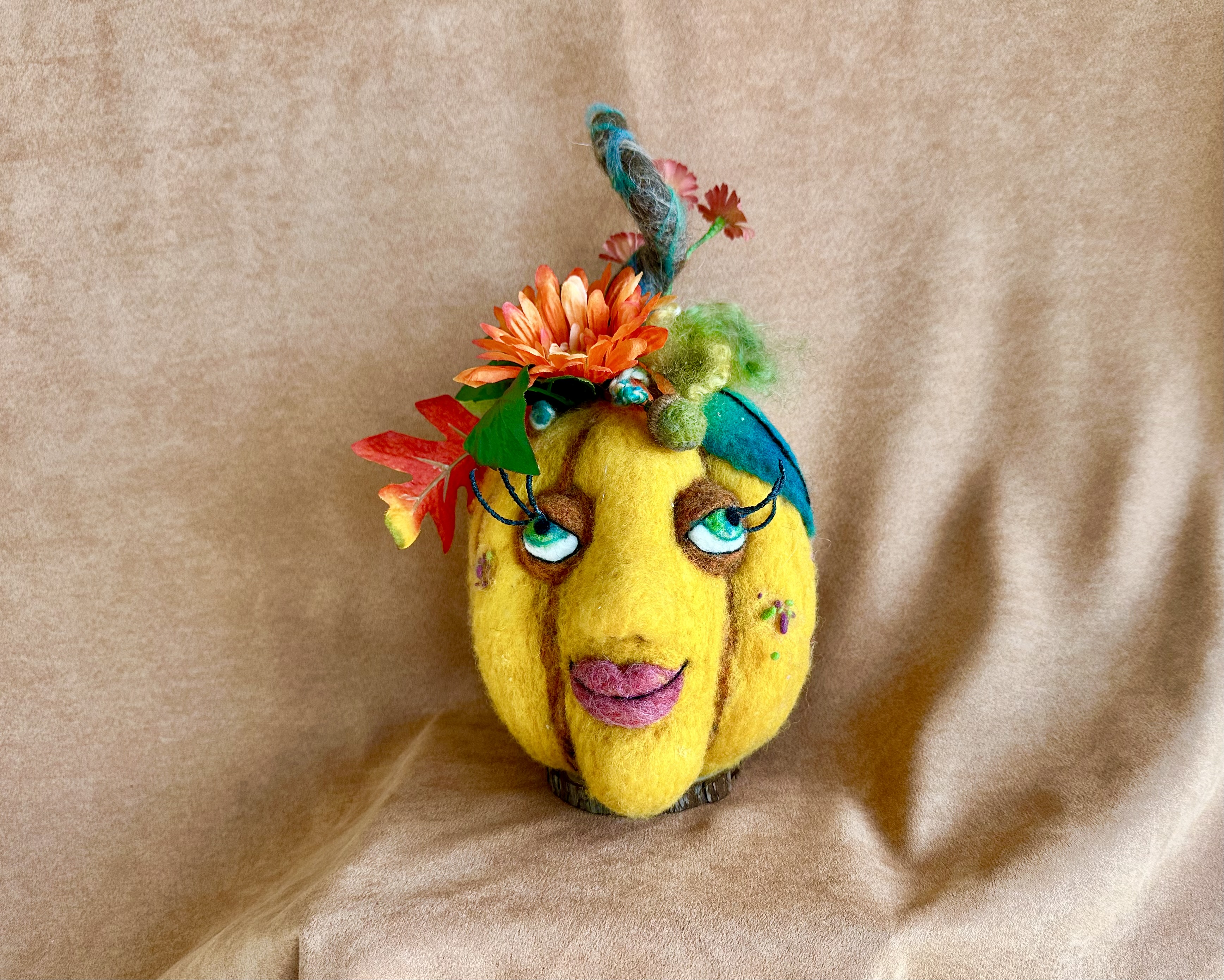 This unique Halloween decoration tells the story of one extraordinary pumpkin who transformed herself from patch reject to show-stopper. Crafted entirely from premium wool roving, Hattie features silk autumn blossoms, leaves, and acorns adorning her spectacular hat, plus those signature long eyelashes that make her unforgettable.