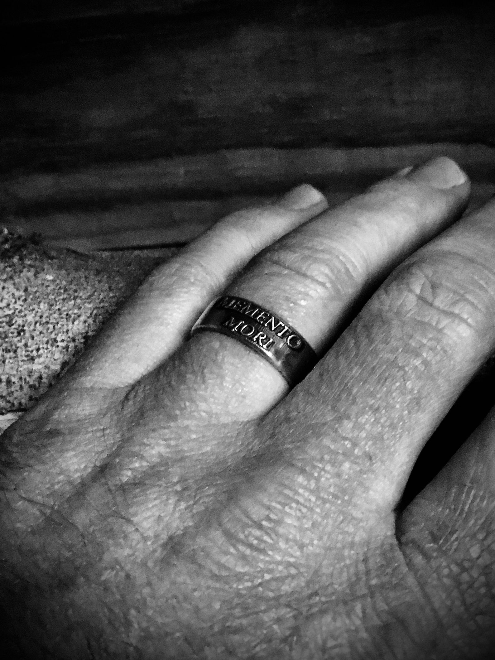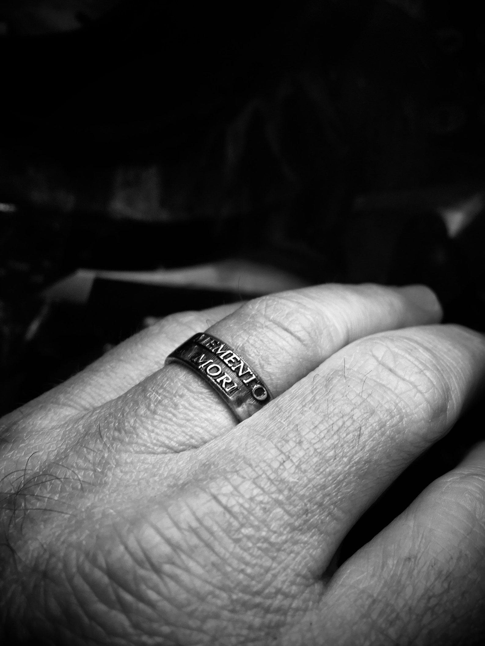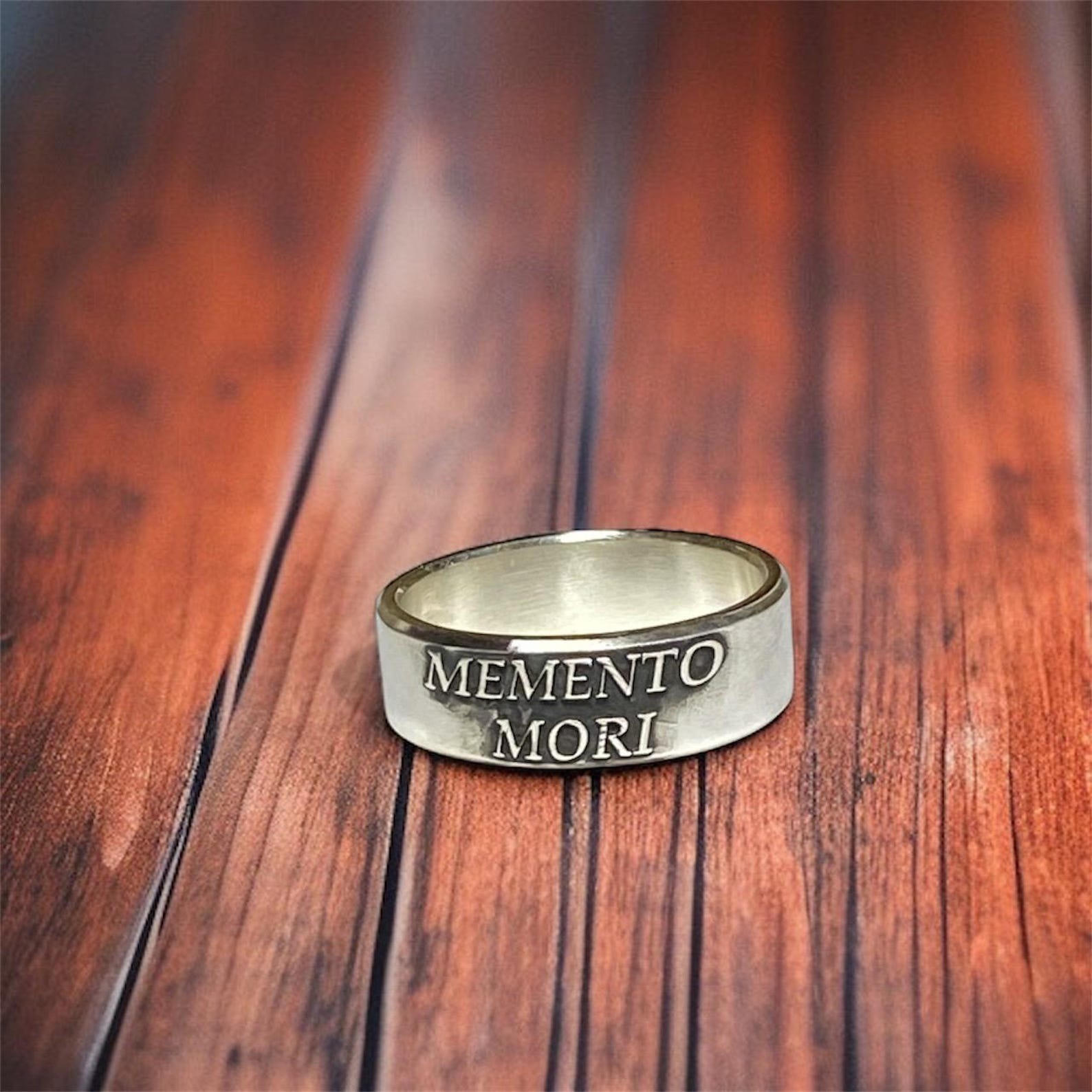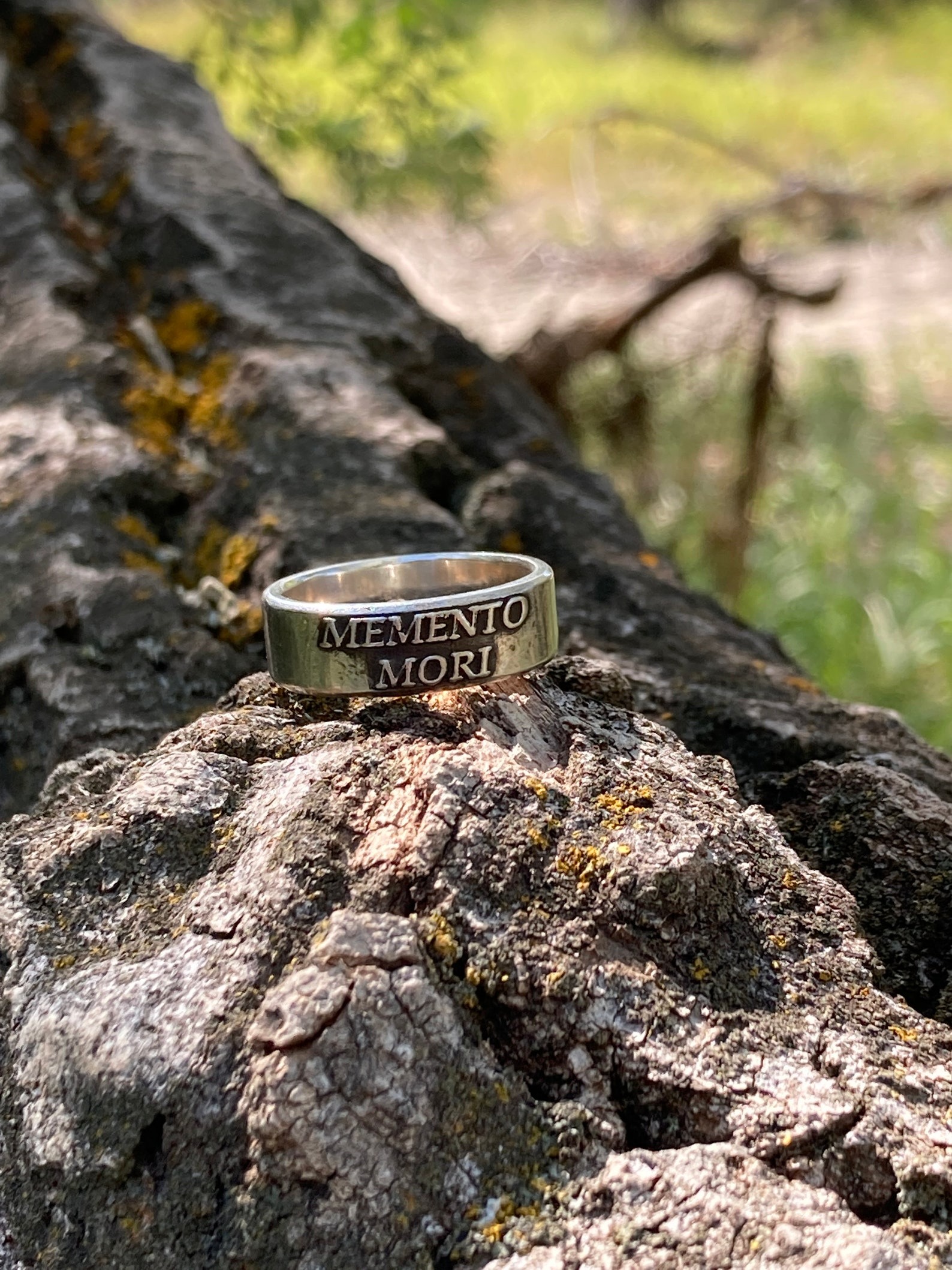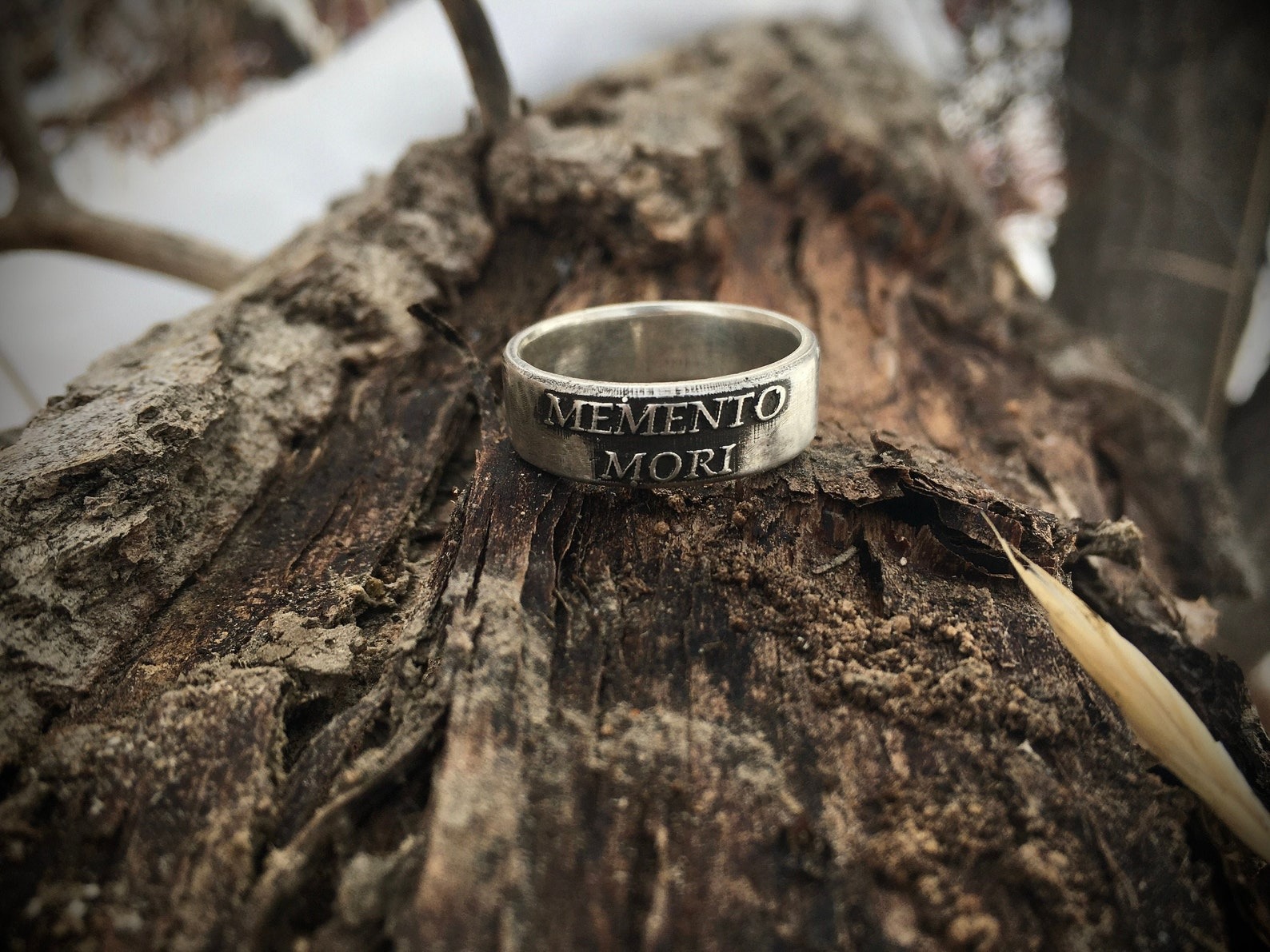 Sterling Silver “Memento Mori” Ring Latin for “Remember That You Must Die,” this rustic, handcrafted ring is a striking reminder to live fully and focus on what matters most. With raised lettering and a bold antiqued finish, it’s both meaningful and timeless—perfect as a gift or daily reminder.