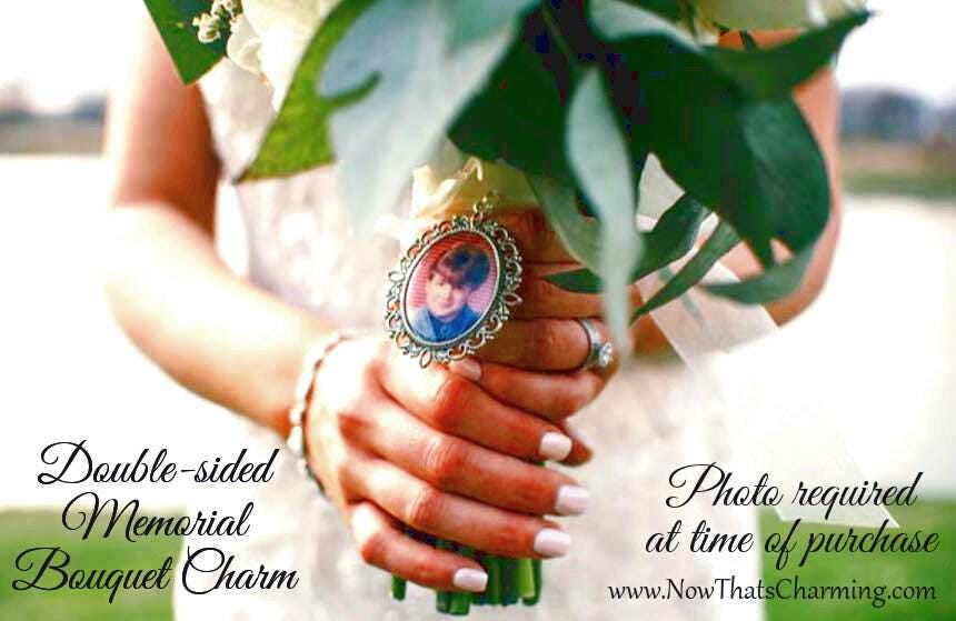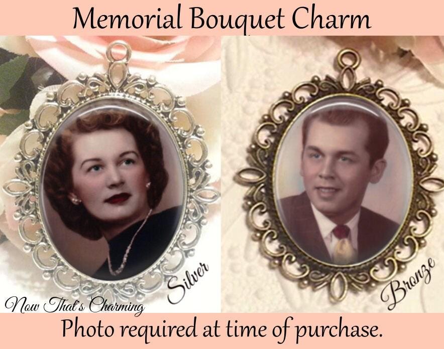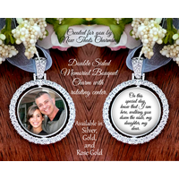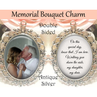 Remember those who cannot be with you on your special day with this double-sided memorial bridal charm. The Center of the charm measures 30mm x 40mm (1.18 inches x 1.57 inches), overall measurements approximately 2"x2.5". Available in Antique Bronze, Antique Silver, Gold or Rose Gold..