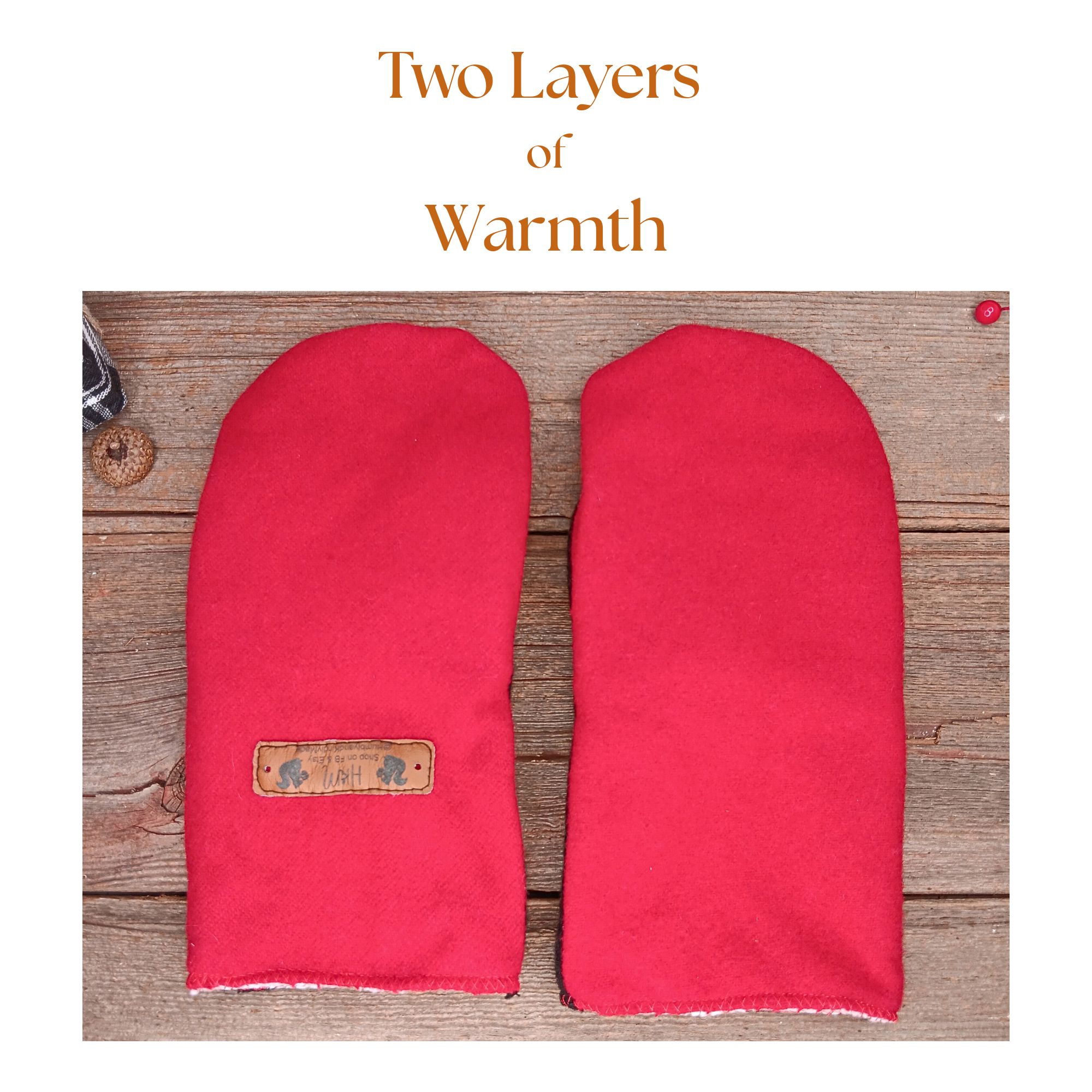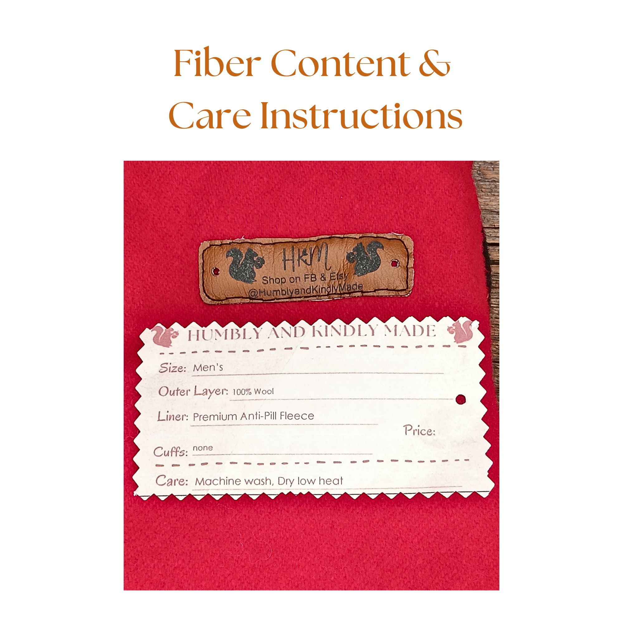 • Upcycled Wool Mittens are handcrafted from recycled wool sweaters & wool coats. All fiber content is printed on the tag of each pair of felted wool mittens and in the description box of each picture.