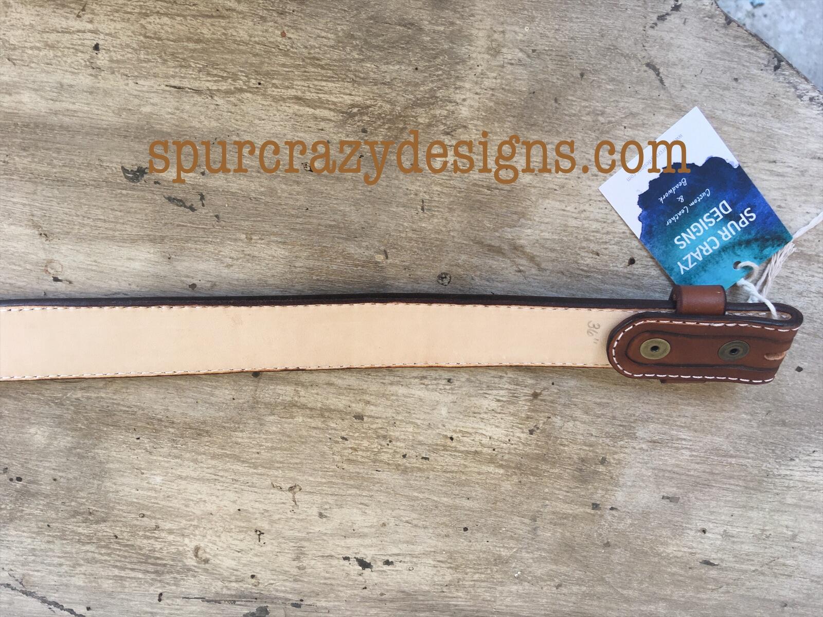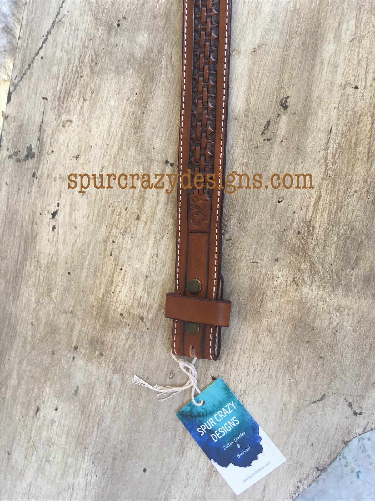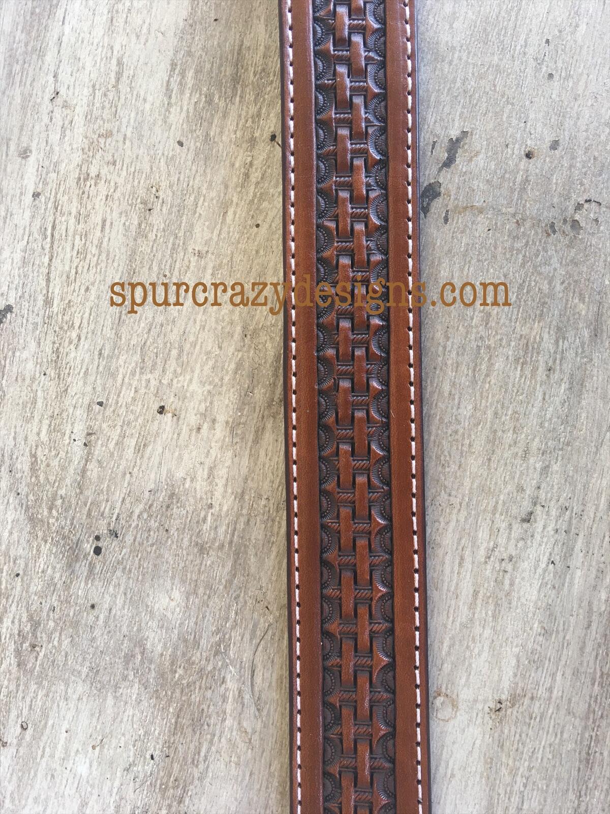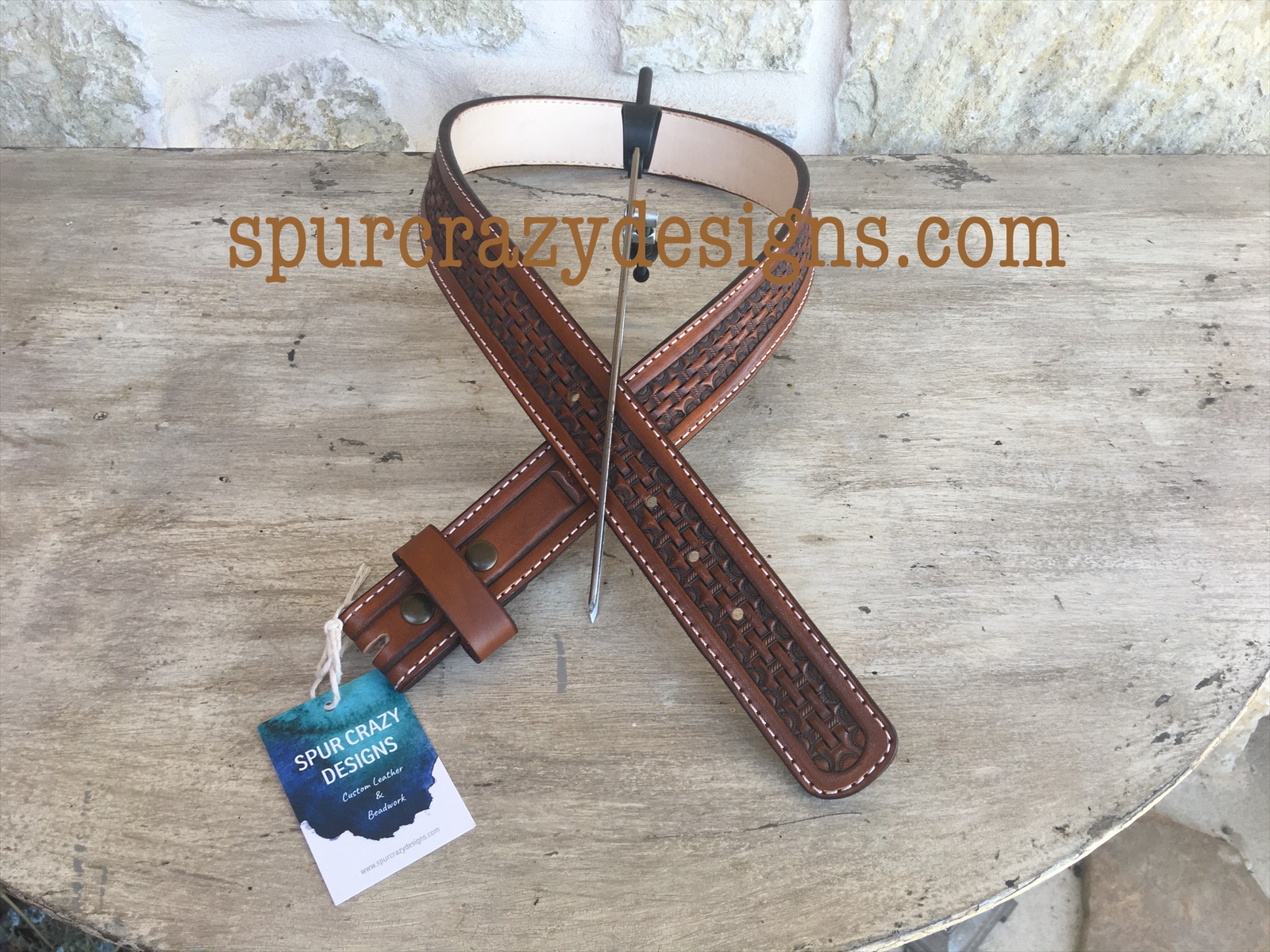 The belts are hand tooled by Spur Crazy Designs, using a basket weave pattern, light brown dye, and antiqued to bring out the details. 1.5" wide, approximately 3/16" thick, with snaps and a belt keeper.