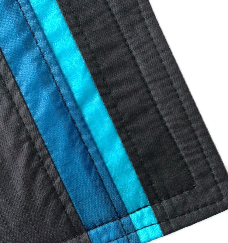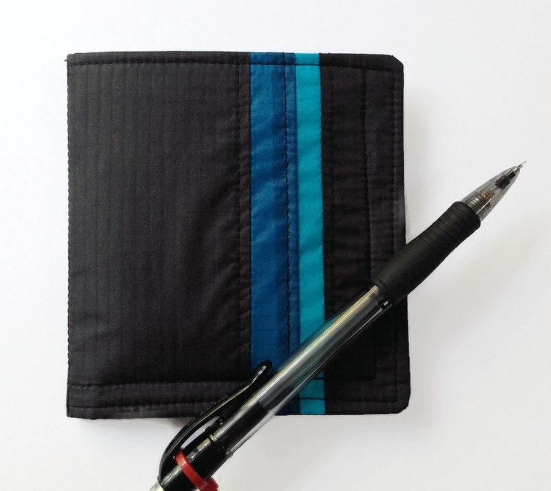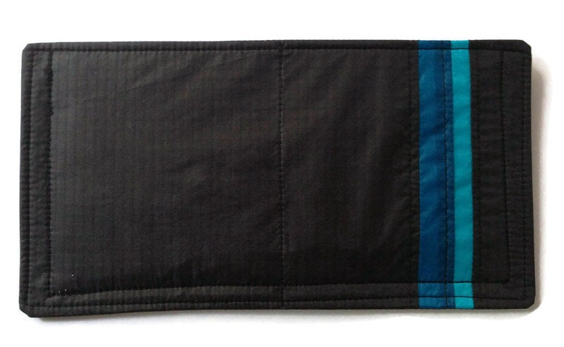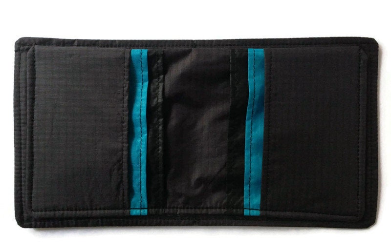 THE THINNESTTHE COOLEST THE LIGHTEST THE ECO-IST This ultralight guys bi-fold wallet has been fashioned from a recycled paraglider. Once floating among the clouds the fabric is now working hard as a tough rugged wallet. Folded this eco friendly wallet measures 4 x 4 inches and opened out flat it measures 4 inches x 8 inches and is practically weightless. The black, and turquoise blue interior echoes the exterior colors. The bright colors make it easy to find on a cluttered table or desk or in a backpack or briefcase. Perfect wallet for hikers, bikers, and climbers who need the lightest equipment possible. The minimalist wallet has one large pockets for cash and receipts and six credit card pockets for cards and I.D. Inward facing pockets add security. This wallet is so flat you can sit on it comfortably in your back pocket but it will fit even shirt pockets. Incredibly durable ripstop nylon. Washable. A nice gift for your green friends! Lighten your load and reduce your footprint.