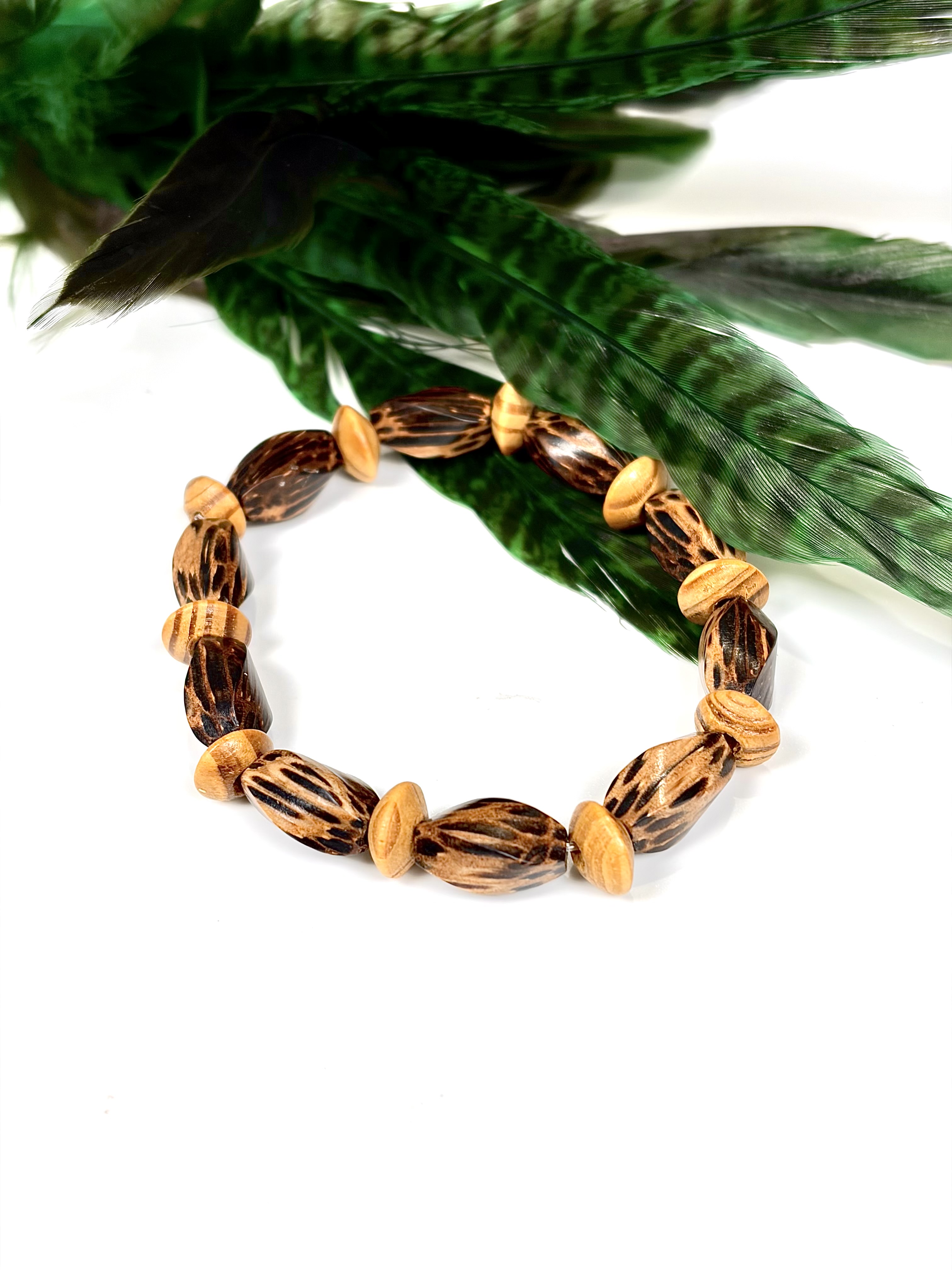 Ground your style with our Old Palmwood Twist Bracelet. This piece features uniquely textured, twist-shaped beads crafted from authentic Old Palmwood. The deep, dark grain is beautifully offset by smooth, honey-toned wooden spacers, creating a rhythmic pattern that feels both ancient and modern.