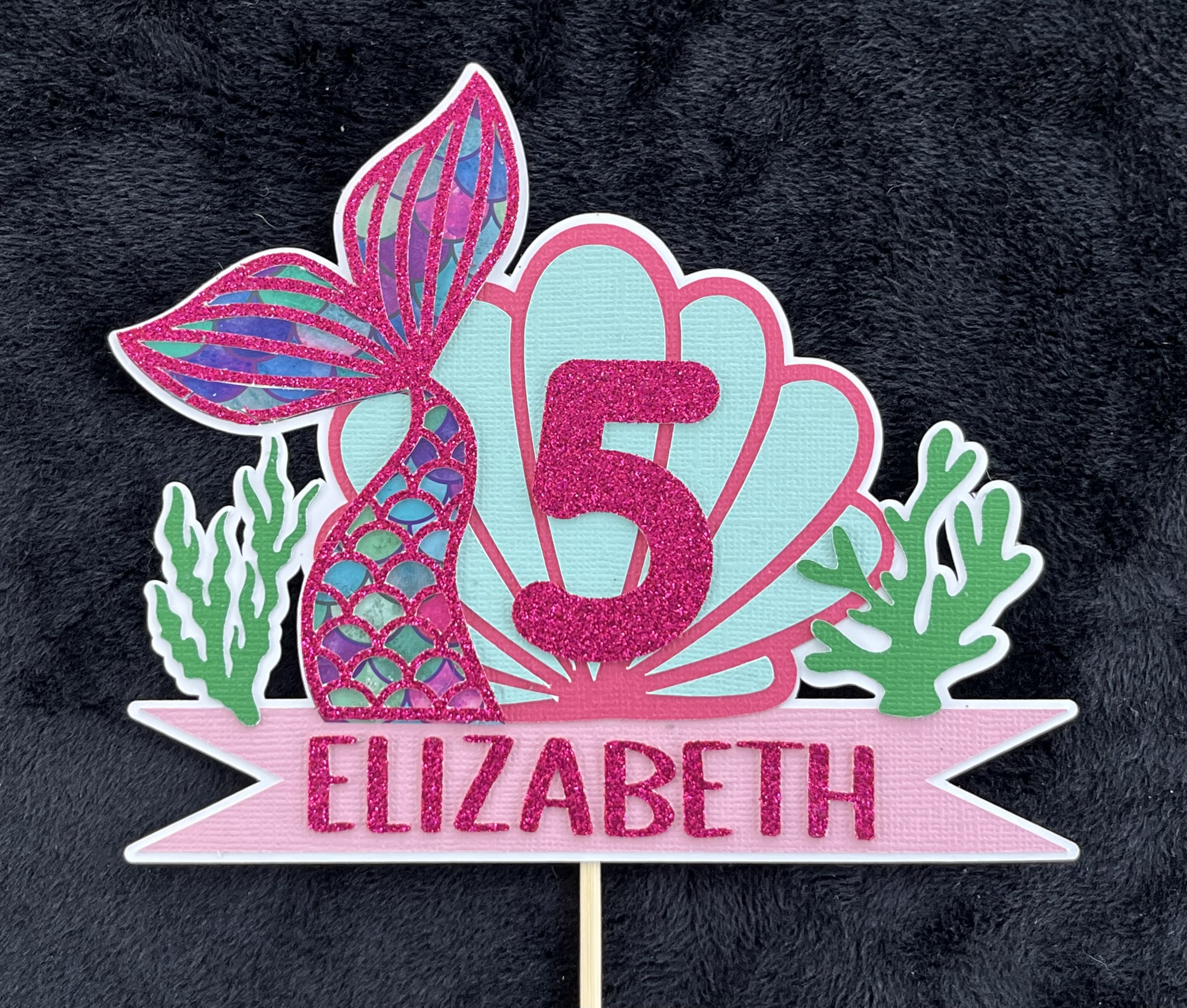 If the person you are celebrating loves Mermaids, adventure, glitter, magic and everything nice, then this cake topper is for you. The topper is made using thick cardstock in bright colors, and it is customizable with the name and age of the person you are celebrating. Choose from a variety of 4 sizes as well. The topper includes 1 bamboo skewers and 1 glue dot to attach it to the back of the topper. When you are done celebrating, remove the skewers and glue dots, and either save it in a memory book or recycle it for an eco-friendly celebration. This topper is perfect for anyone of any age who loves mermaids! (the topper shown is 6" wide x 5" high with magenta glitter)
