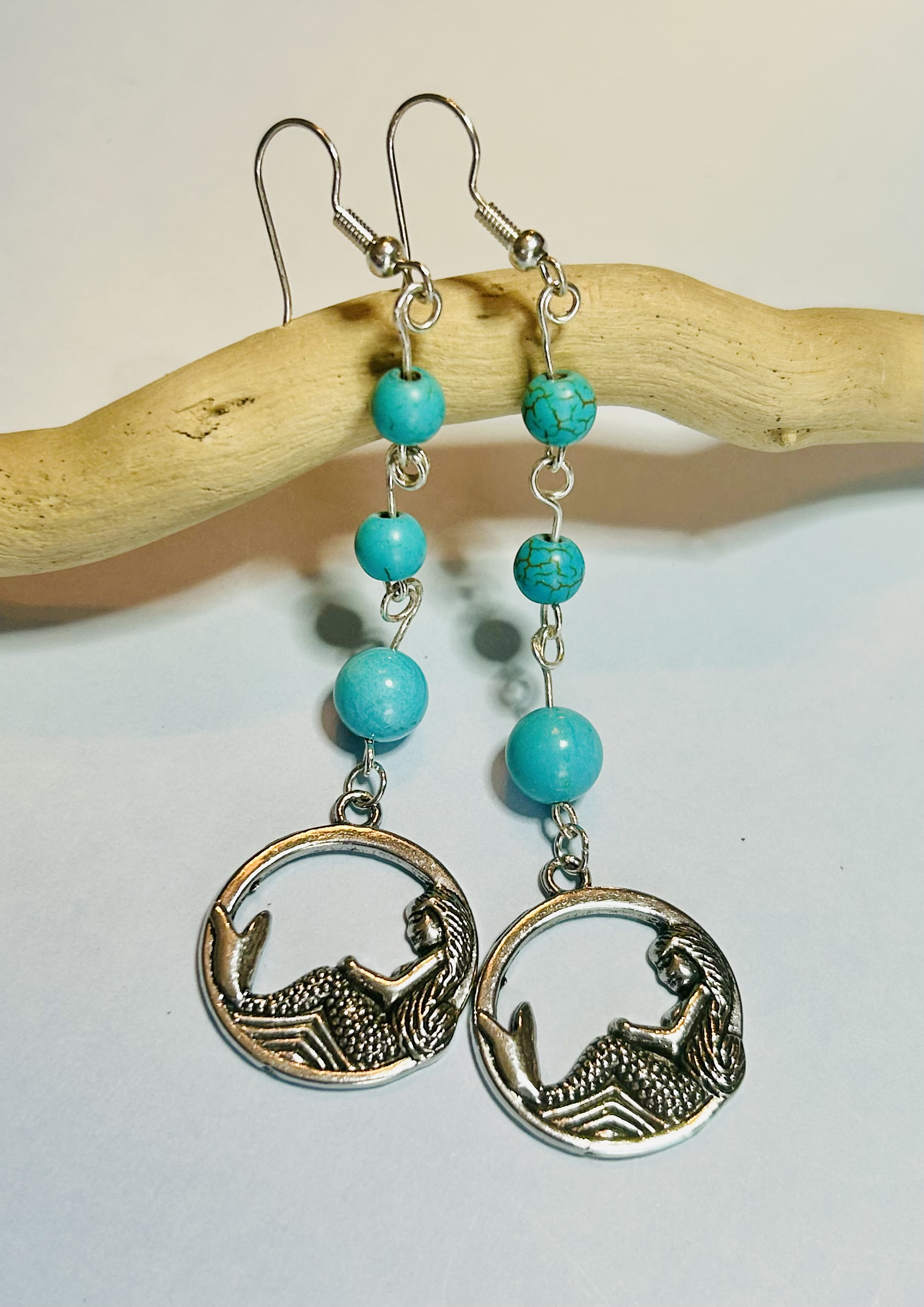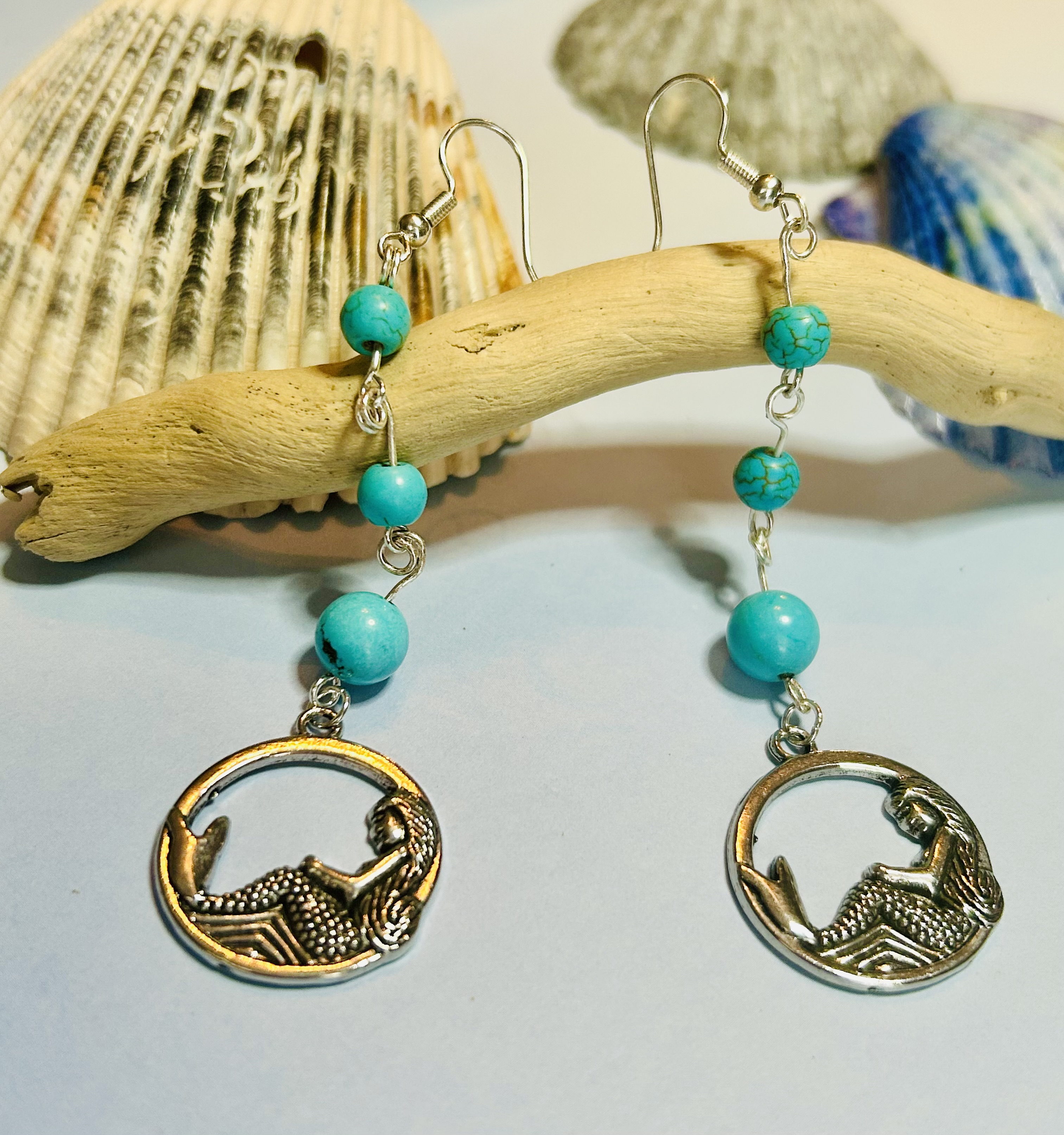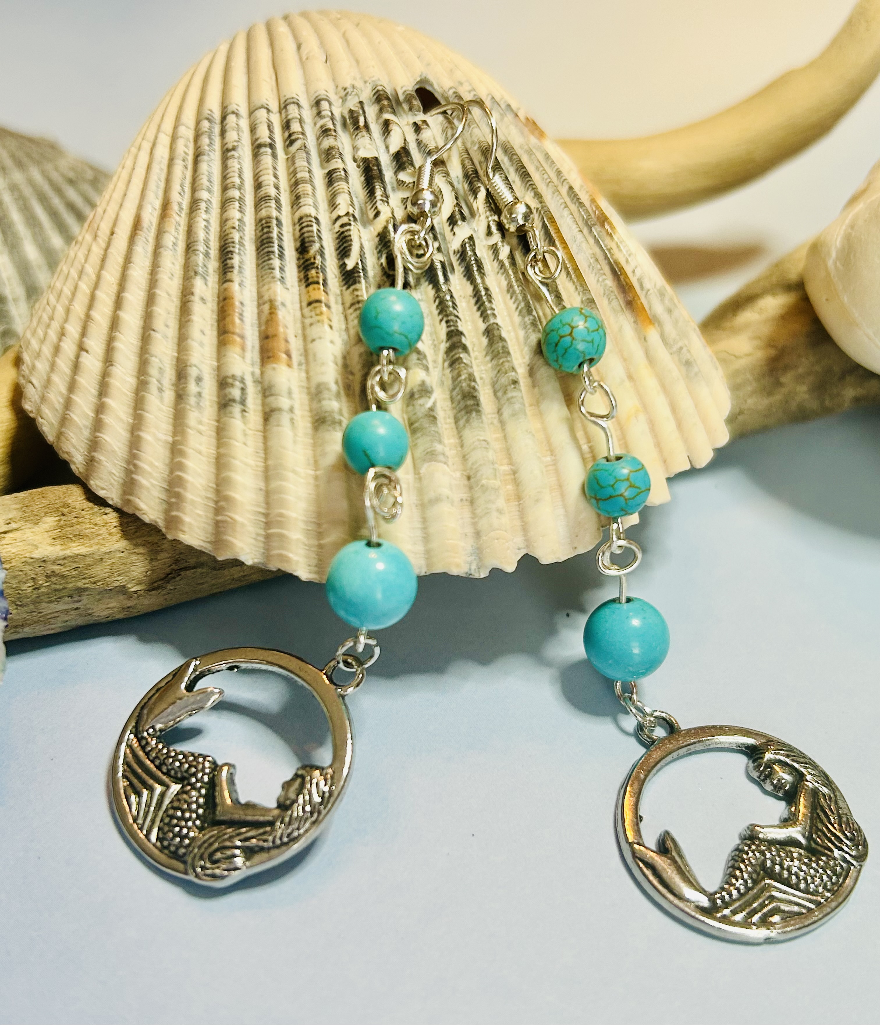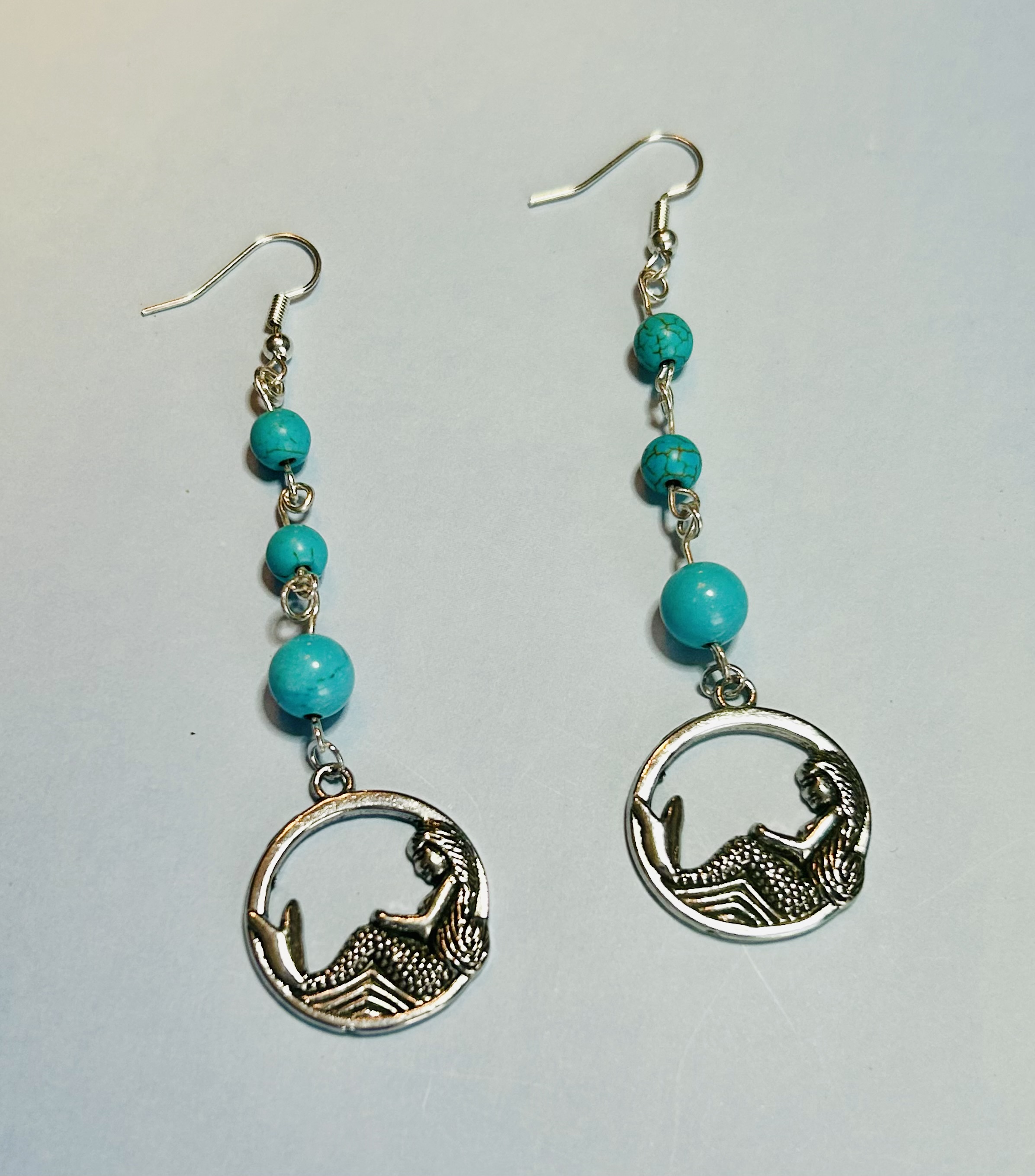 Handmade wire wrapped and beaded earrings with turquoises howlite beads and a stainless steel mermaid charm in a circle. These are long dangle earrings measuring at 3.5 inches in length. They are carefully cleaned and packaged in a gift box or organza bag with silicone stoppers.