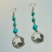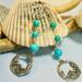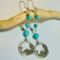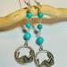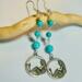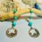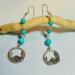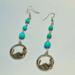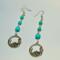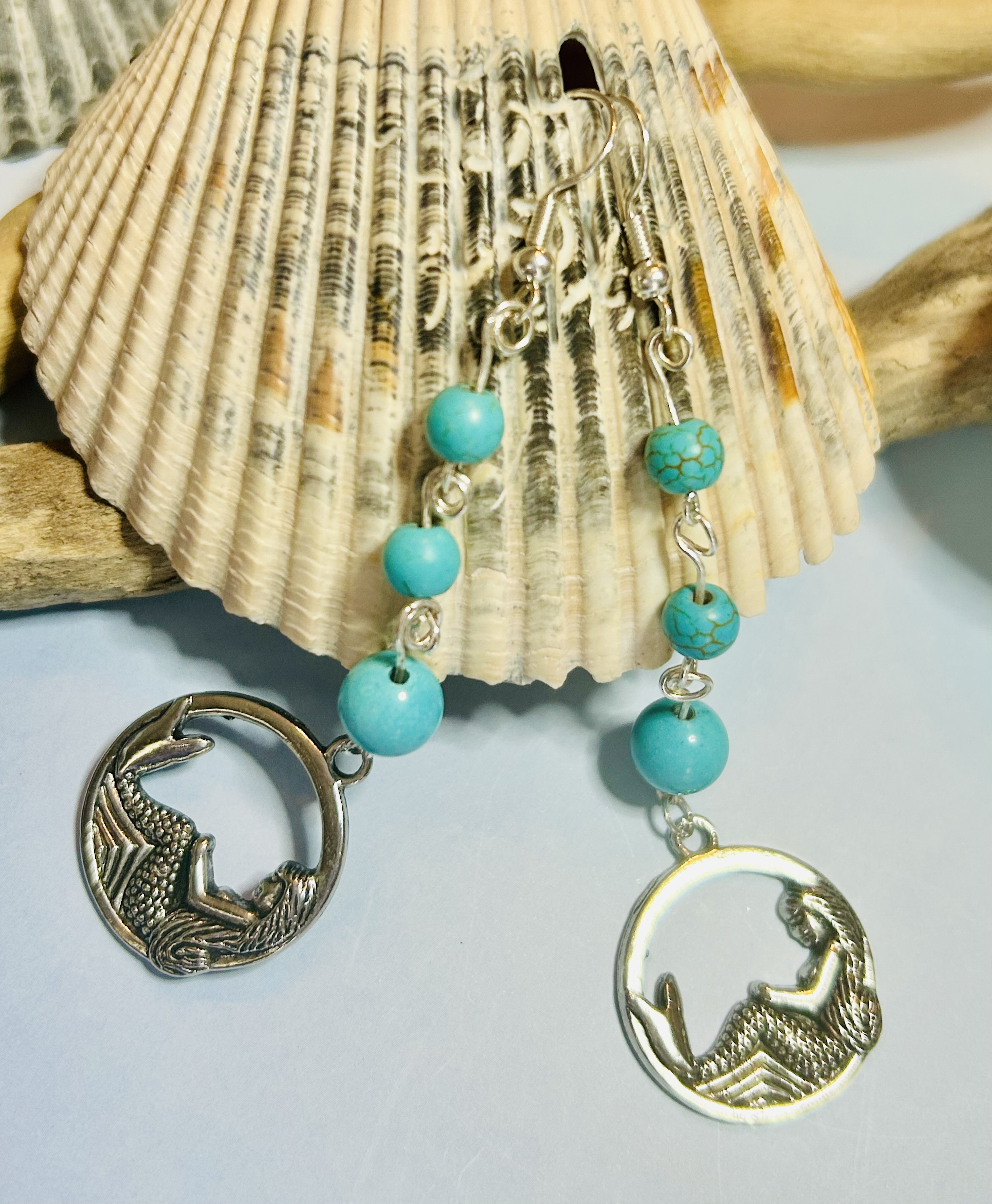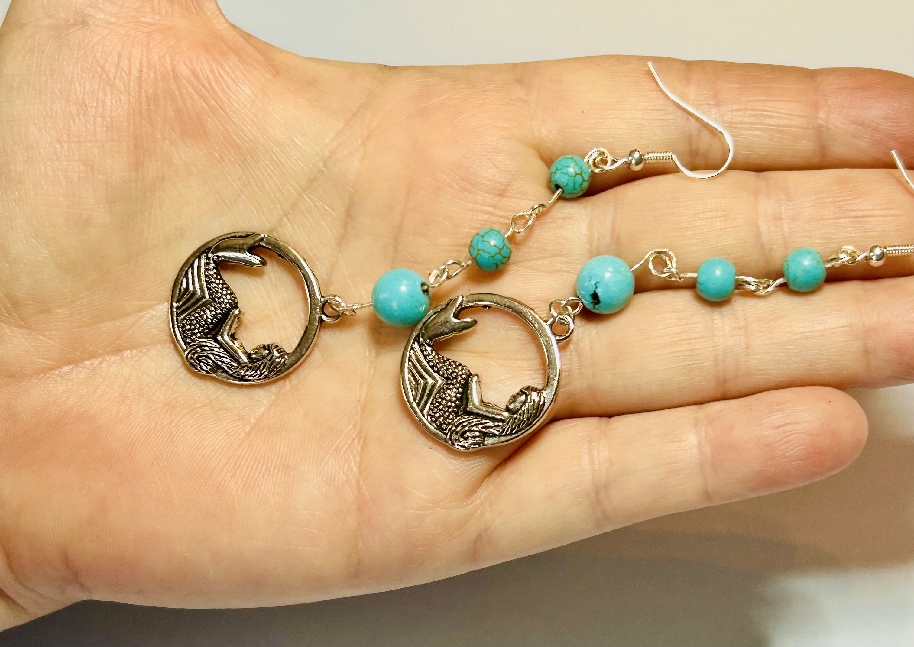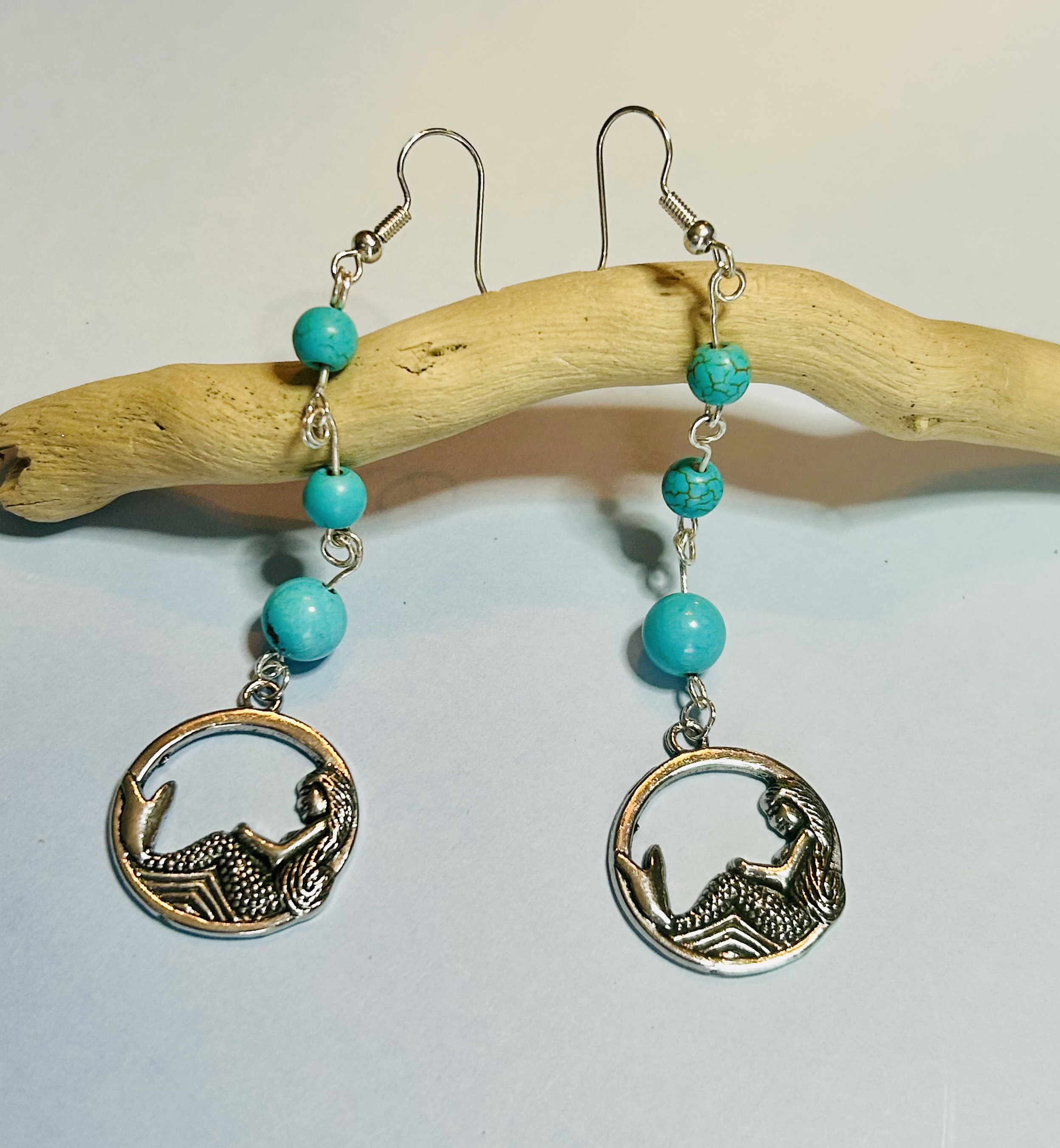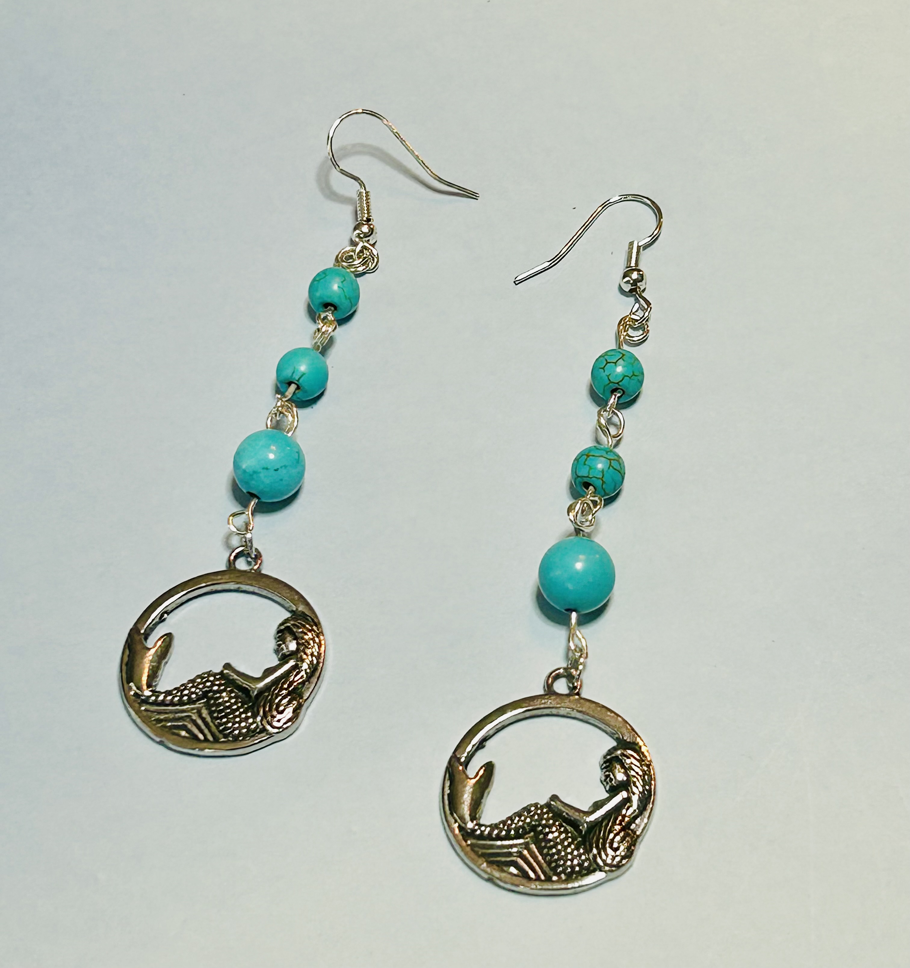 Handmade wire wrapped and beaded earrings with turquoises howlite beads and a stainless steel mermaid charm in a circle. These are long dangle earrings measuring at 3.5 inches in length. They are carefully cleaned and packaged in a gift box or organza bag with silicone stoppers.