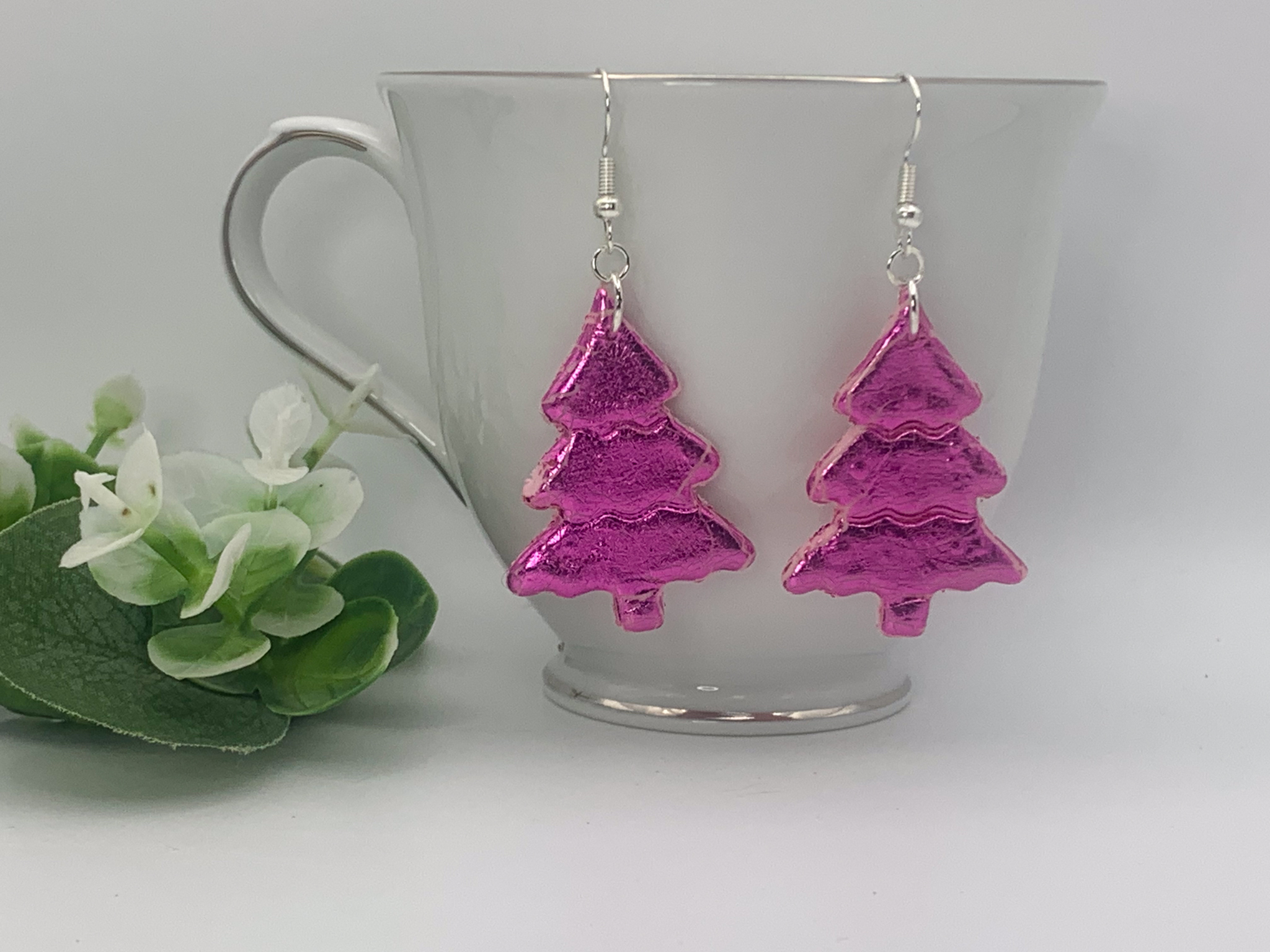 Make a bold holiday statement with these shiny metallic pink Christmas tree earrings! Fun, festive, and full of personality—perfect for standing out.