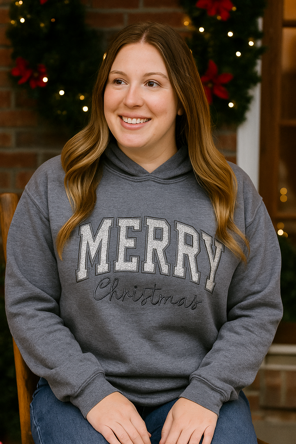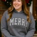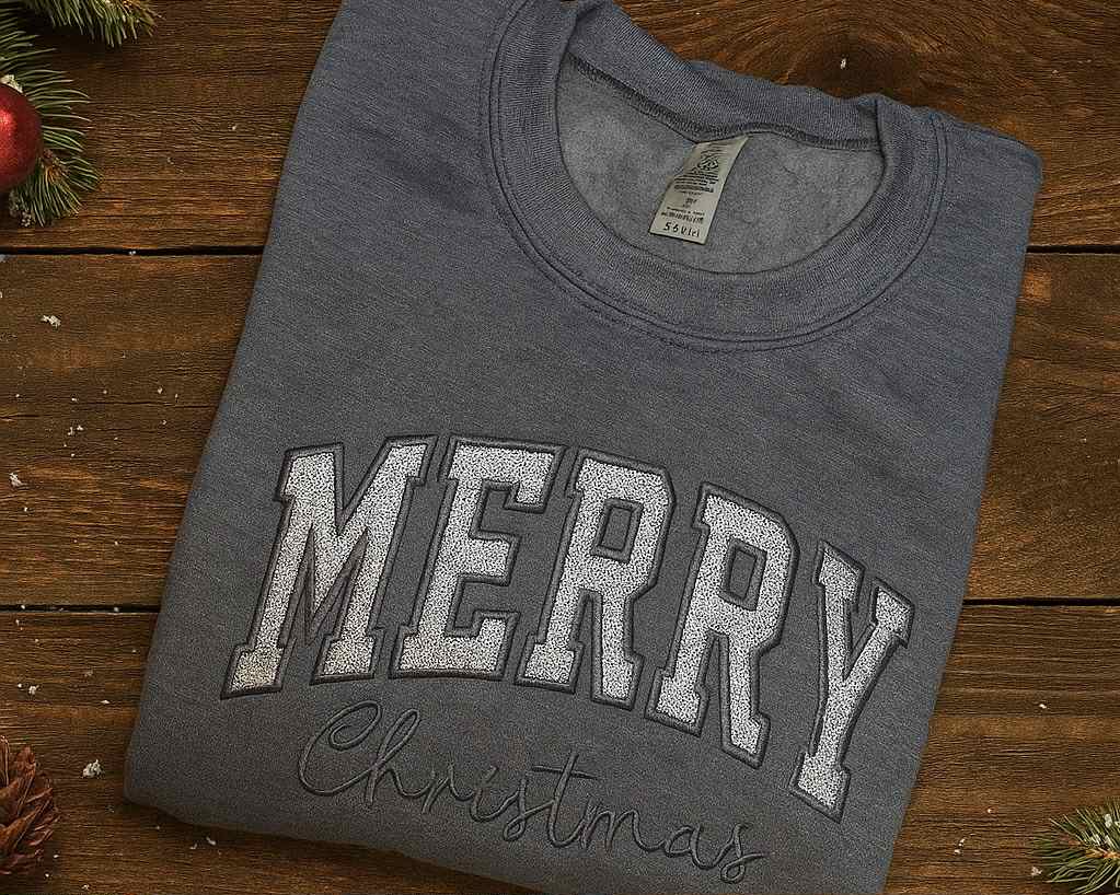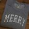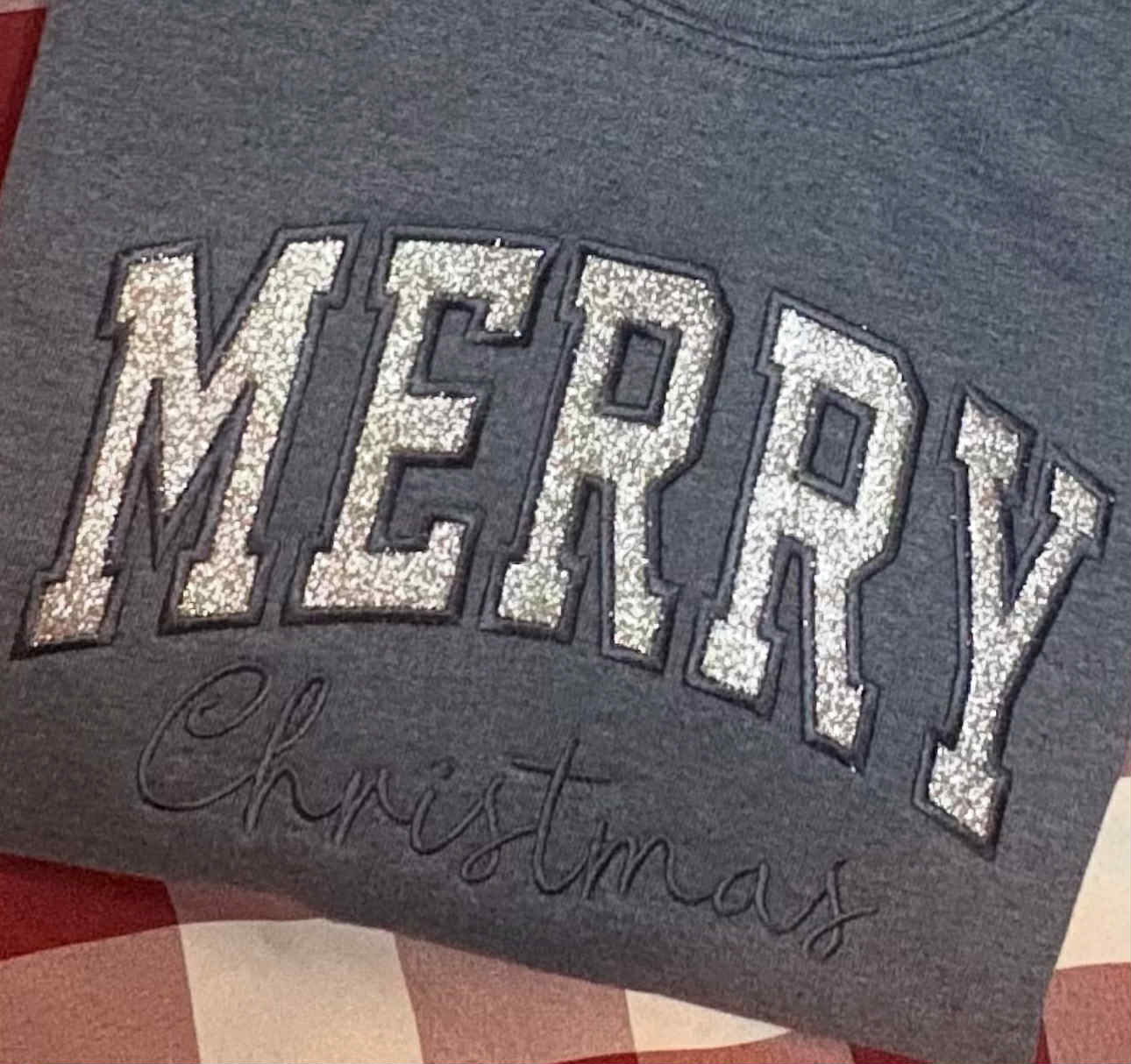 Want to outshine your friends this Christmas? (See what I did there :) ) Then you need this crewneck sweatshirt that is not only beautiful, it is super cozy and comfortable. The word MERRY sparkles in silver glitter HTV and is outlined in a smooth satin stitch on a heather blue sweatshirt. . Below it, the word Christmas is embroidered in satin stitch. Check sizing chart in pictures. If you don't see the size or color you want, please reach out to me by clicking "contact maker" and I will do what I can to help you out. Please see my other listings for more colors and sizes