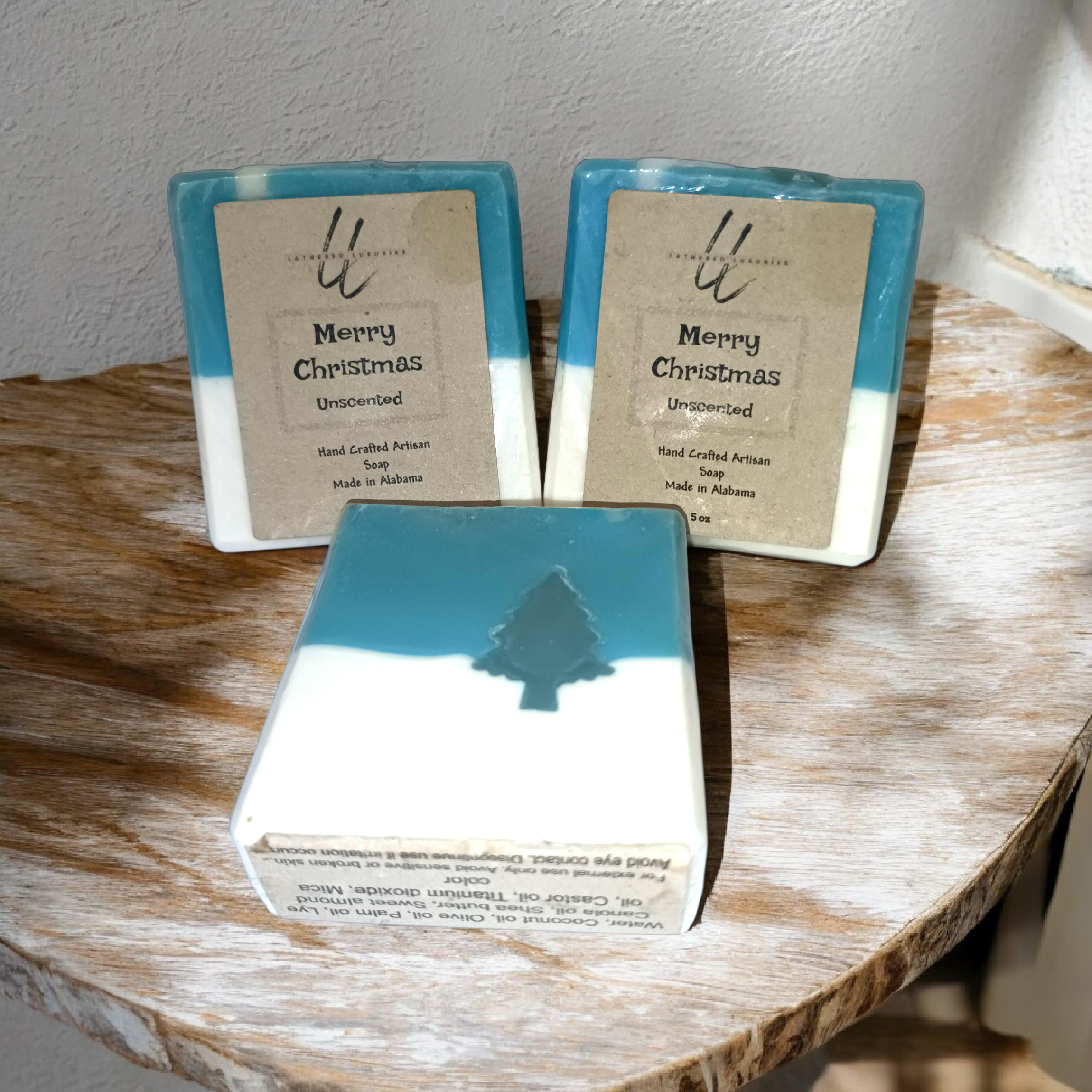 Handcrafted with love, our Merry Christmas soap begins with a blend of nourishing oils, carefully mixed and blended with sodium hydroxide to create a rich, cold process soap base. We gently pour the soap into molds, where it's left to cure and harden. Once set, each bar is hand-cut to reveal a beautiful, snowy design. The result is a gentle, long-lasting soap that's as kind to your skin as it is to the senses.
