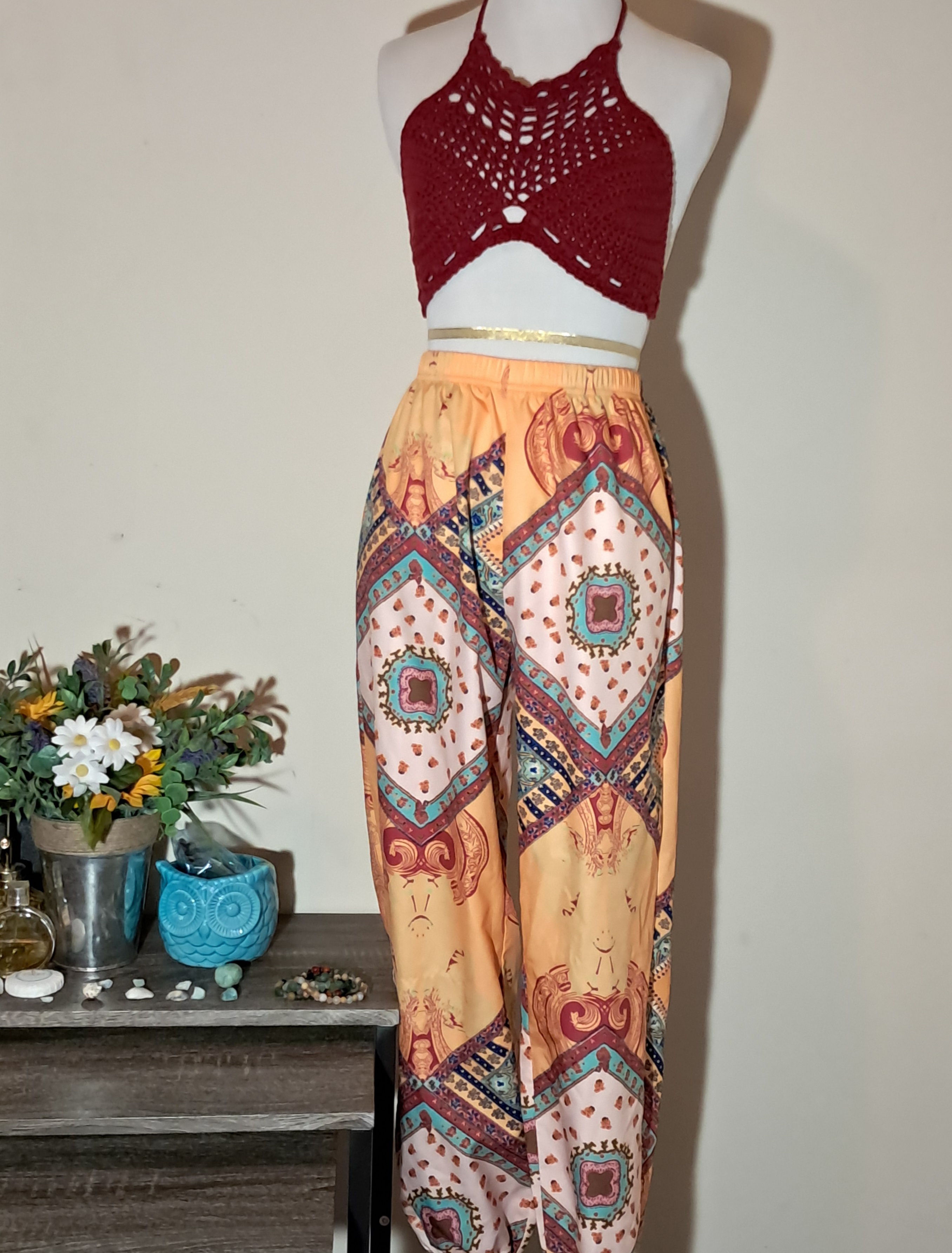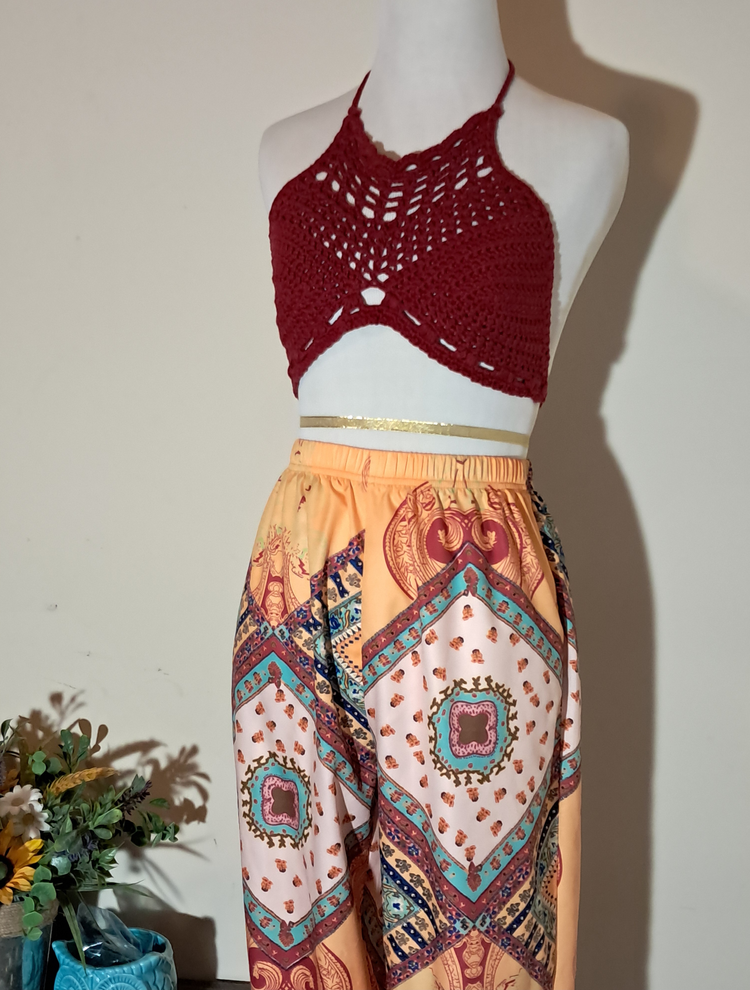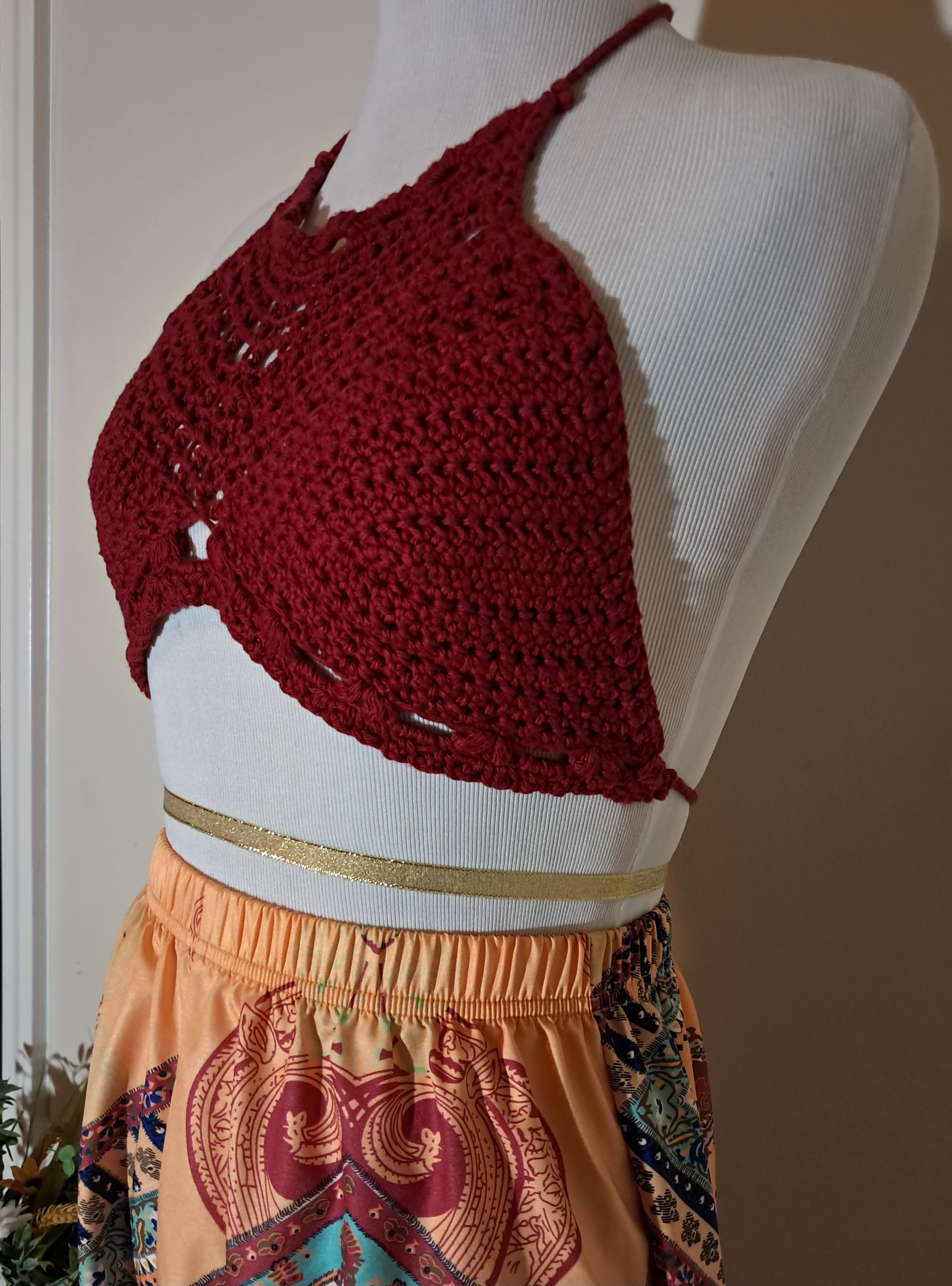 Mesh stitched halter top in a beautiful crimson color, has tie back closure located at the neck and below the shoulder blades, making fitting tension adjustable. Stitched by hand, using 100% cotton yarn in category sport weight. Will soften with frequent wash and wear. Please handwash/line dry or delicate machine cycle/low to moderate heat dry.