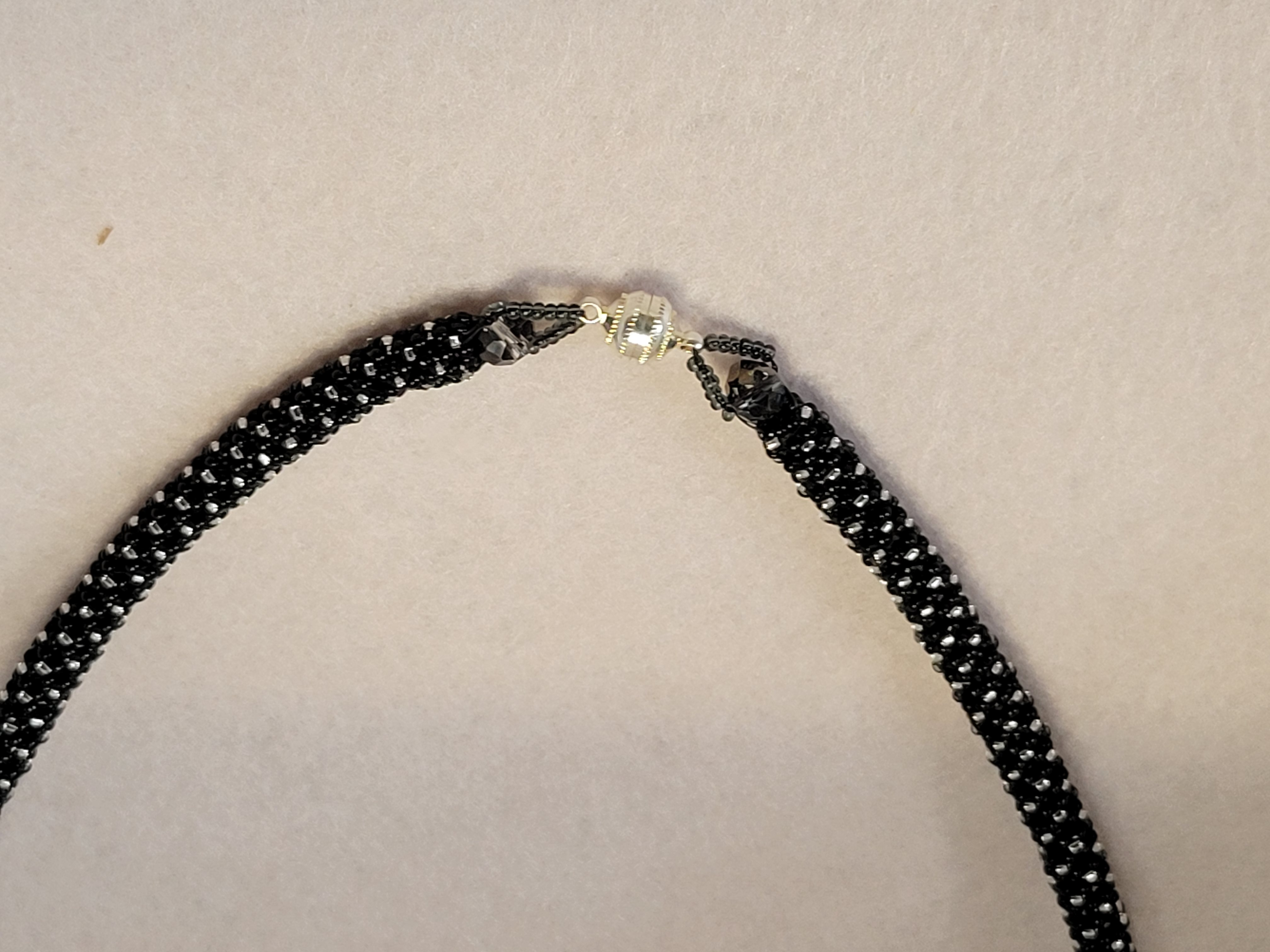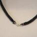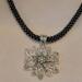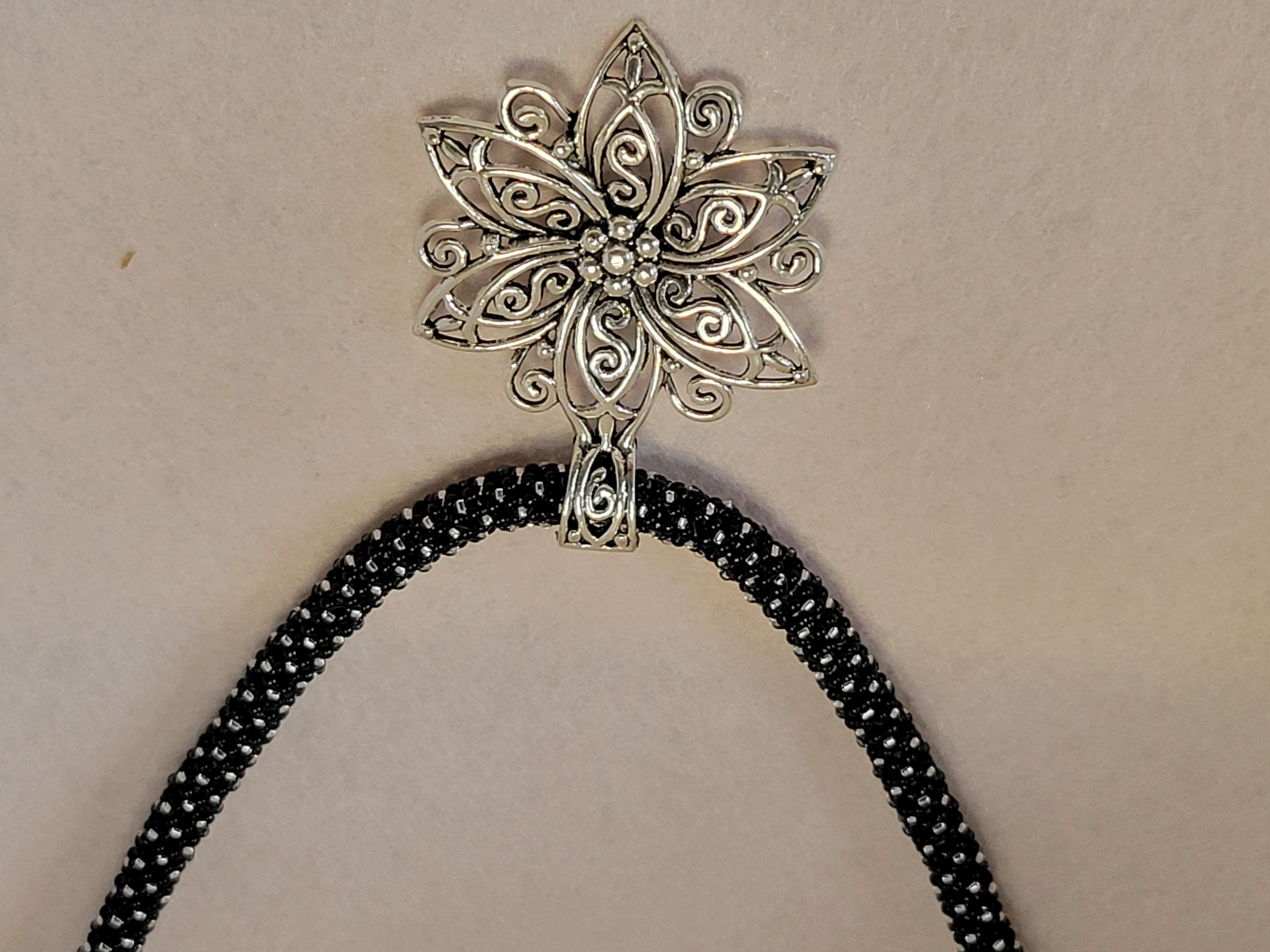 The silver floral pendant features openwork detailing and soft curves that contrast beautifully with the dark, textured beadwork. This necklace feels balanced and intentional, with a clear center of attention and a clean, finished look.
