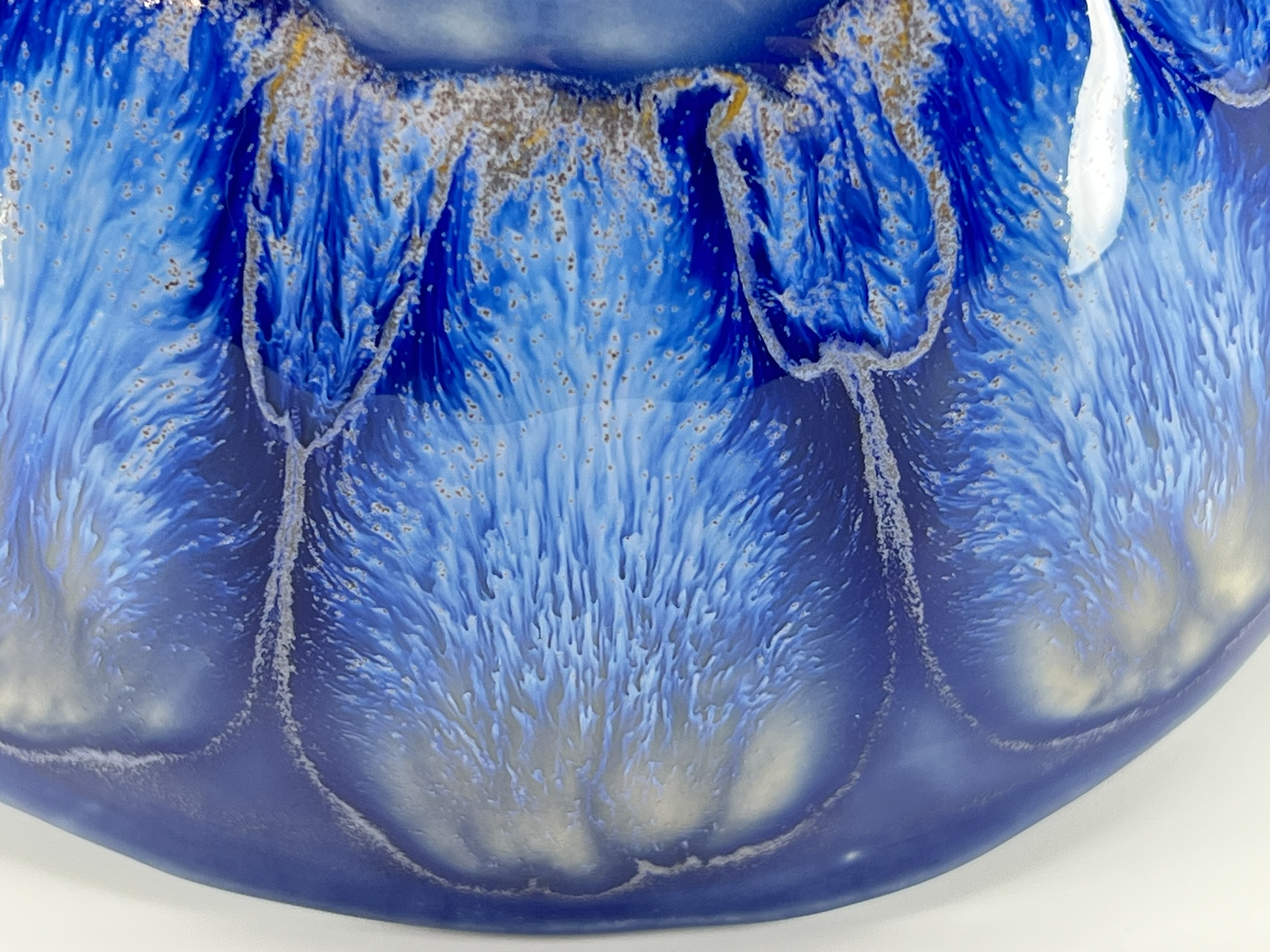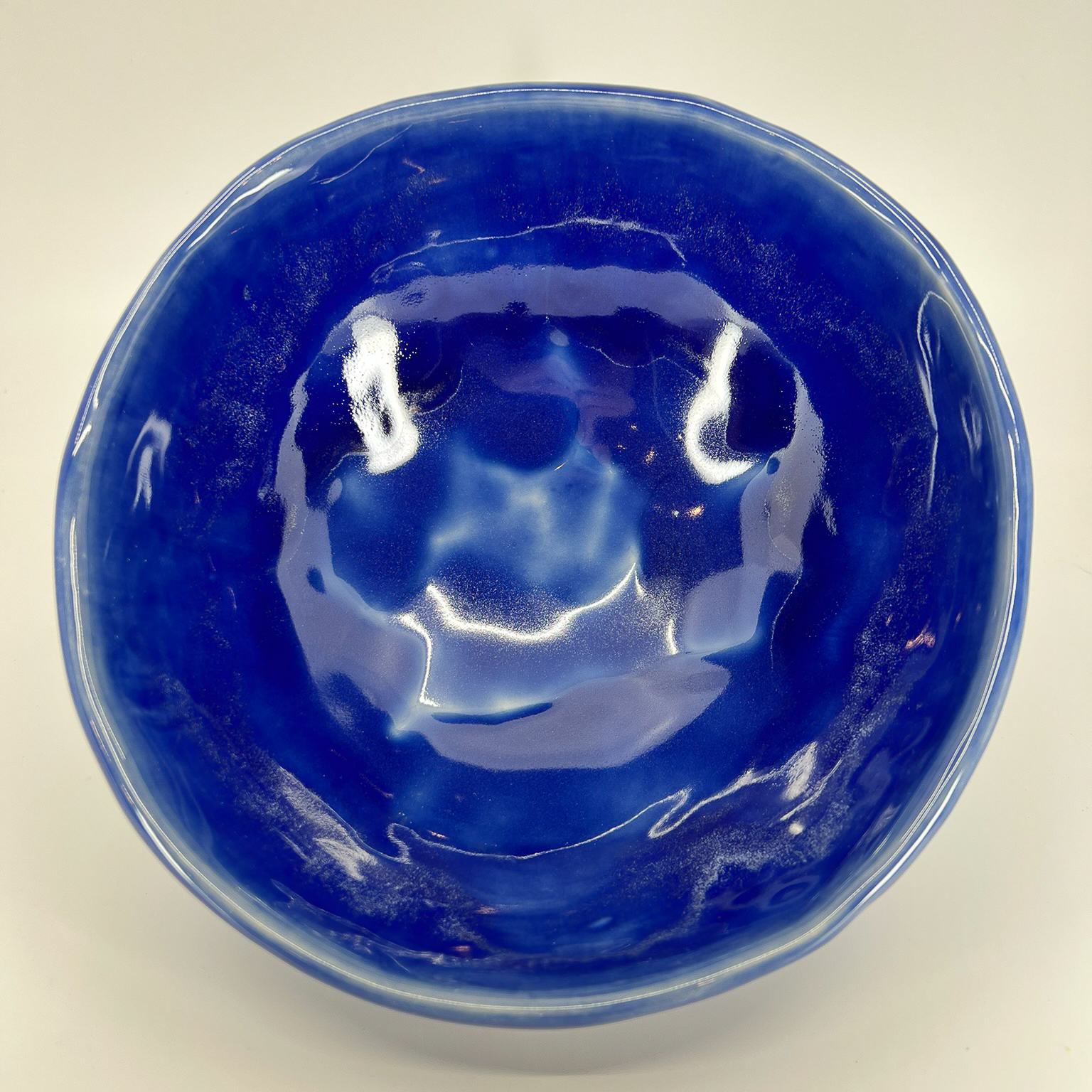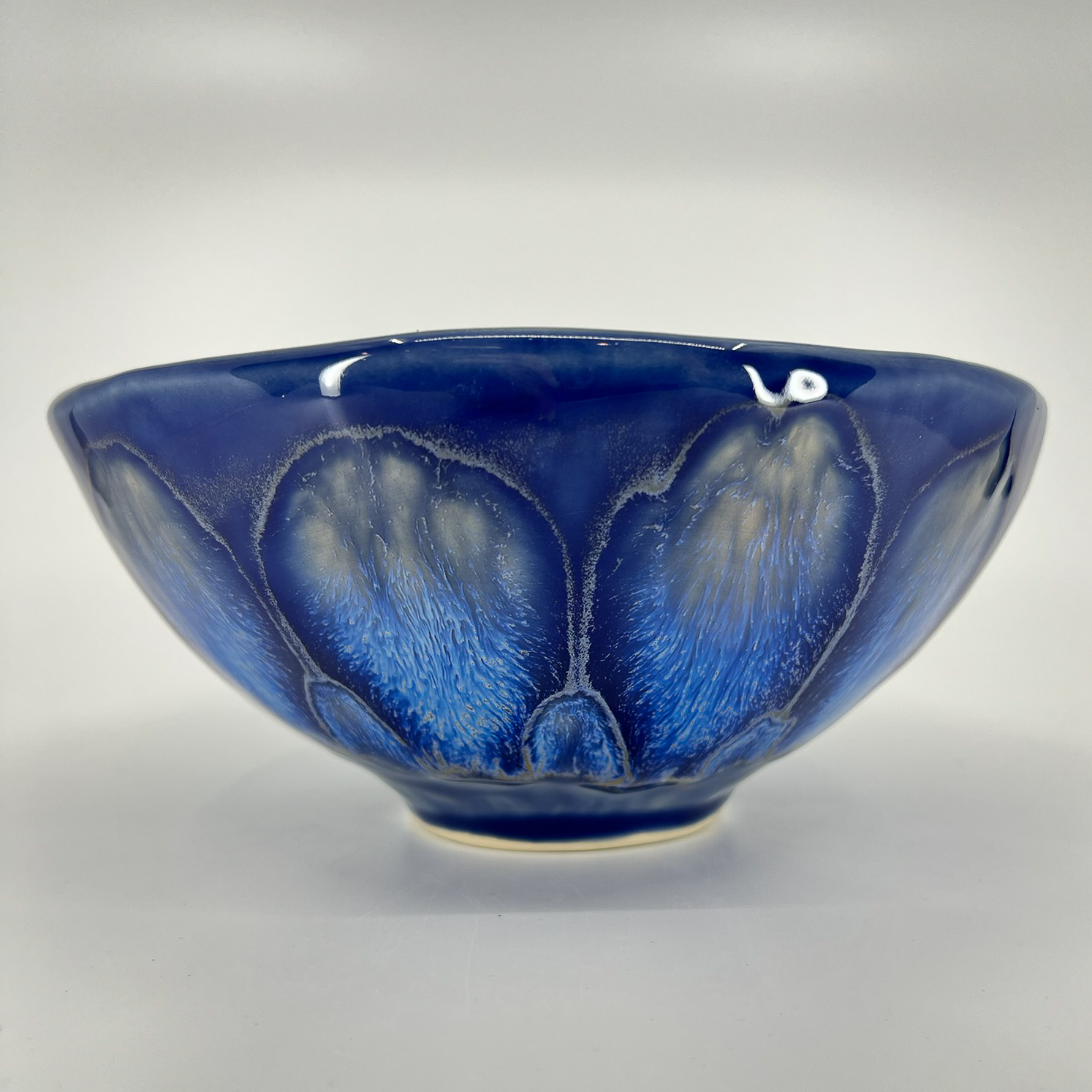 Rich layers of deep blue glaze flow across this hand-built bowl, revealing, on the outside, a soft crystalline pattern evocative of flower petals in low light. The deep blue surface catches and reflects light in subtle ways, giving the piece a sense of depth and movement. Each bowl’s organic shape carries the maker’s touch, a reminder of the human hand behind the form.