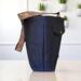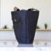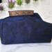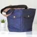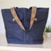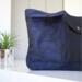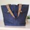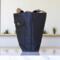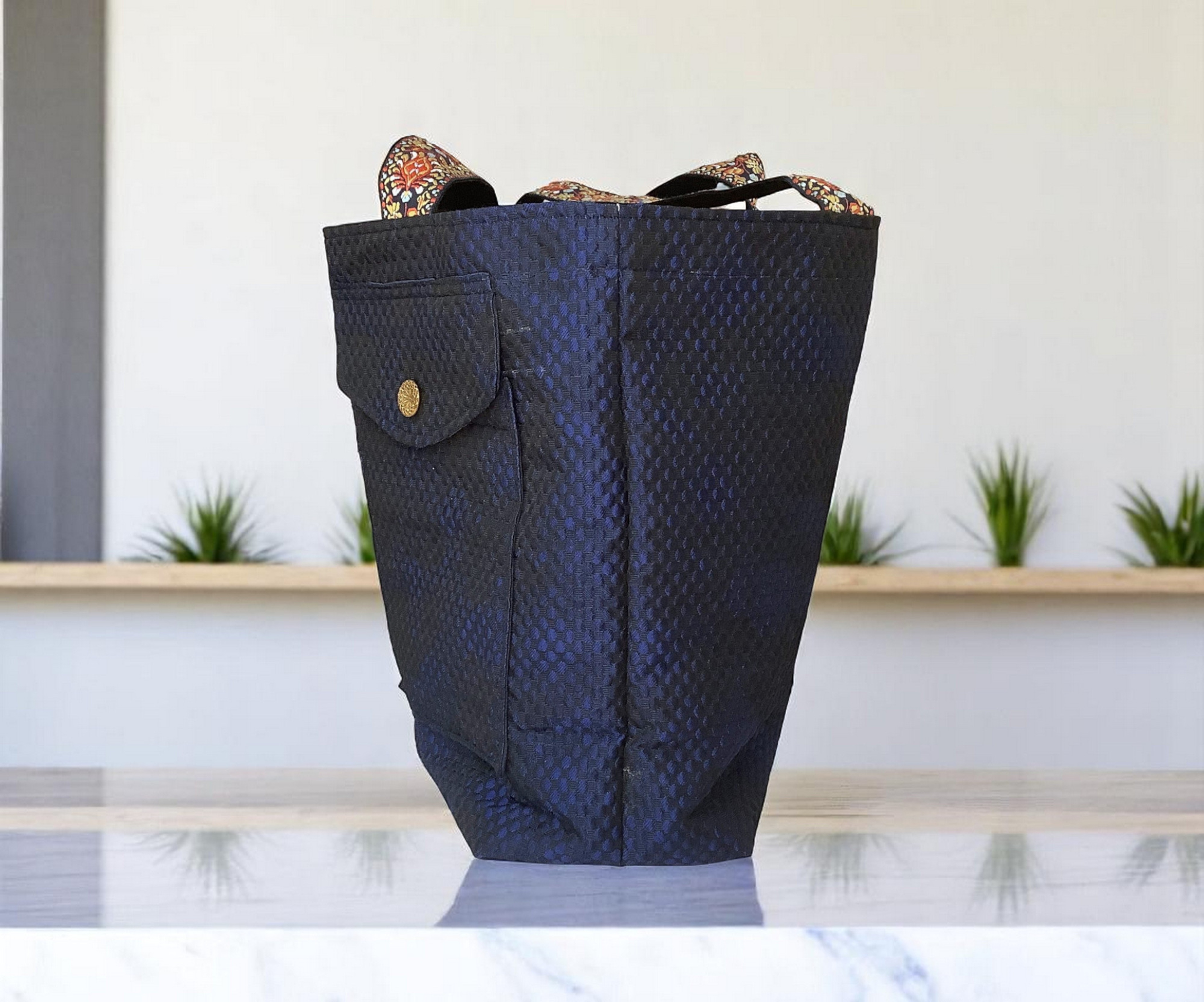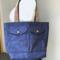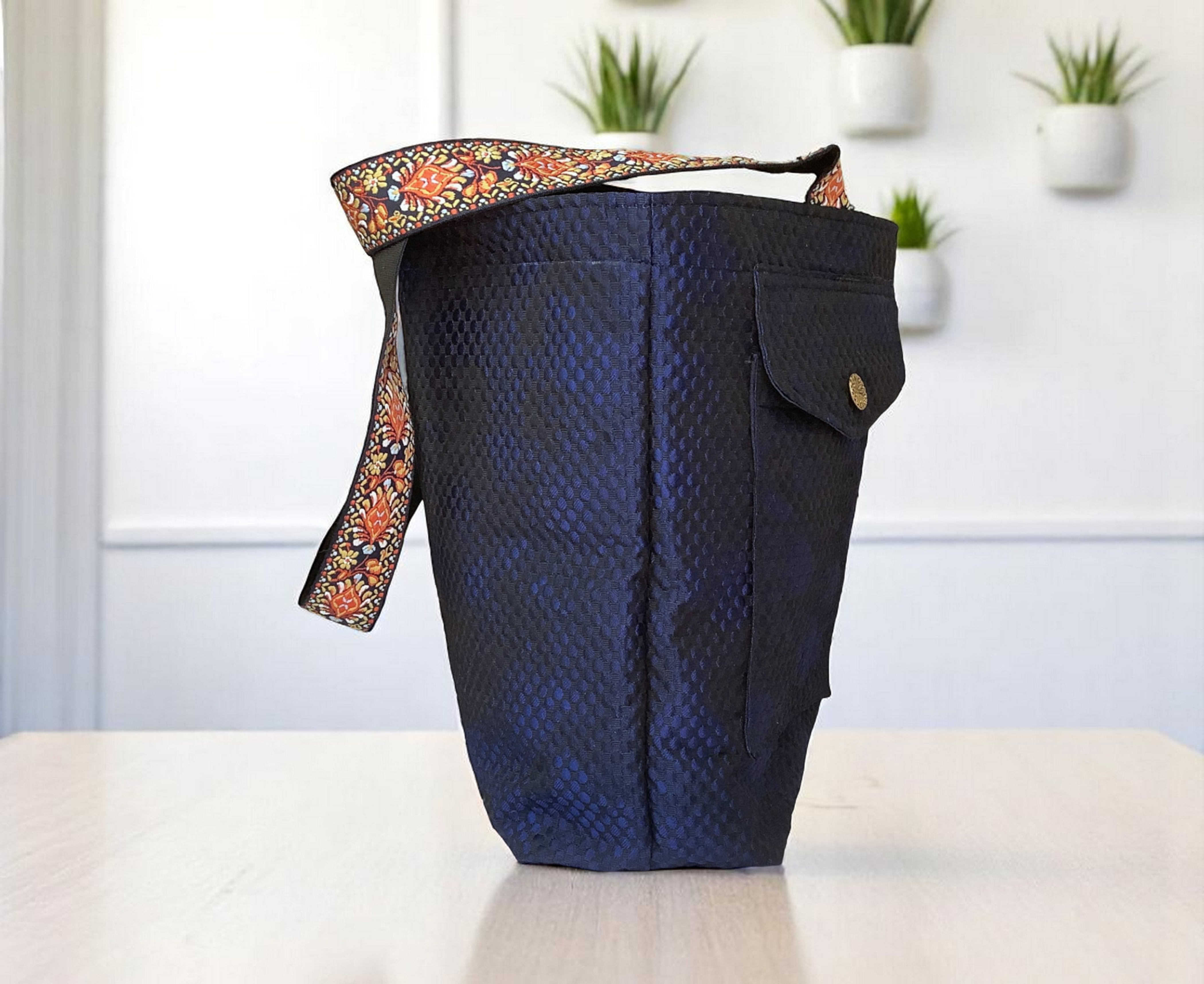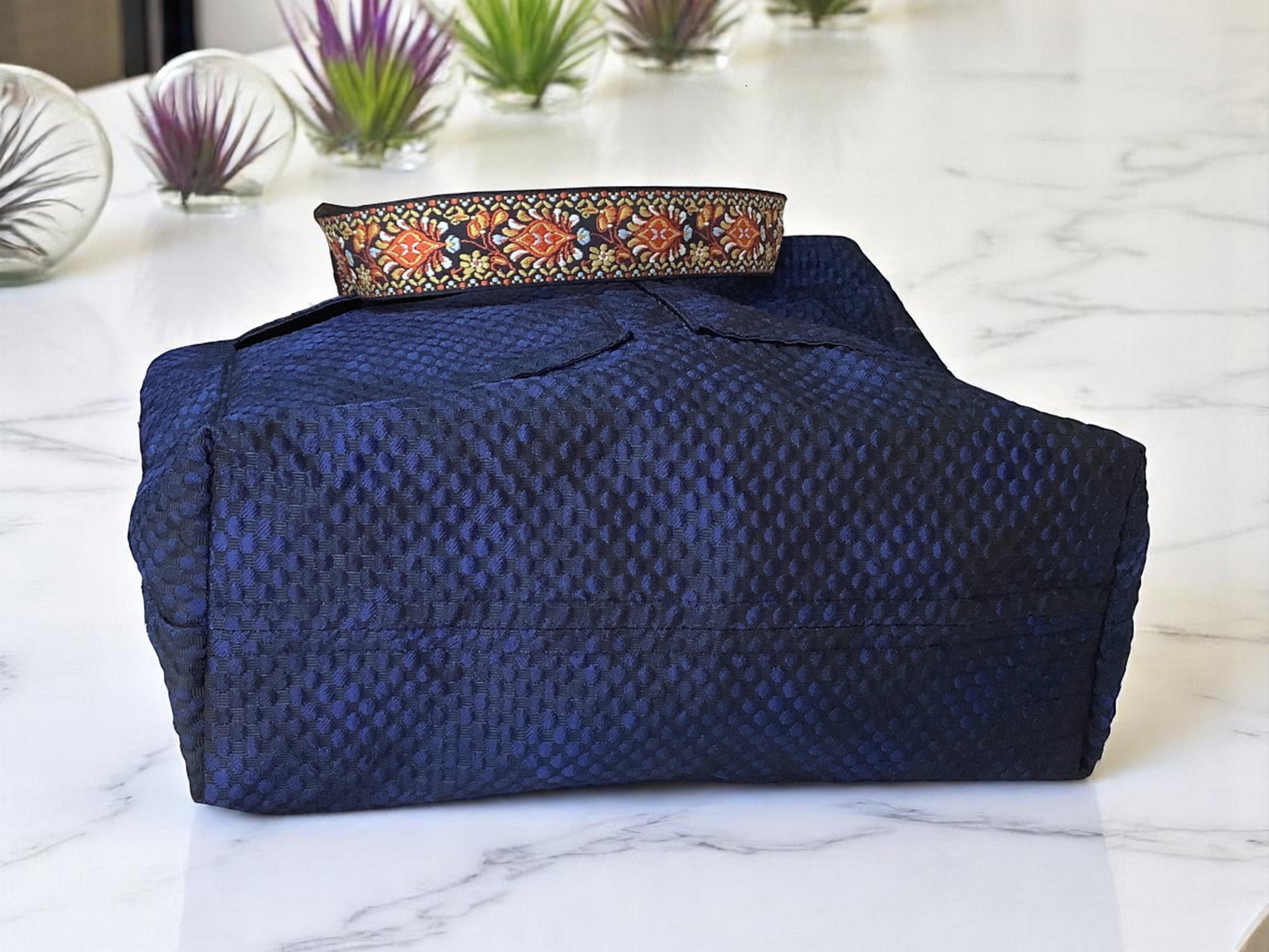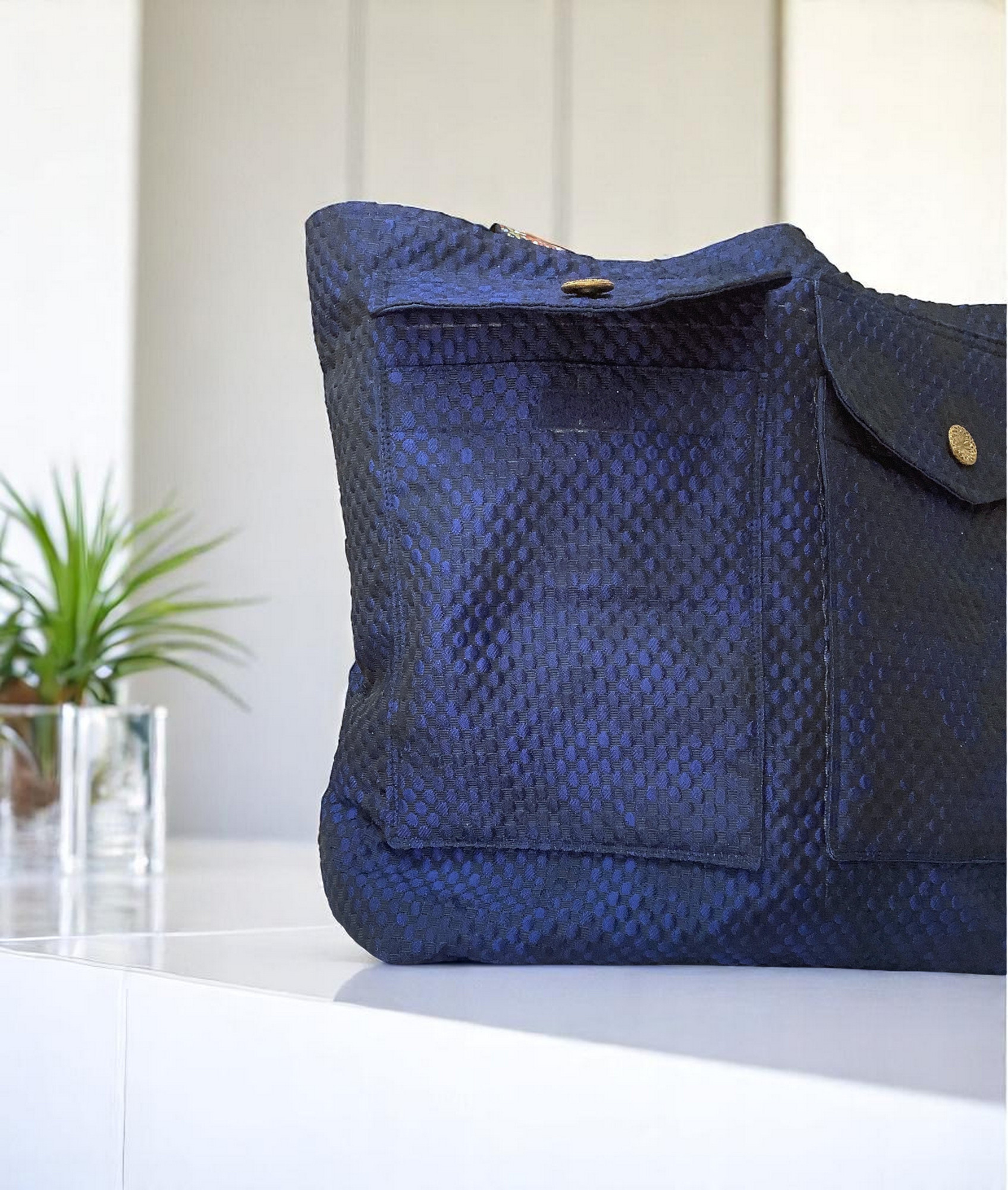 Made in a Midnight blue and black toned textured fabric – It is quite interesting how the colors go back and forth in different lights – It has 2 large pockets on the front – They are topped with a flap that closes with a hook and loop tape and accented with vintage brass buttons that were made in Czechoslovakia (marked)
