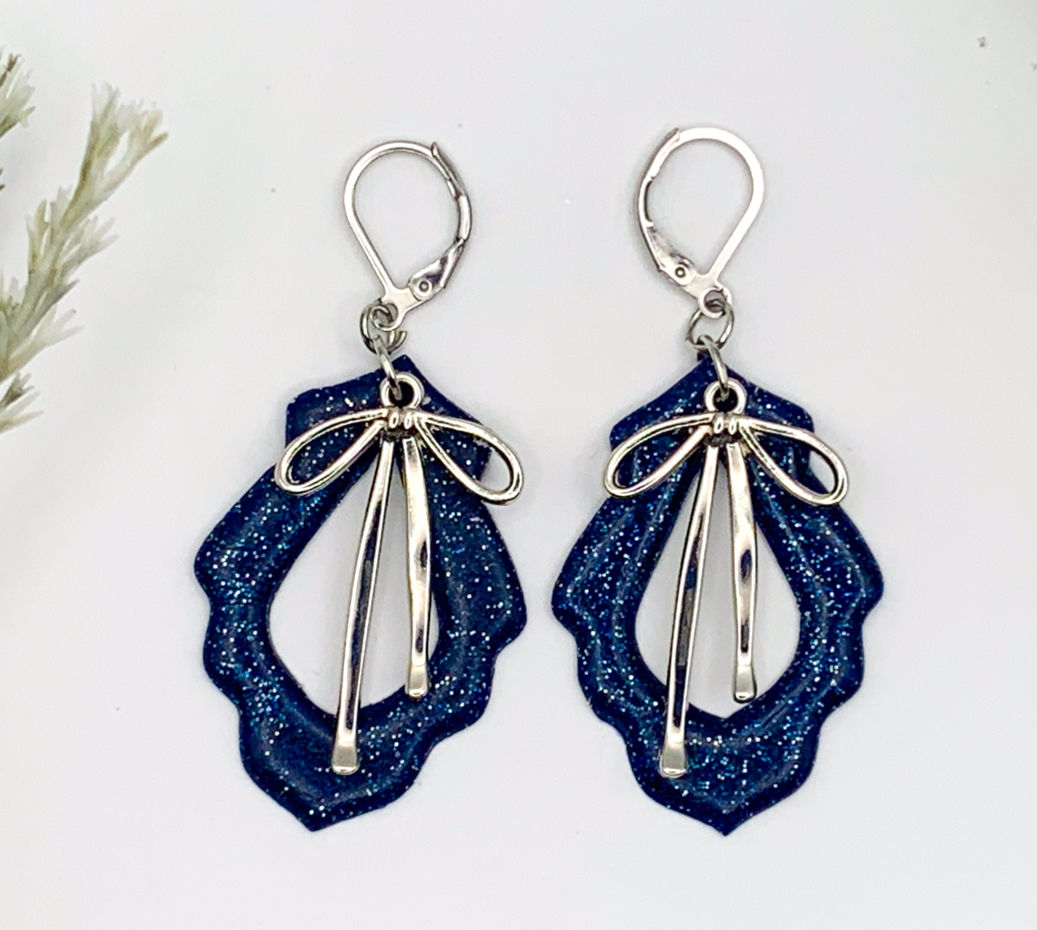 Elegant and eye-catching! These deep blue glitter earrings feature a unique open-frame design adorned with a silver bow charm for a sophisticated finish.