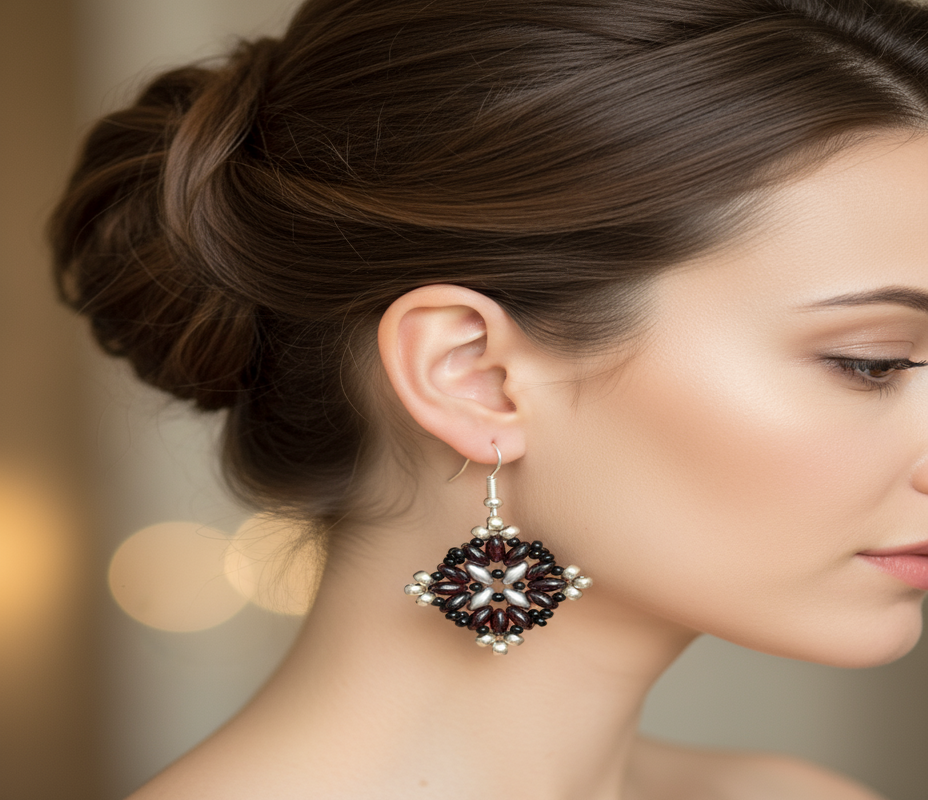 A rich, moody pair of earrings handcrafted for those who love statement jewelry with edge. These earrings feature deep garnet red petals surrounded by black and silver, creating a radiant floral pattern with dimensional texture and sparkle. Lightweight and dramatic, they’re perfect for evening wear, autumn wardrobes, or adding depth to minimalist looks. Whether you’re heading to a gallery opening or a dinner downtown, Midnight Ember brings just the right amount of dark glamour.