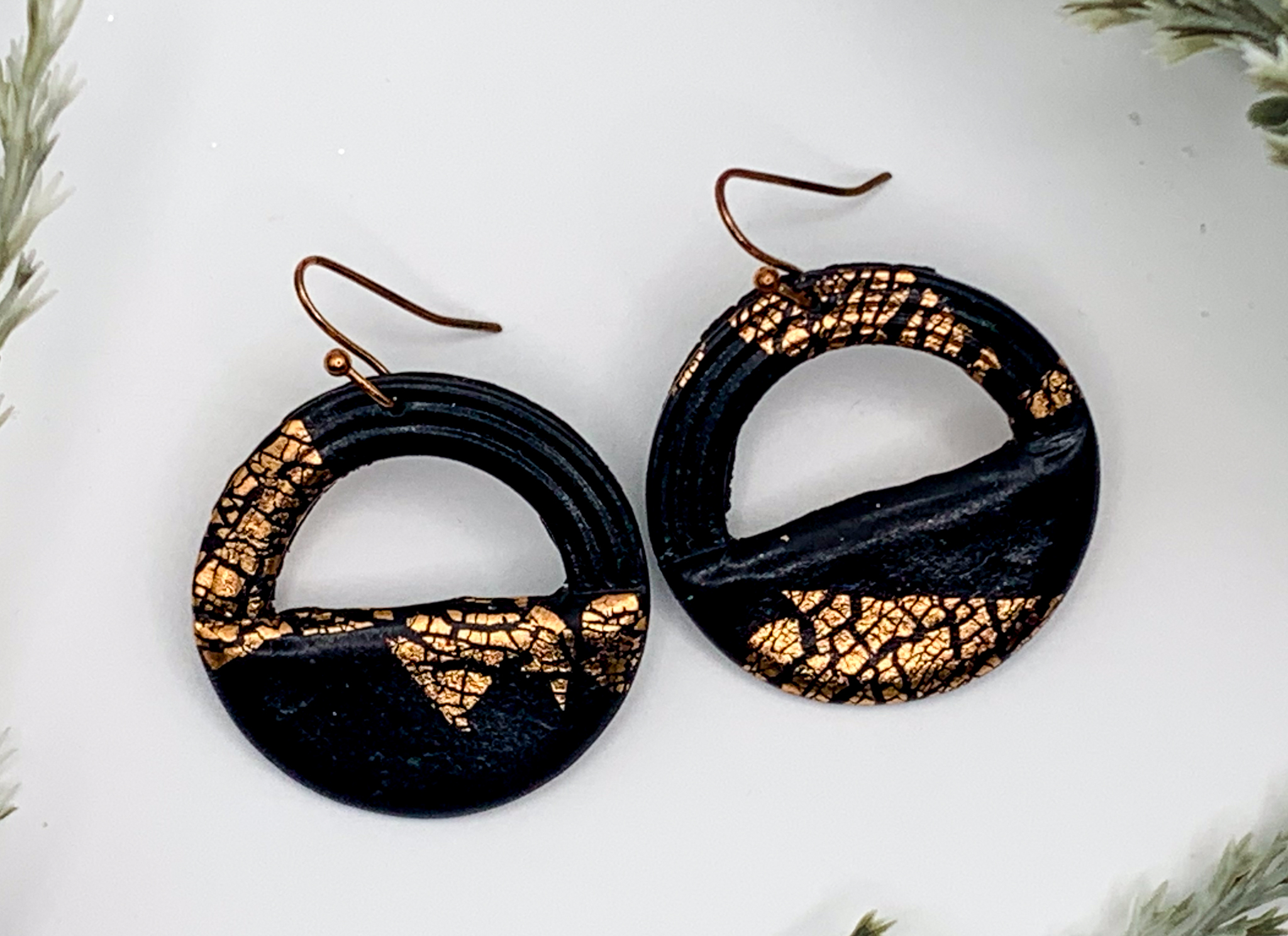 Bold and mysterious! These black polymer clay hoops feature a cutout design with golden foil accents for a luxe, modern vibe. Perfect for making a statement without saying a word.