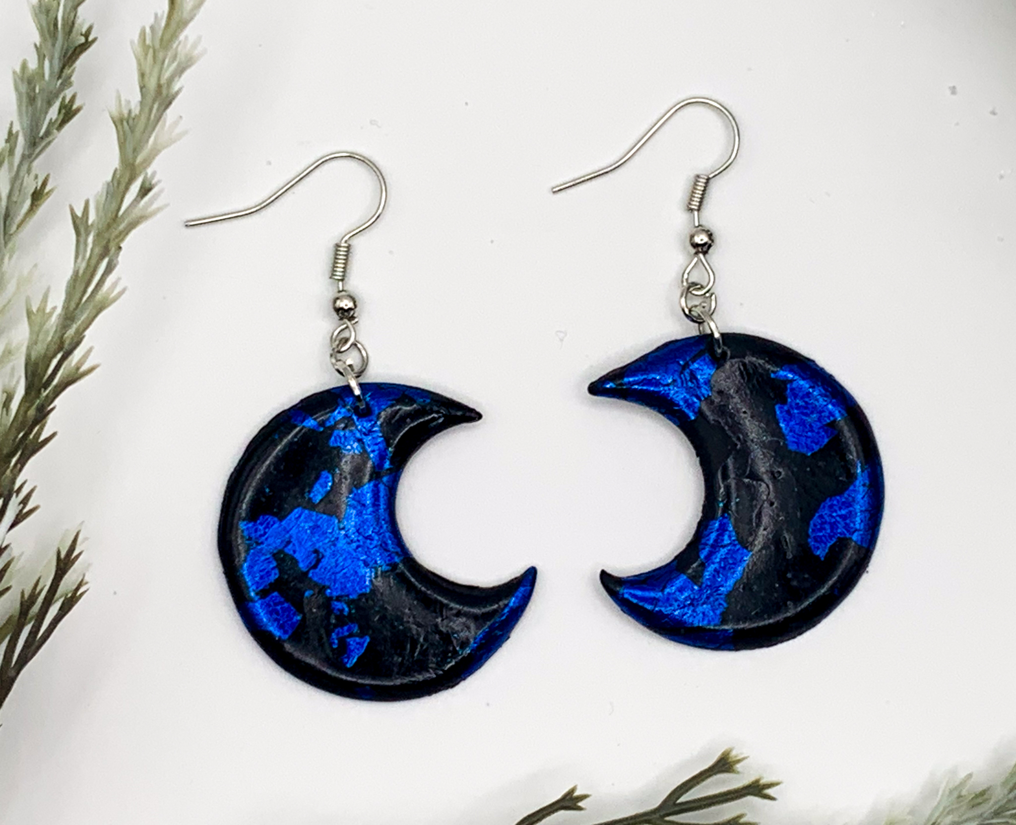 Celestial vibes meet bold color! These crescent moon earrings feature a black base with vibrant cobalt foil accents for a dreamy, cosmic look.