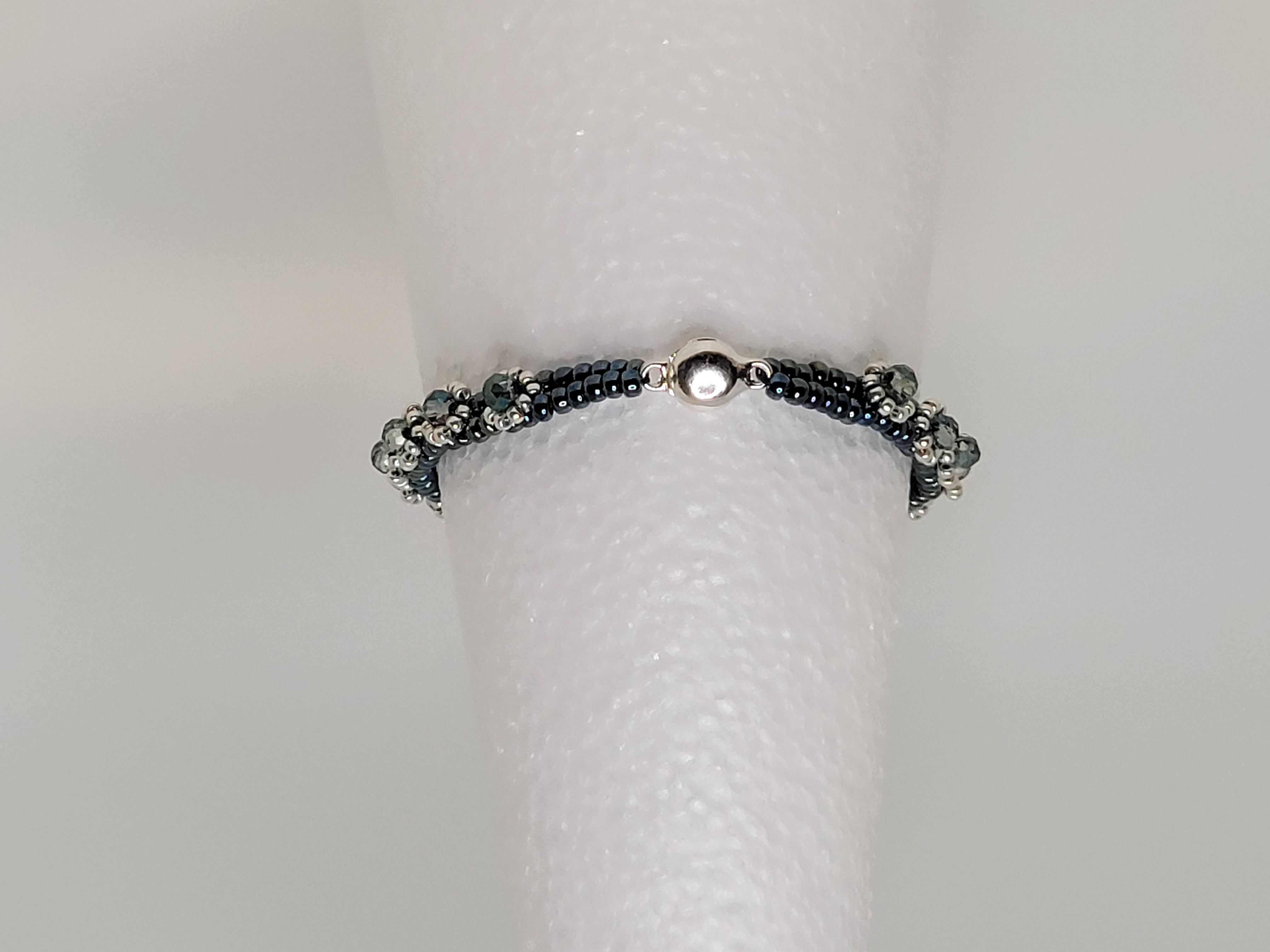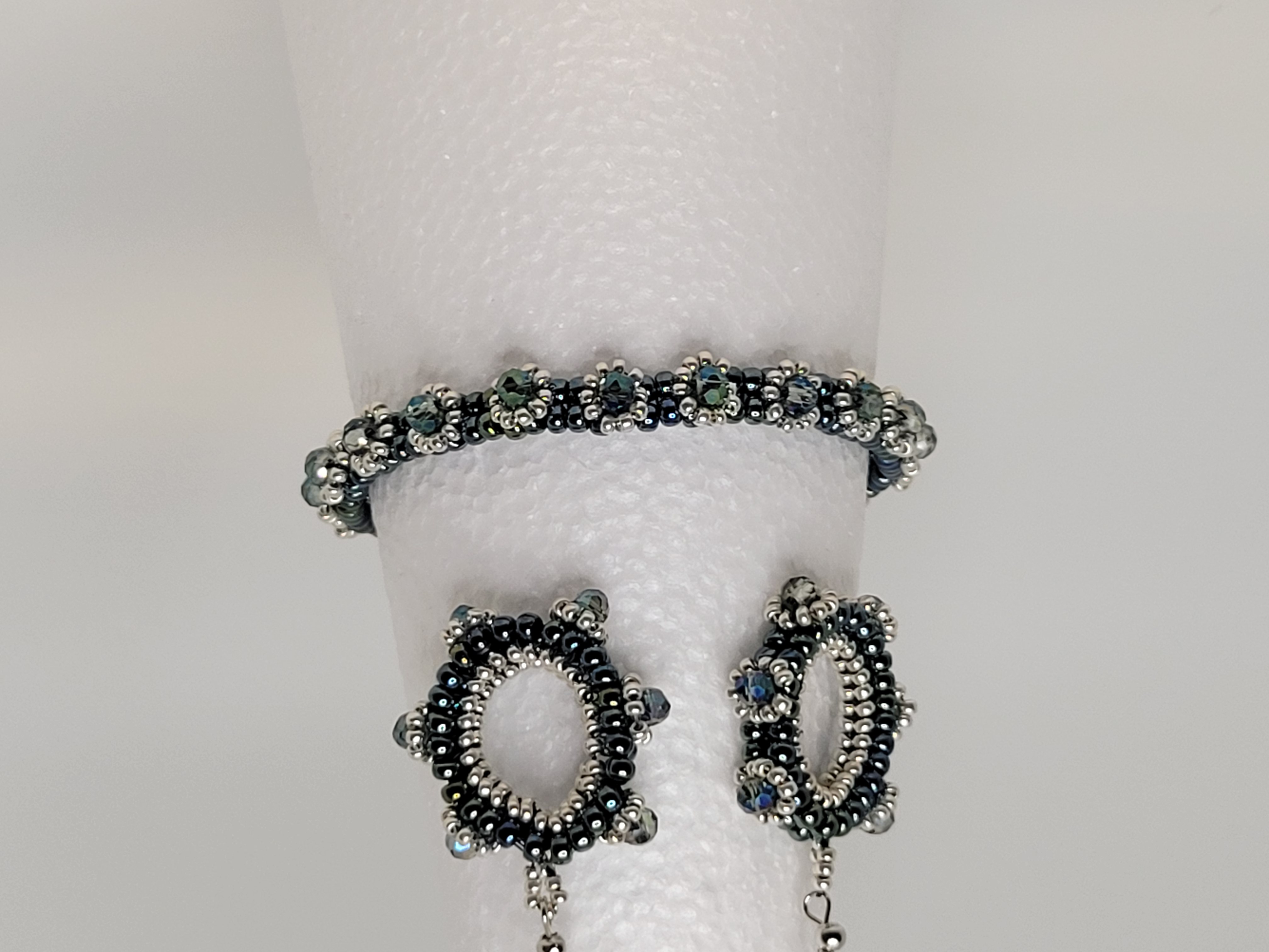 Midnight Tides is a coordinated bracelet and earrings set built around deep blue and steel-toned seed beads, accented with shimmering blue crystal details that catch the light without overpowering the design.